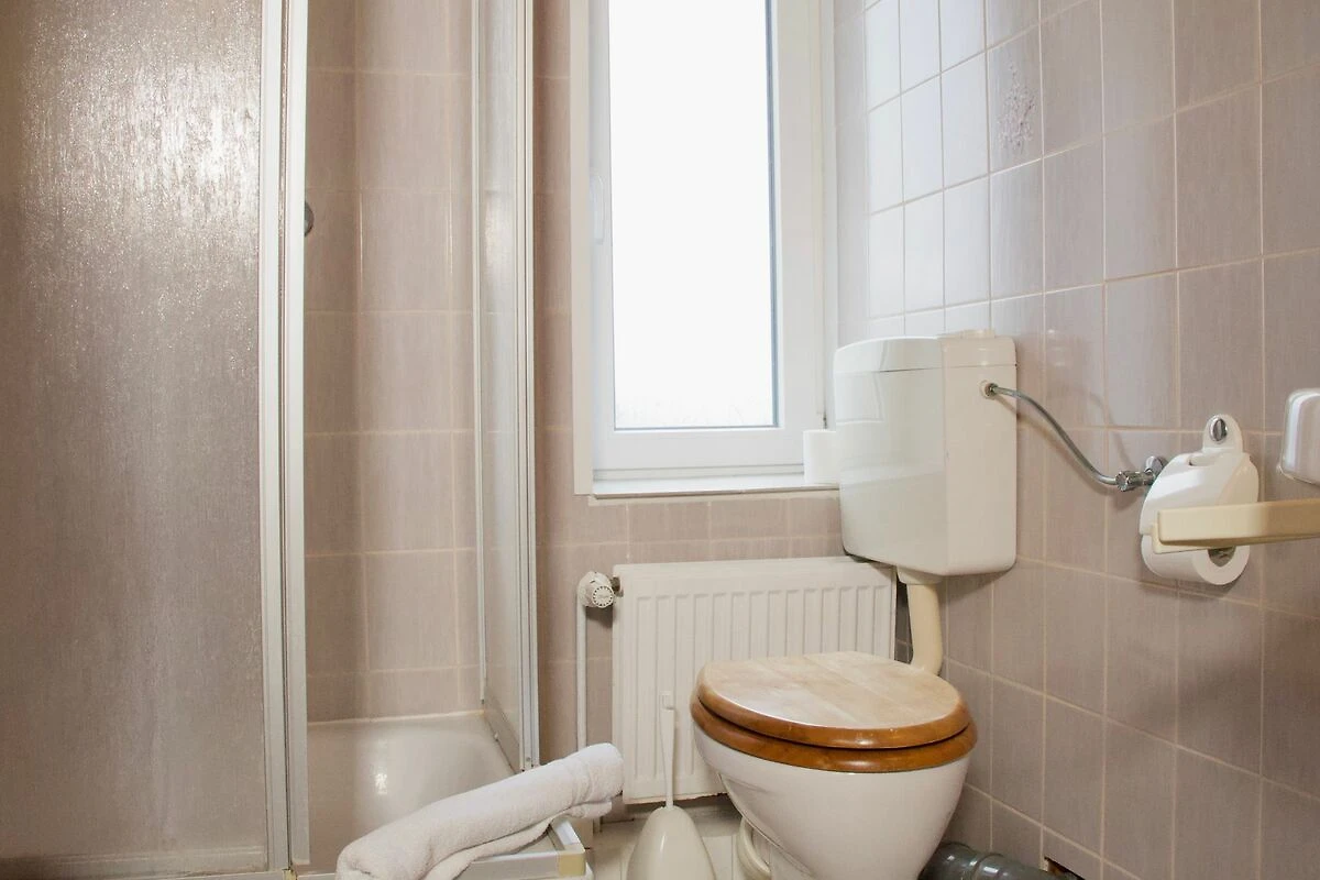 Das frisch renovierte Duschbad ist in ruhigen, natürlichen Farbtönen gehalten und mit einer Handtuchheizung ausgestattet.