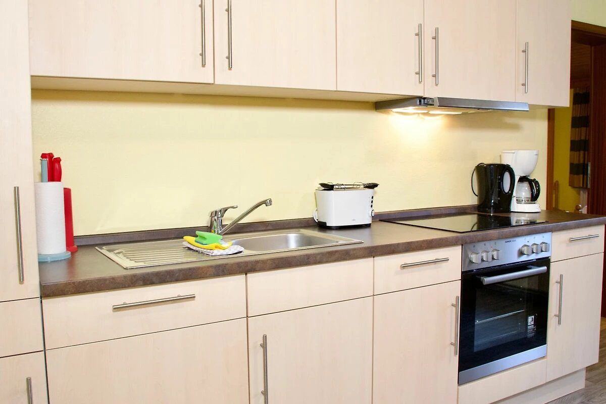 Die Küche bildet einen zentralen Bereich der Wohnung. Sie ist hell gestaltet, lässt keine Wünsche offen und verfügt über einen Esstisch, der sich ideal für gemeinsame Mahlzeiten oder ausgedehnte Spieleabende eignet. Ein Geschirrspüler, eine Kaffeemaschine sowie eine Gefriermöglichkeit stehen für die Selbstversorgung im Urlaub bereit. Ein grosses Fenster sorgt für viel Tageslicht und unterstreicht die freundliche Wirkung des Raumes.