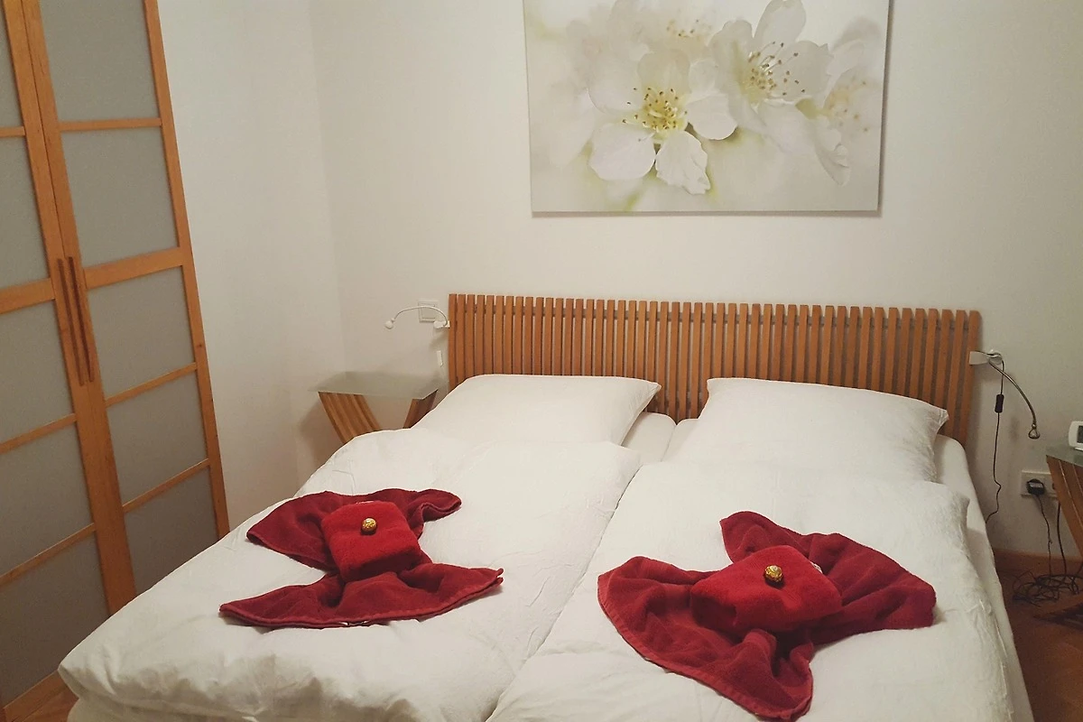 Im Schlafzimmer befindet sich ein Doppelbett mit grossem Eckschrank, Liegefläche 200x180cm. Für Kleinkinder wird kostenlos ein Kinderbett und -stuhl zugestellt.