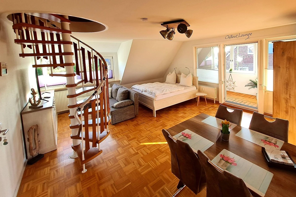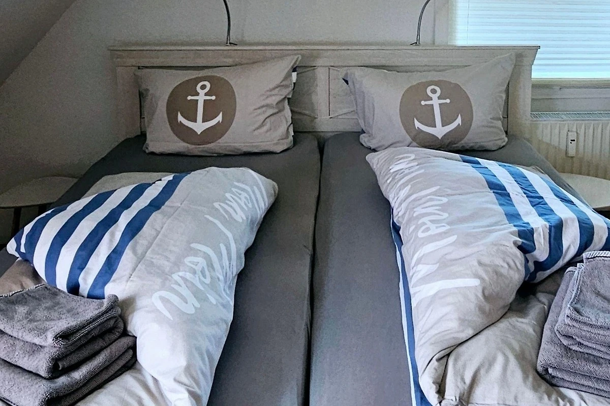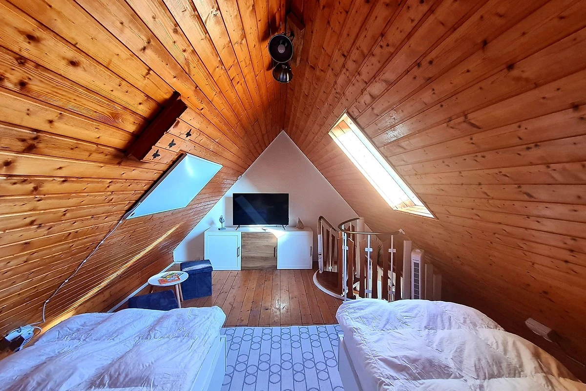 Über eine Wendeltreppe gelangen Sie in oberen Schlafbereich, ausgestattet mit 2 Einzelbetten, ebenfalls in Komforthöhe, einem SmartTv und einer Playstation 4. Von hier können Sie bei gutem Wetter einen Blick auf die Fehmarnsundbrücke werfen.