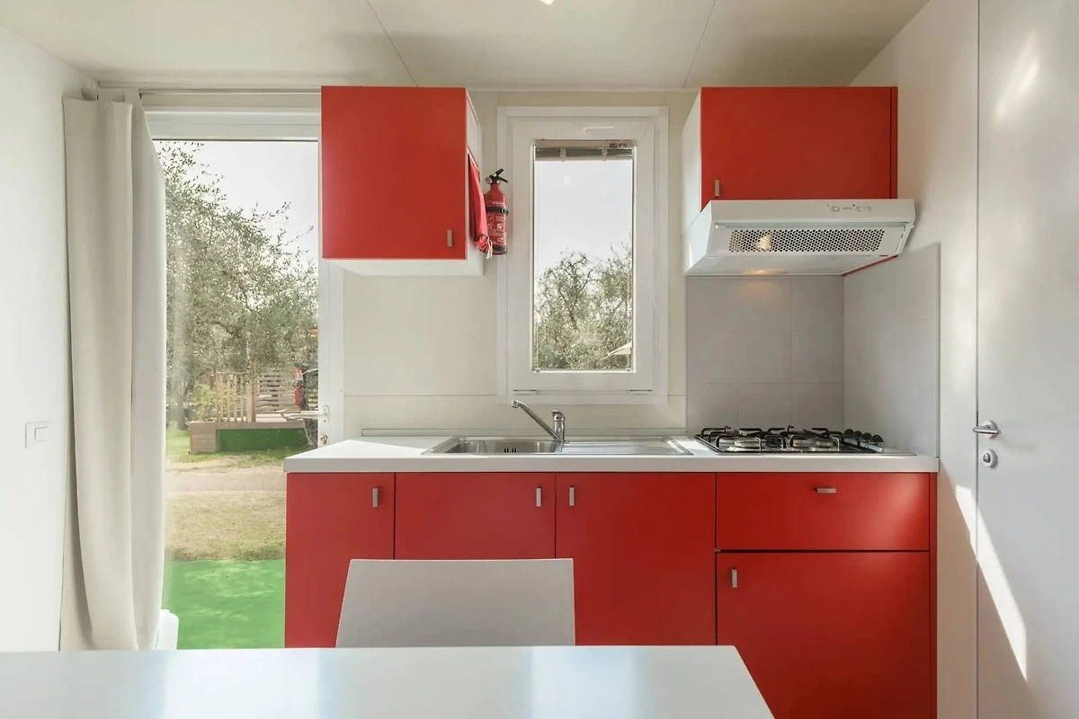Am Ufer des funkelnden Gardasees, eingebettet in die malerische Natur von Camping Fontanelle, erwartet dich unser liebevoll eingerichtetes Mobilhome – ein Ort, an dem jeder Tag zum kleinen Urlaubswunder wird. Stell dir vor, wie du morgens die Tür öffnest und die warme italienische Sonne hereinlädt, während eine sanfte Brise den Duft von Zypressen und Olivenbäumen herüberträgt. In deinem gemütlichen Rückzugsort findest du zwei behagliche Schlafzimmer – eines mit einem komfortablen Doppelbett für entspannte Nächte und eines mit zwei Einzelbetten sowie einem praktischen Hochbett, ideal für Familien oder Freunde, die zusammen wertvolle Zeit verbringen möchten. Nach einem sonnigen Tag lädt der große Pool der Anlage dazu ein, einzutauchen und zu genießen, während der Blick über die umliegenden Hügel schweift. Nur wenige Schritte entfernt eröffnet sich die Schönheit des Gardasees: charmante Orte wie Sirmione mit seiner berühmten Scaligerburg und den Grotten des Catull, die romantischen Gassen von Desenzano oder das historische Salò warten darauf, entdeckt zu werden. Ob du über die Uferpromenade schlenderst, eine Bootstour über das glitzernde Wasser machst, in Limone sul Garda die Zitronenhaine bestaunst oder bei einer Wanderung auf den Monte Baldo atemberaubende Panoramaausblicke erlebst – jeder Moment wird zu einer Erinnerung, die bleibt. Und am Abend, wenn der Himmel in warmen Farben leuchtet, kehrst du in dein Mobilhome zurück, wo Ruhe, Geborgenheit und ein Hauch italienischer Leichtigkeit dich empfangen.