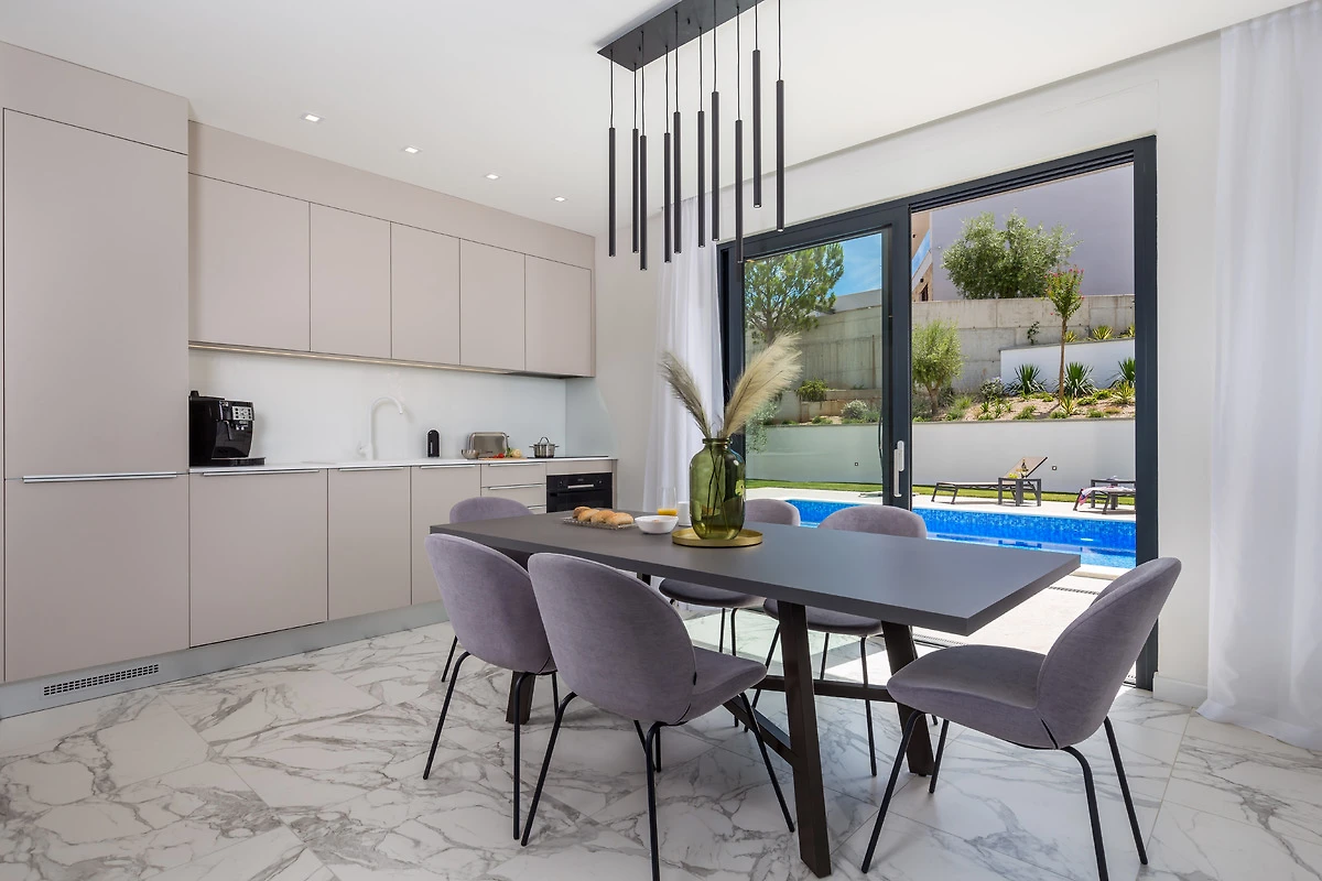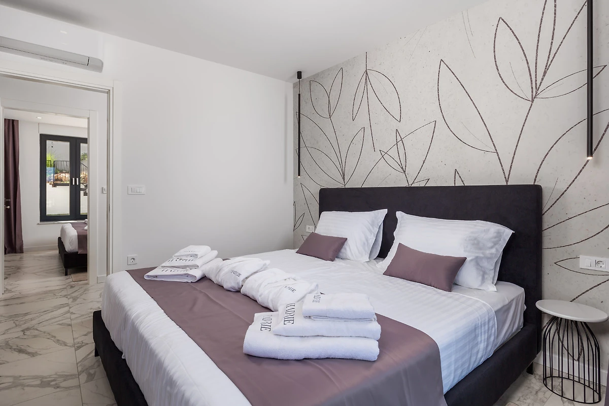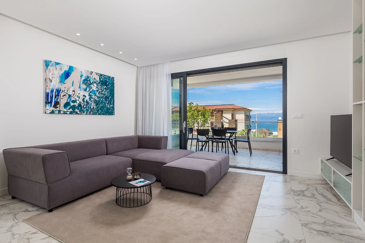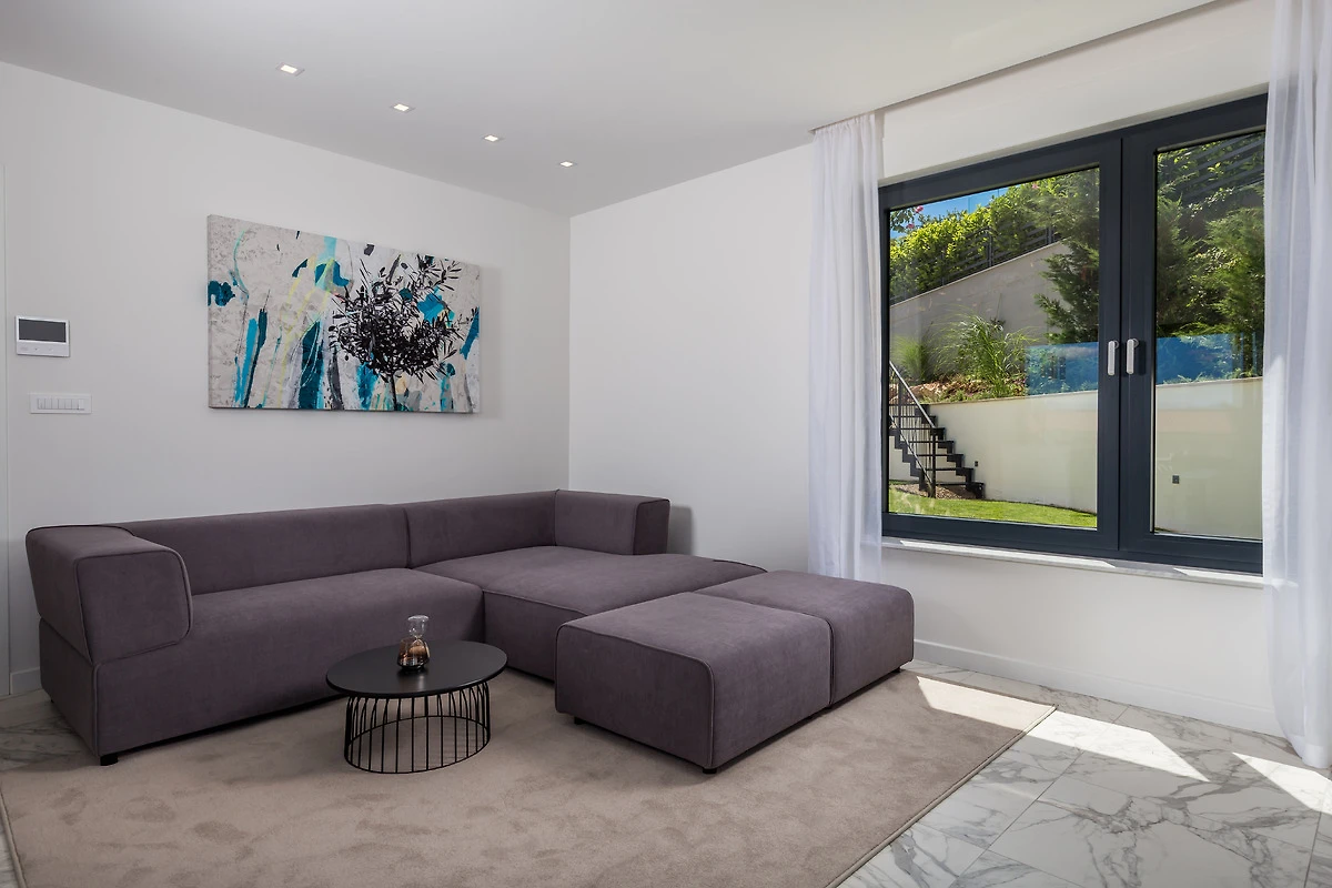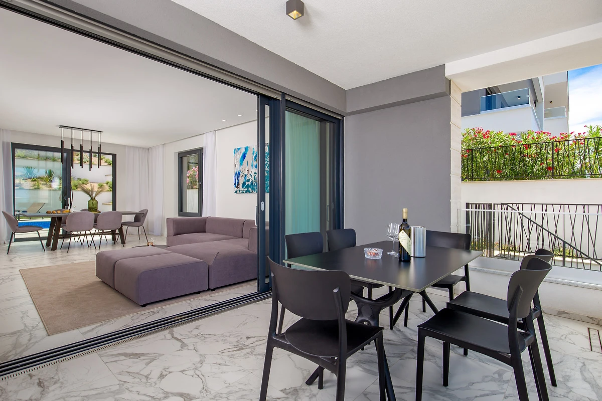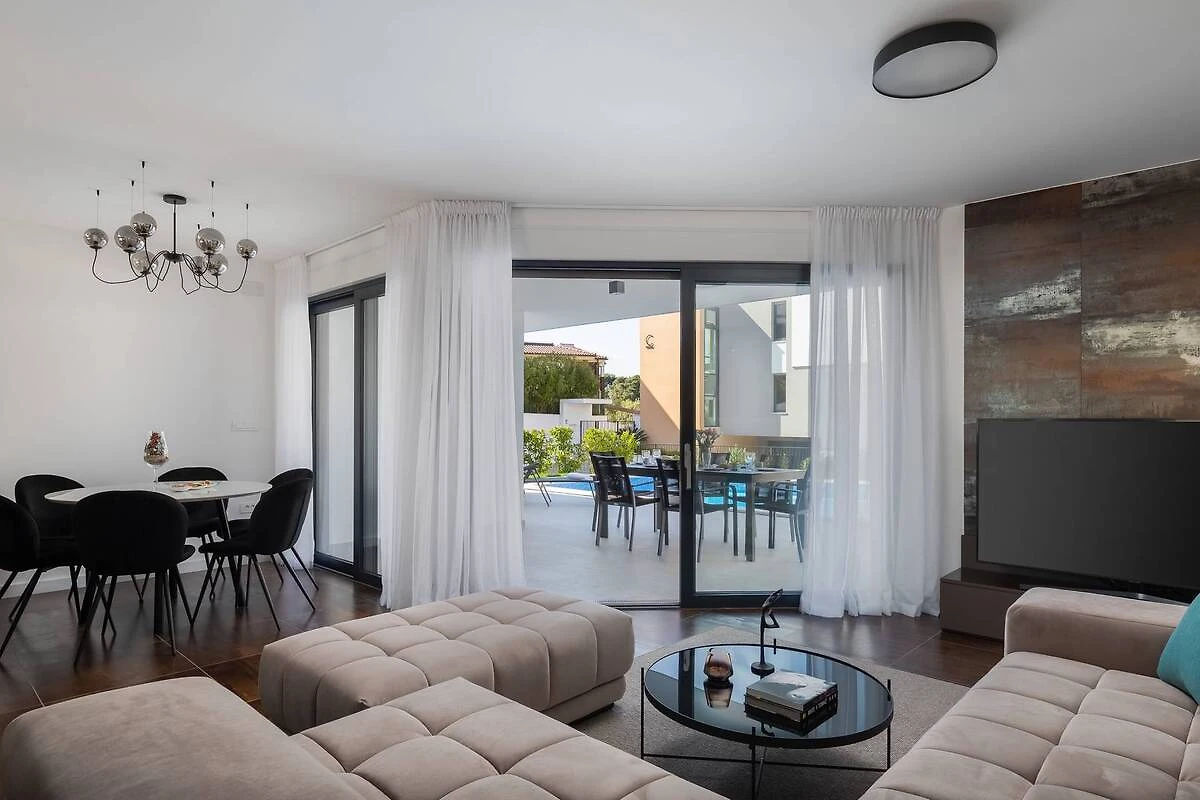 Das Apartment ist geräumig, hell und durchdacht gestaltet und bietet höchsten Komfort sowie eine unbeschwerte Unterkunft für bis zu 5 Personen, was es zur idealen Wahl für Familien oder kleinere Gruppen macht. Das großzügige und modern eingerichtete Wohnzimmer mit gemütlicher Sitzecke ist der perfekte Ort für entspannte Abende, familiäre Zusammenkünfte oder gemütliches Fernsehen. Vom Wohnbereich aus gelangen Sie direkt auf die Terrasse oder Veranda, wo Sie Ihr Frühstück an der frischen Luft, einen Nachmittagskaffee oder entspannte Abende mit Blick auf Ihren privaten Pool genießen können.