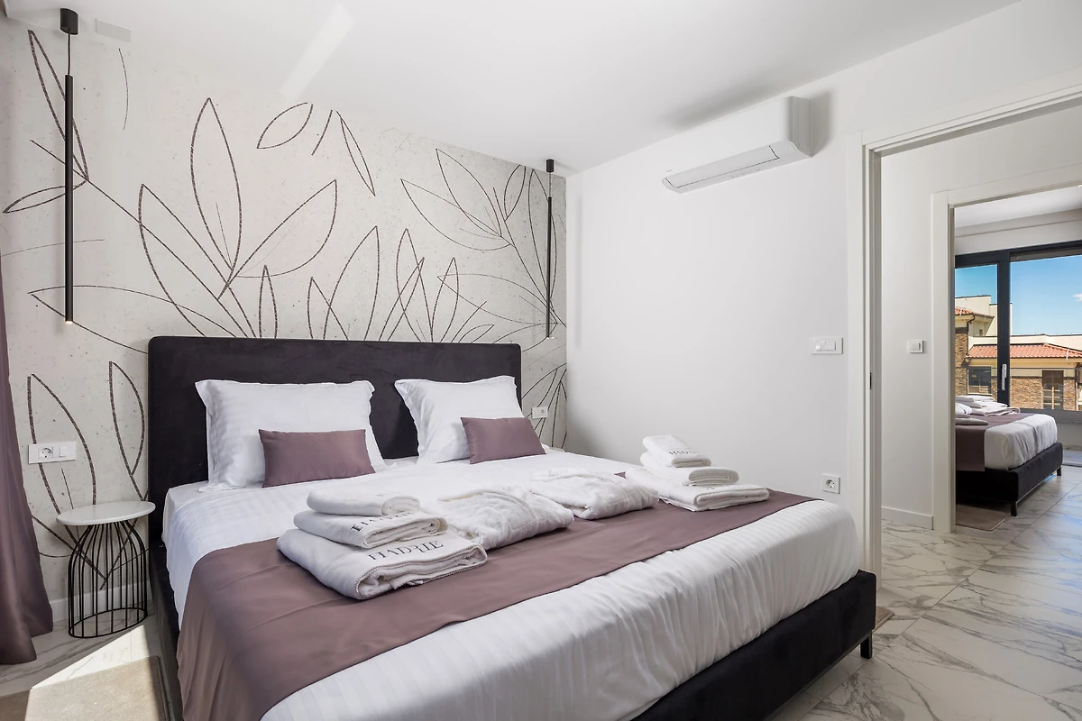 Das Apartment verfügt über 2 separate, komfortable Schlafzimmer, die jeweils mit Klimaanlage und hochwertigen Betten ausgestattet sind und einen ruhigen, erholsamen Schlaf garantieren. Zusätzlich steht ein Zustellbett (1) zur Verfügung, das eine größere Flexibilität und eine komfortable Unterbringung für bis zu fünf Personen ermöglicht.