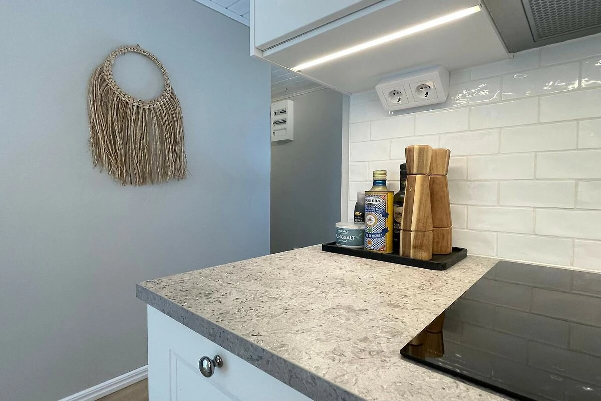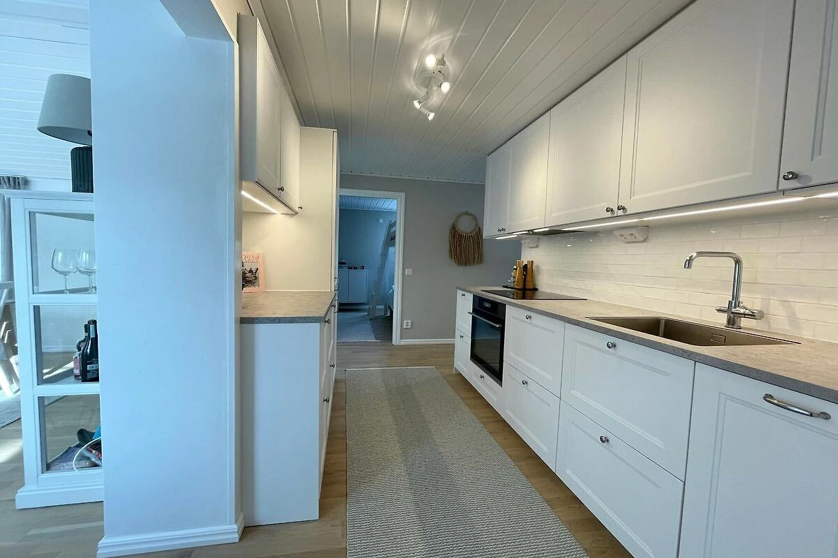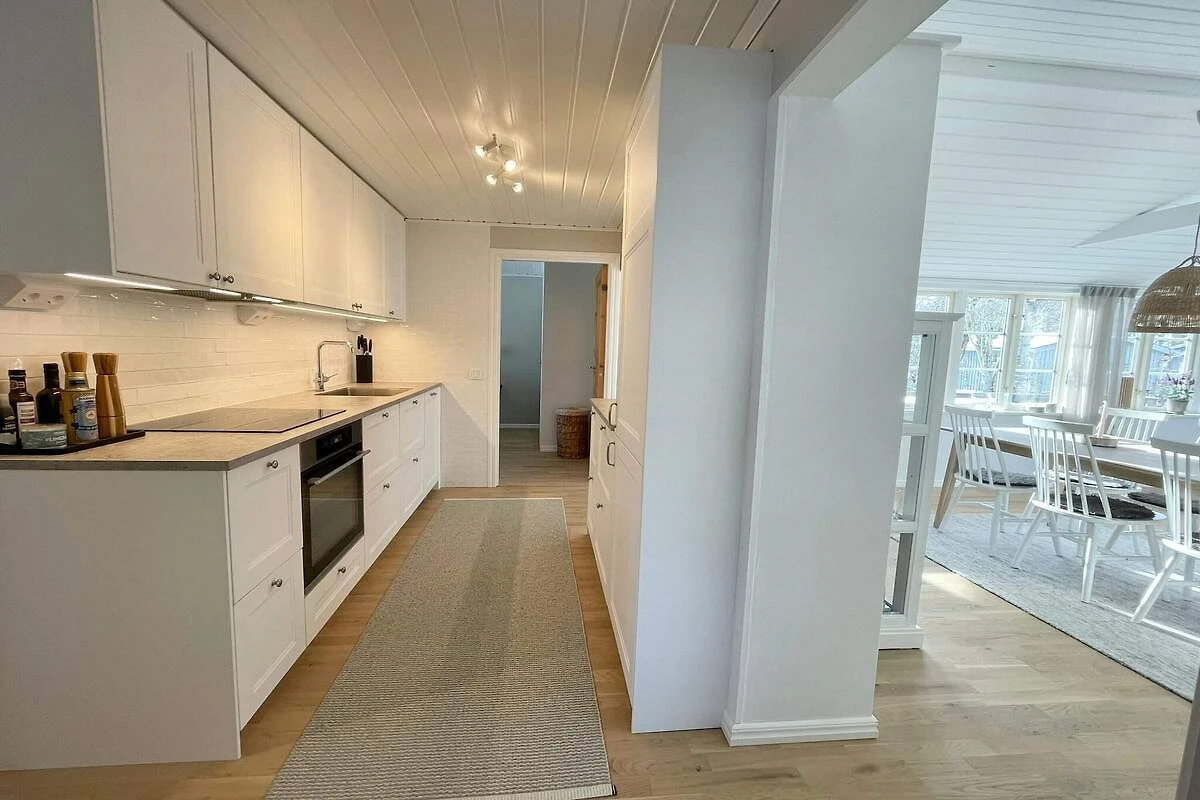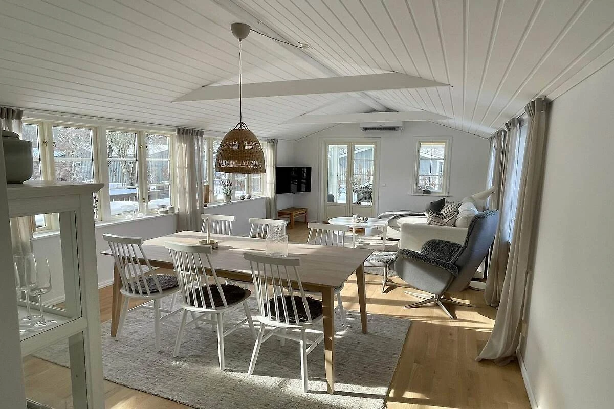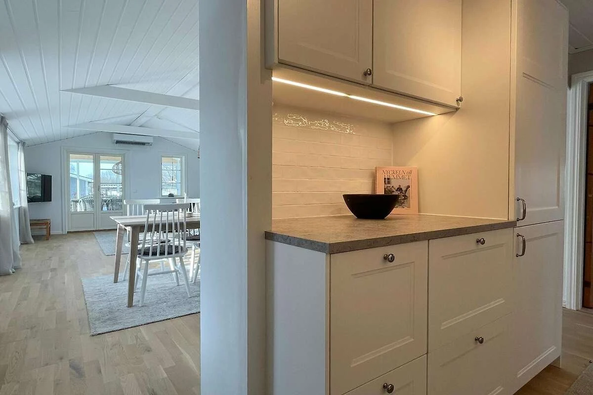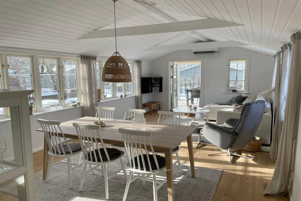 , Küche(Herd(Induktion), Kaffeemaschine, Backofen, Mikrowelle, Spülmaschine, Kühl-/Gefrierkombination), Wohn-/Schlafzimmer(TV(schwedische Fernsehsender)), Schlafzimmer(Doppelbett), Schlafzimmer(4x Etagenbett), Badezimmer(Trockner, Waschbecken, Dusche, Toilette, Waschmaschine), Balkon, Heizung(elektrisch), Garten, Gartenmöbel, Gartenmöbel, Parkplatz, Liegestühle, Luft-Luft-Wärmepumpe