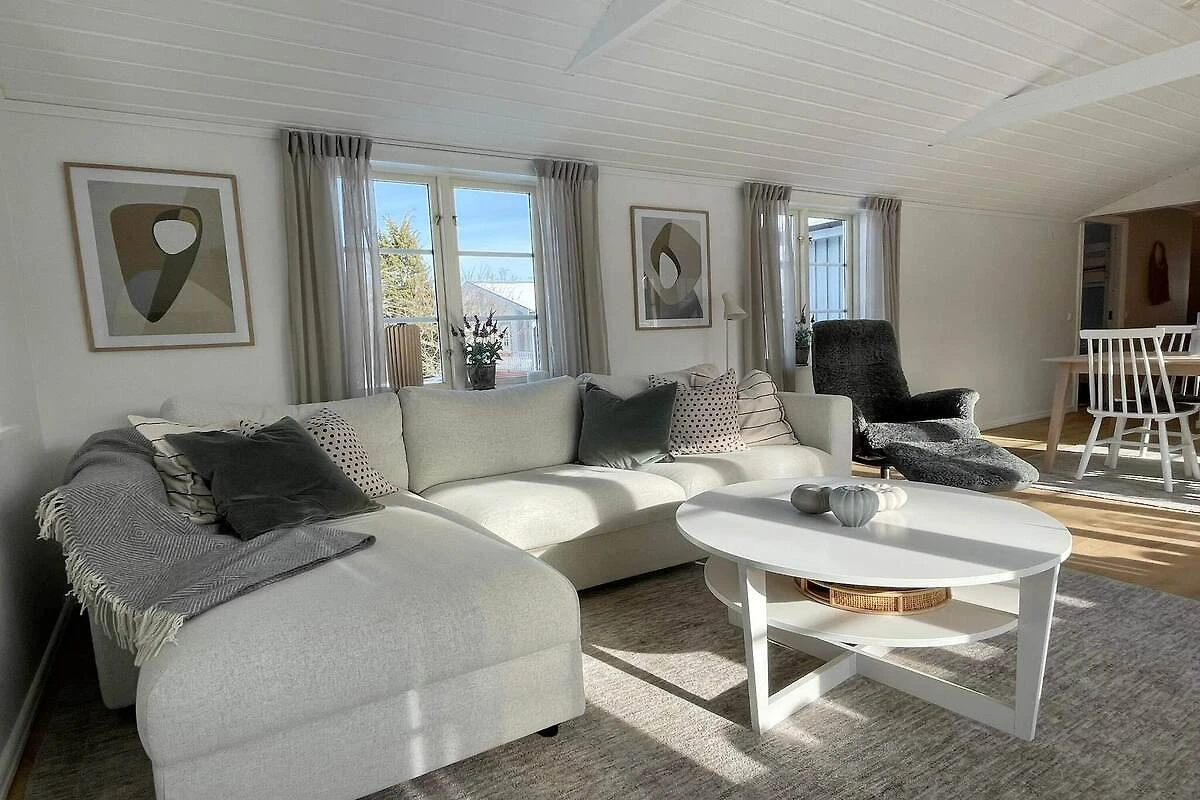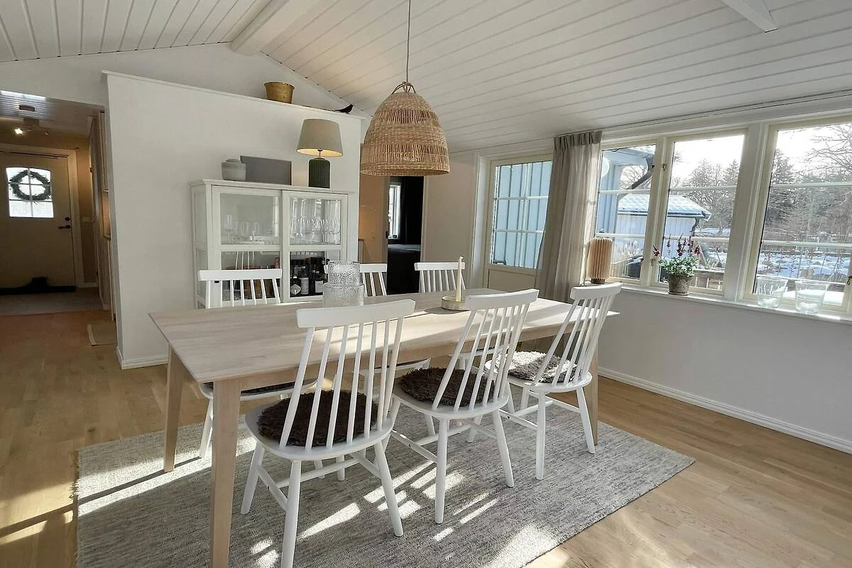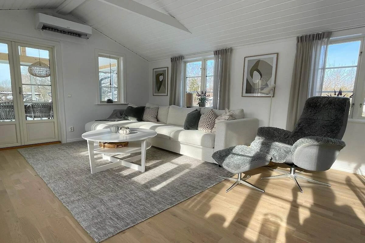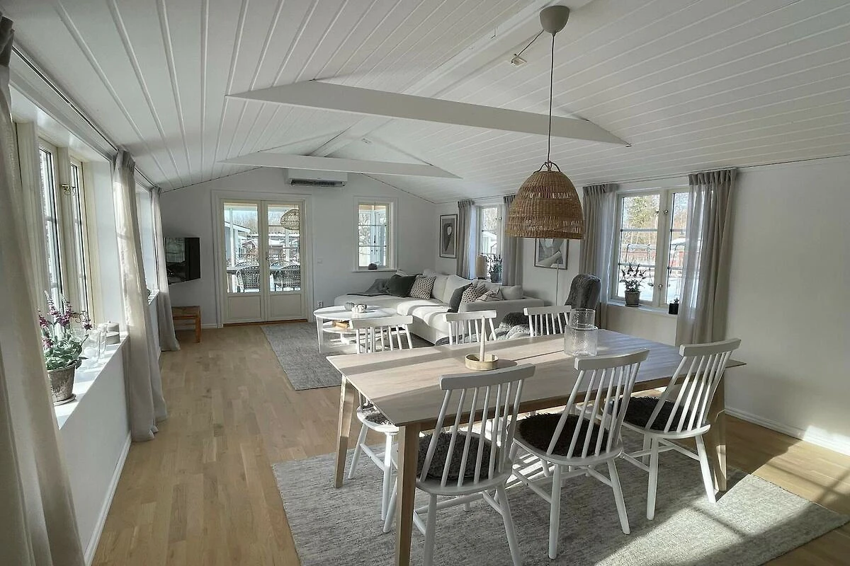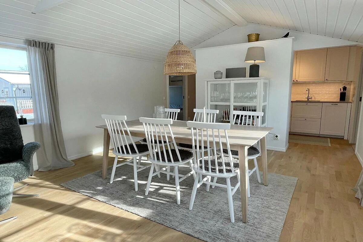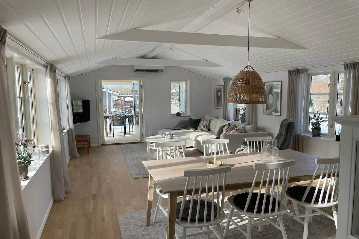 Willkommen in einem traumhaften Ferienhaus der Spitzenklasse in Strandlage – nur 440 Meter vom Strand entfernt. Ein kurzer Spaziergang über den Campingplatz von Saxnäs führt Sie zum beliebten Badebereich mit feinem Sandstrand und Badestegen – ideal für entspannte Tage in der Sonne und ein erfrischendes Bad. Hier können Sie die Ruhe genießen und gleichzeitig die vielfältigen Service- und Freizeitangebote des Campingplatzes nutzen. Es gibt Restaurants, einen Minimarkt und ein abwechslungsreiches Sommerprogramm mit Live-Musik, Yoga, Zirkeltraining und Fußball. Minigolf, Spielplätze, Fahrräder und Leihwagen, eine Mehrzweckhalle und ein Outdoor-Fitnessstudio bieten Unterhaltung für jedes Alter. Das Ferienhaus besticht durch einen schönen, offenen Grundriss, bei dem Küche und Wohnzimmer in eine gesellige und einladende Atmosphäre übergehen. Die moderne Küche bietet hohen Komfort. Im Wohnzimmer befinden sich ein schöner Essbereich und eine bequeme Sofaecke vor dem Fernseher. Es gibt zwei schöne Schlafzimmer, eines davon mit einem Doppelbett. Das zweite Schlafzimmer ist mit einem Doppelbett und zwei darüber liegenden Einzelkojen ausgestattet und somit ideal für Familien mit 2 Kindern. Das moderne Badezimmer verfügt über eine Waschmaschine mit integriertem Trockner für zusätzlichen Komfort während Ihres Aufenthalts. Draußen erwartet Sie eine große, einladende Terrasse mit Gartenmöbeln und Sonnenliegen – der perfekte Ort für den Morgenkaffee in der Sonne oder gemütliche Grillabende. Der fantastische Außenbereich mit hohen Decken und viel Platz verlängert den Sommer und bietet einen hellen und luftigen Treffpunkt bei jedem Wetter. Auf dem Grundstück befinden sich eine Schaukel und ein großes Trampolin für die Kinder. Bitte beachten Sie, dass Haustiere nicht erlaubt sind. Bitte bringen Sie Ihre eigene Bettwäsche und Handtücher mit. Keine Vermietung an Jugendgruppen erwünscht, Hier wohnen Sie in einem modernen und komfortablen Haus in bester Lage – in der Nähe von Meer, Strand und Freizeitmöglichkeiten. Ein perfekter Ort für unvergessliche Urlaubserinnerungen!