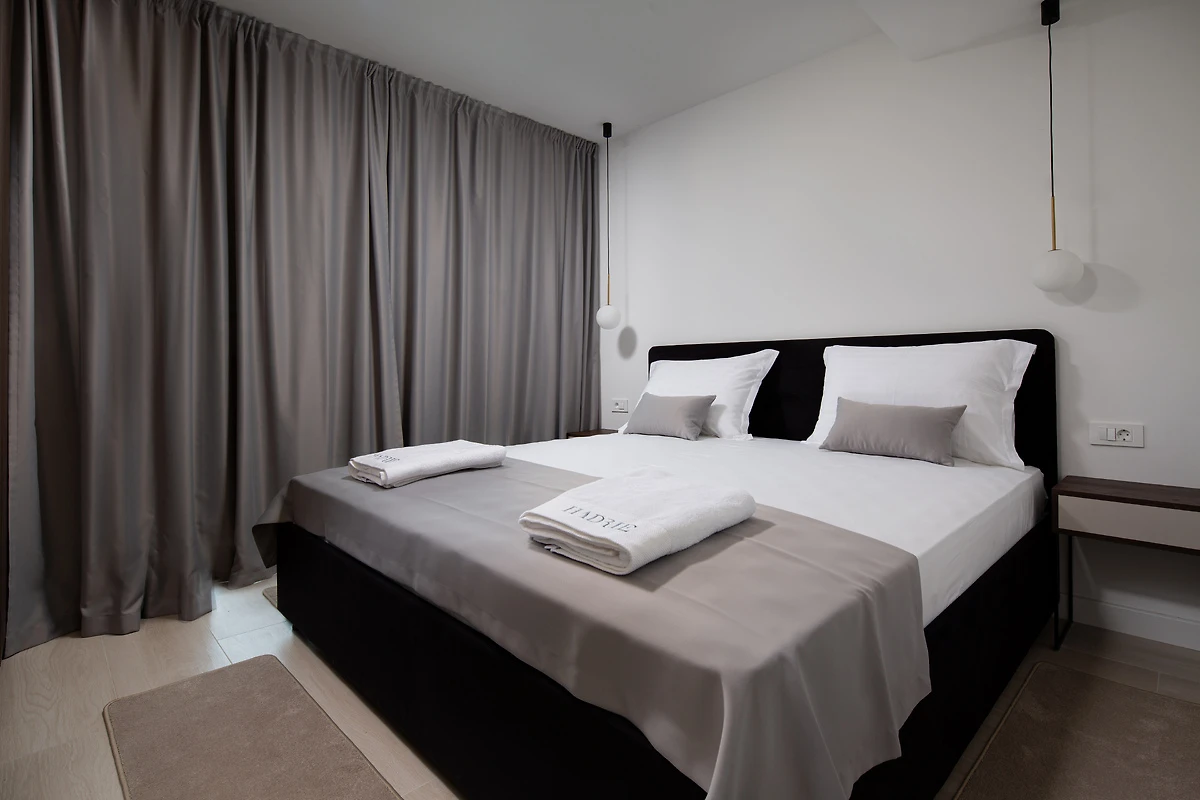 Es gibt zwei separate Schlafzimmer mit komfortablen Doppelbetten, ideal für Paare oder Familien. Außerdem gibt es zwei Badezimmer und eine separate Toilette, die Privatsphäre und Komfort für alle Gäste gewährleisten. Die Wohnung ist klimatisiert, verfügt über Zentralheizung, mehrere Fernseher, einen Safe, Haartrockner und andere moderne Annehmlichkeiten. Der Wohnbereich ist mit bequemen Sitzgelegenheiten ausgestattet, und der Esstisch ermöglicht angenehme gemeinsame Mahlzeiten. Das gesamte Ambiente spiegelt ein modernes, helles und luftiges Design wider, das Ästhetik und Funktionalität vereint und ein Gefühl von häuslicher Wärme vermittelt.