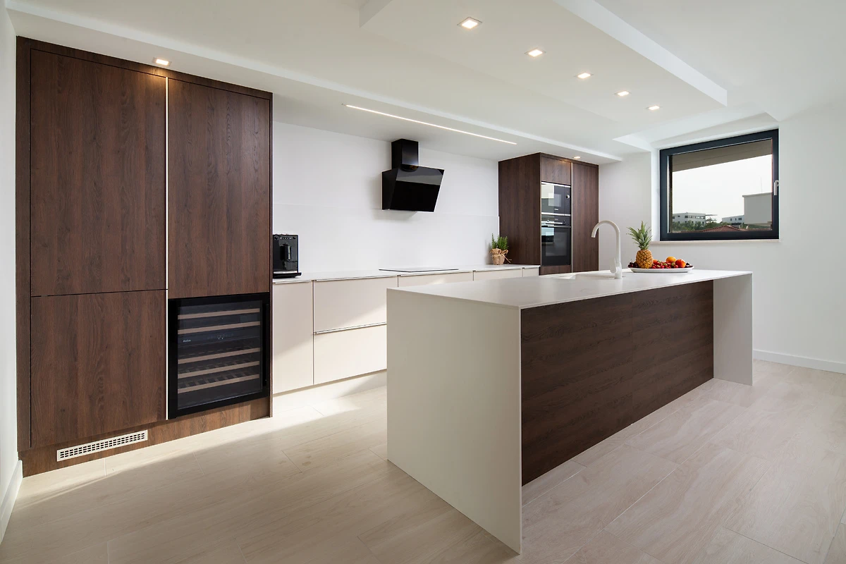 Der Innenraum des Apartments ist durchdacht gestaltet und bietet maximalen Komfort und Funktionalität. Das geräumige Wohnzimmer mit Essbereich und offener Küche bildet das Herzstück des Apartments und ist ideal für familiäre oder gesellschaftliche Zusammenkünfte. Die Küche ist vollständig mit hochwertigen Geräten ausgestattet, darunter Geschirrspüler, Kaffeemaschine, Backofen und Kühlschrank mit Gefrierfach, sodass die Zubereitung von Mahlzeiten wie zu Hause möglich ist.