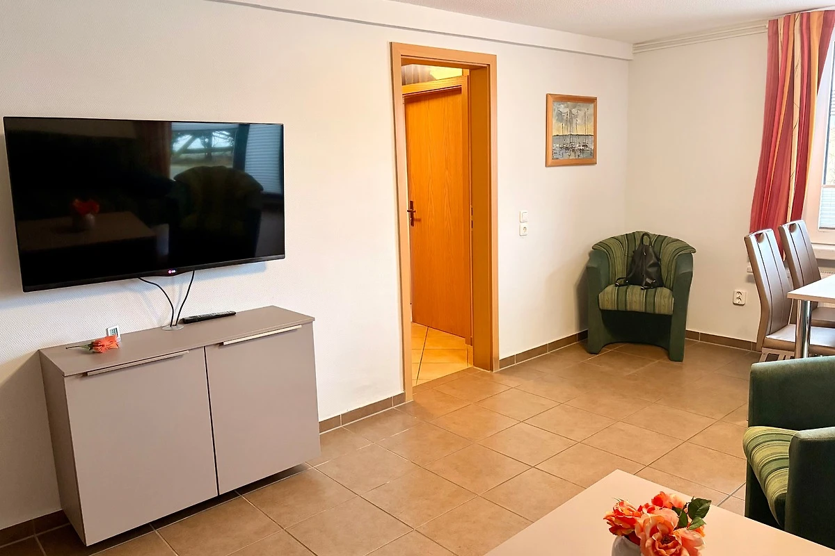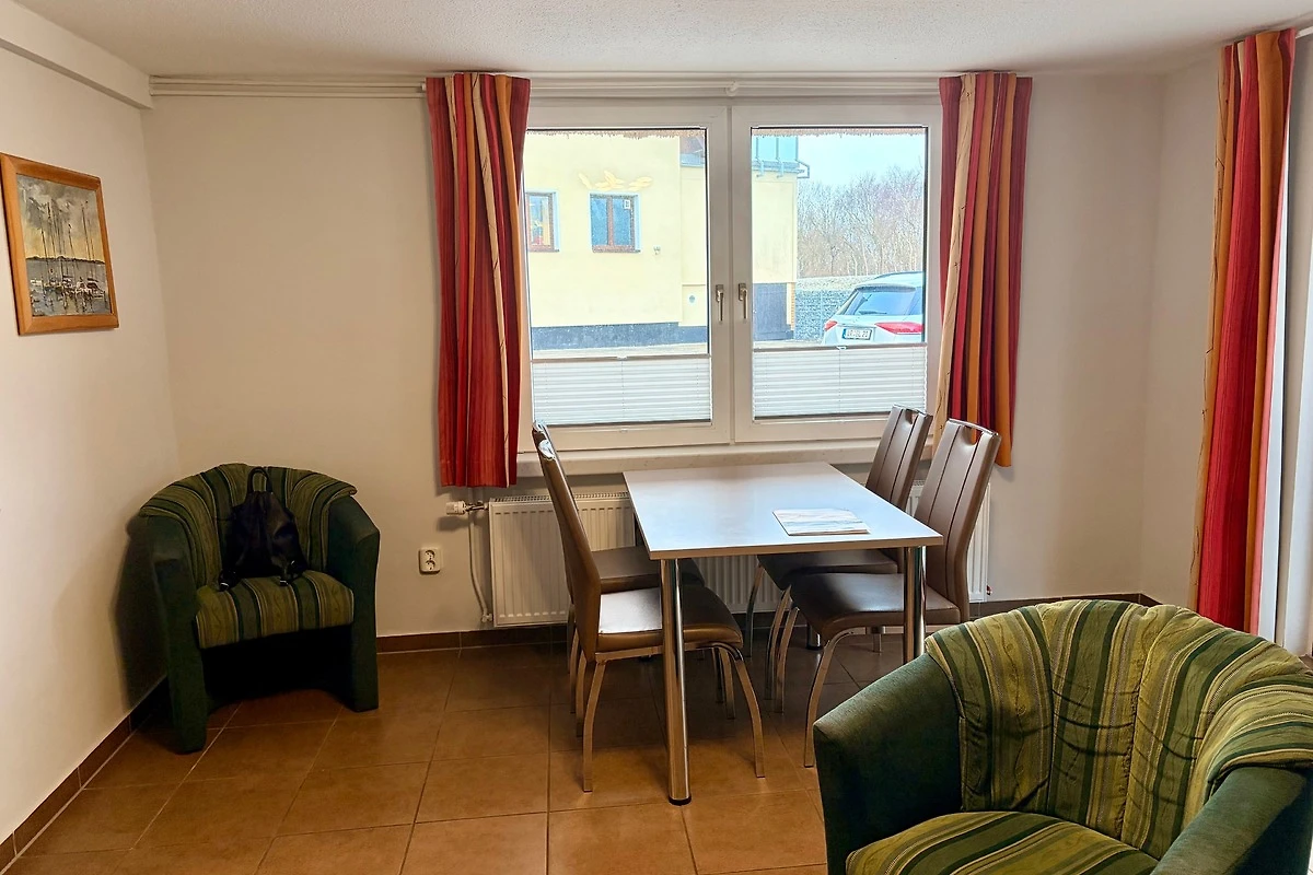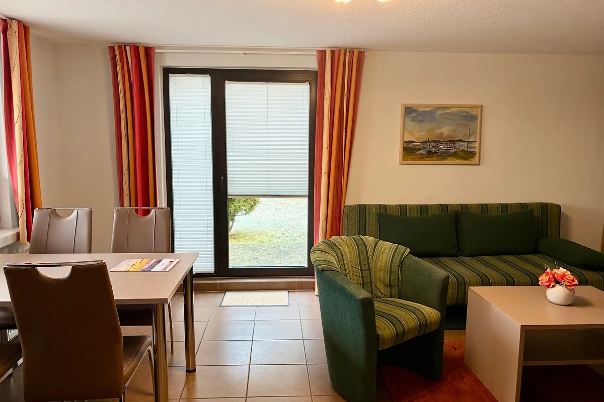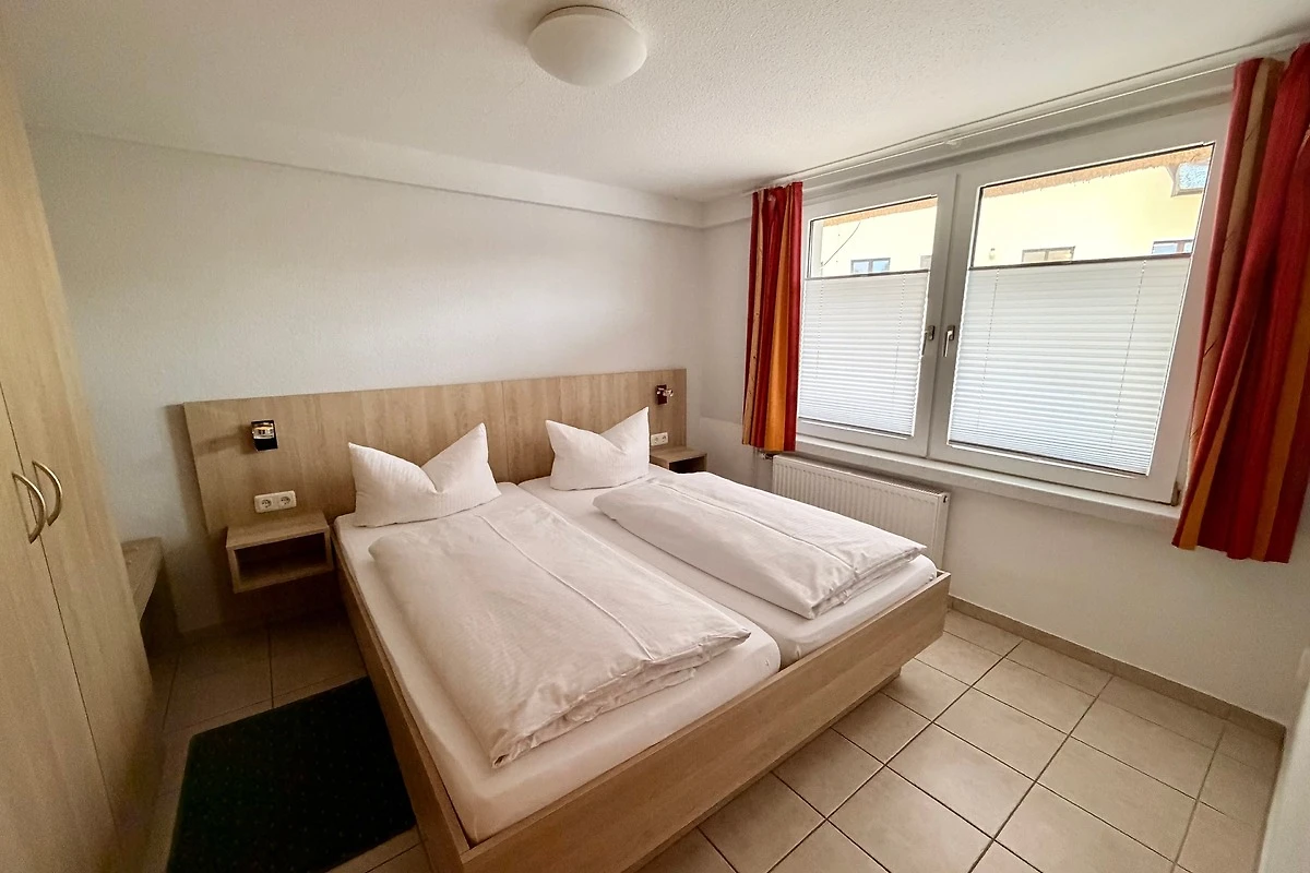 Die Wohnung befindet sich im Erdgeschoss und verfügt über einen Wohn- Essbereich mit integrierter Küchenzeile sowie zwei Schlafzimmer mit insgesamt drei Betten. Alle Fenster sind mit Fliegengittern und Plissees ausgestattet und sorgen für Komfort zu jeder Jahreszeit.
