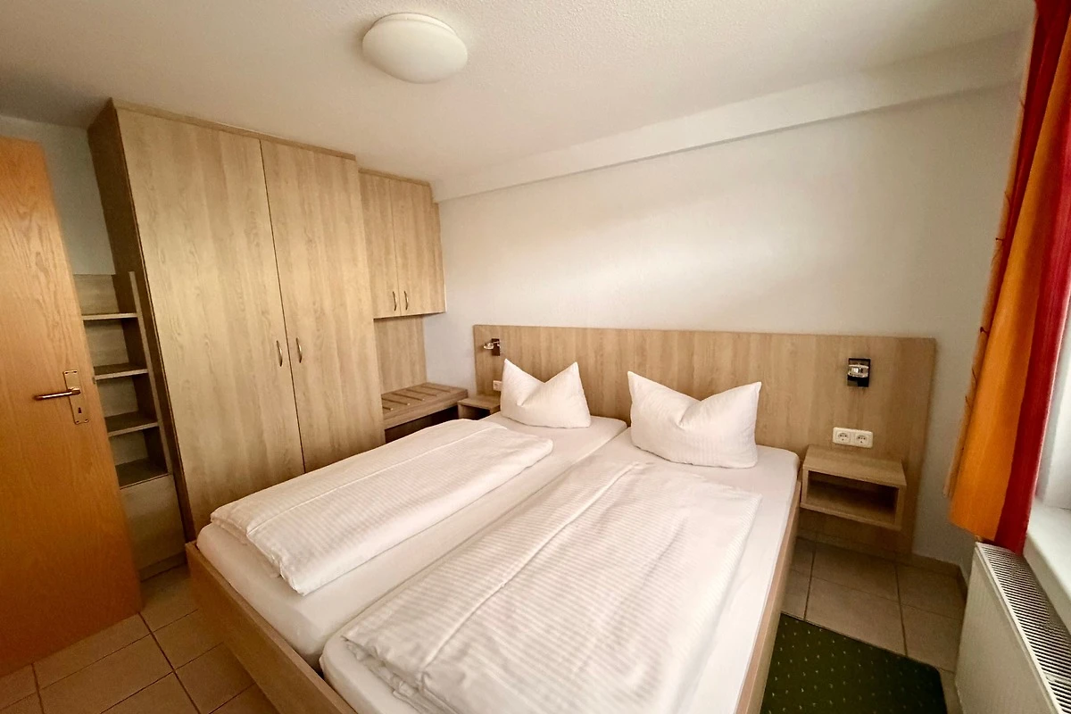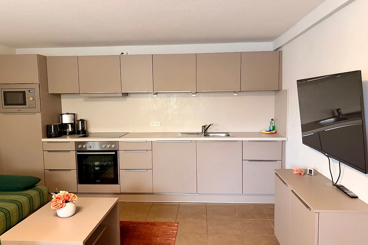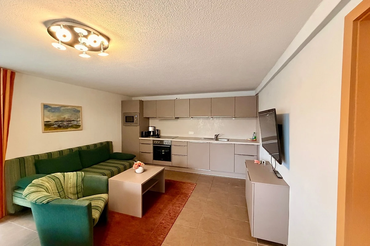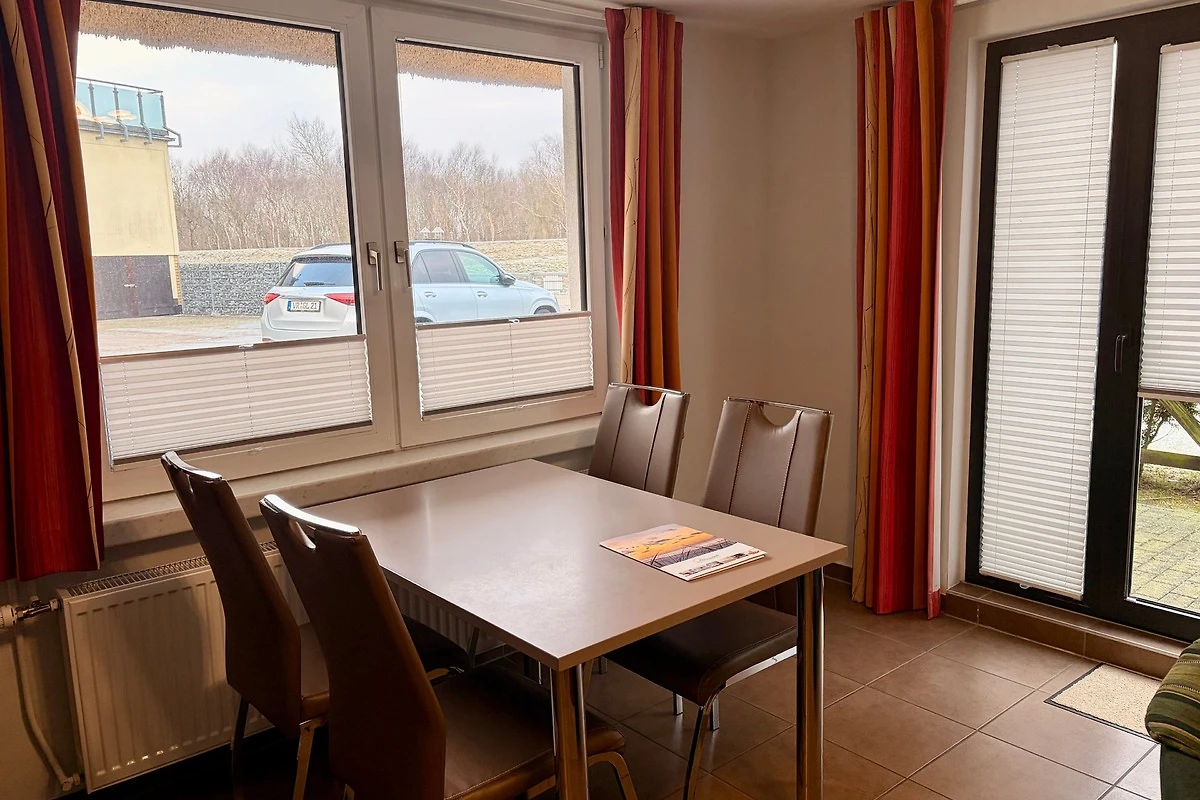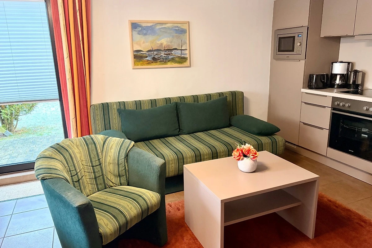 Die Wohnung befindet sich im Erdgeschoss und verfügt über einen Wohn- Essbereich mit integrierter Küchenzeile sowie zwei Schlafzimmer mit insgesamt drei Betten. Alle Fenster sind mit Fliegengittern und Plissees ausgestattet und sorgen für Komfort zu jeder Jahreszeit.