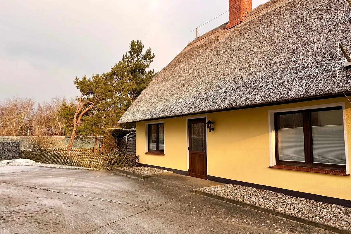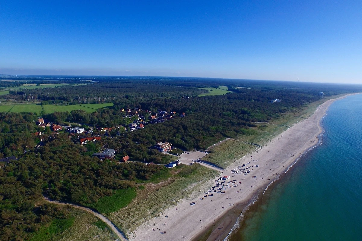 Die Ferienwohnung befindet sich in einem Schilfhaus, unmittelbar hinter dem Deich und einem Strandzugang zwischen den Ostseebädern Dierhagen und Wustrow innerhalb der Hotelanlage Ostseehotel Wustrow.
