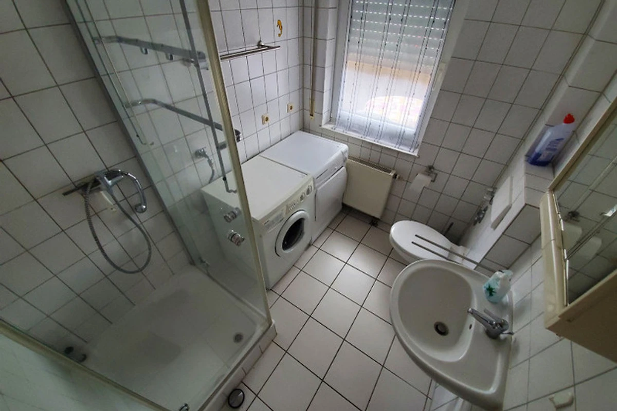 Im modernen, altweiss gefliesten Tageslicht-Duschbad mit Fön und Kosmetikspiegel stehen Ihnen Waschmaschine und Trockner, sowie Bügeleisen und -brett zur Verfügung.