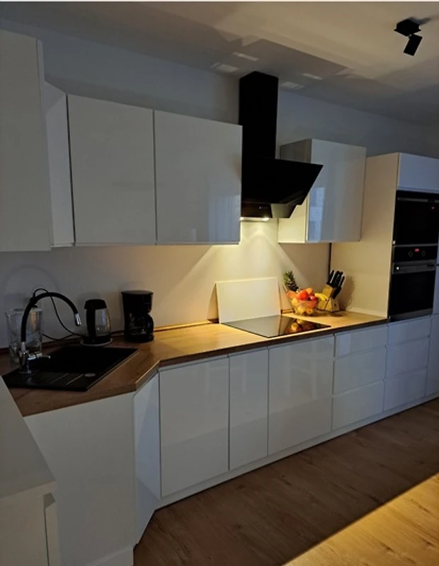 Die offene Küche ist mit einer Küchenzeile, Geschirrspüler,Herd,Backoffen, Mikrowelle, Wasserkocher und Kaffeemaschine ,Toster, Eierkocher bestens ausgestattet – ideal für kulinarische Erlebnisse im Urlaub. Frische Bettwäsche sorgt für einen erholsamen Schlaf, während TV und kostenfreies WLAN