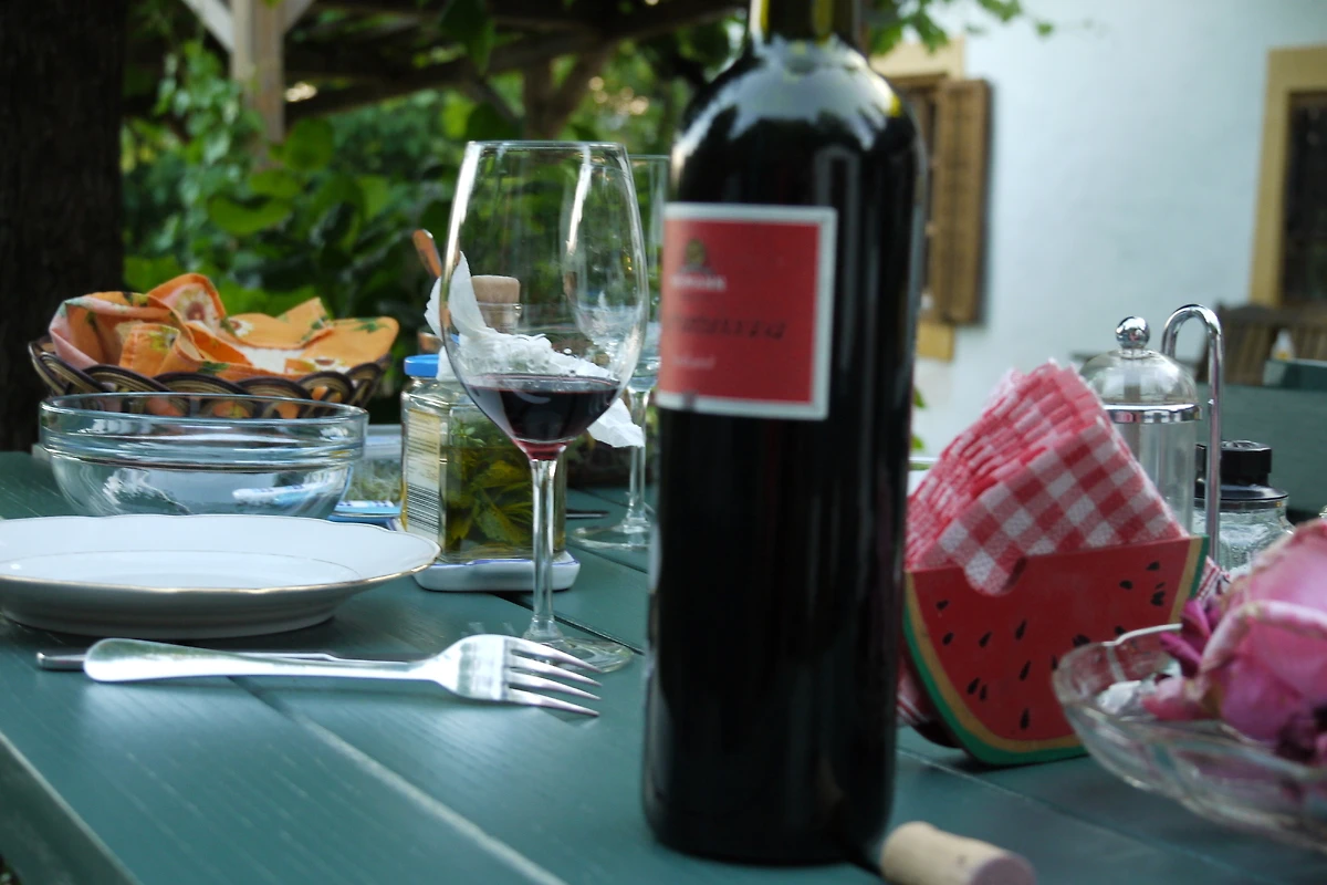 Zusätzlich gibt es unseren eigenen wunderschön gelegenen Weinberg mit traumhafter Aussicht ganz in der Nähe und daher auch eigenen Wein von historischen Rebstöcken.