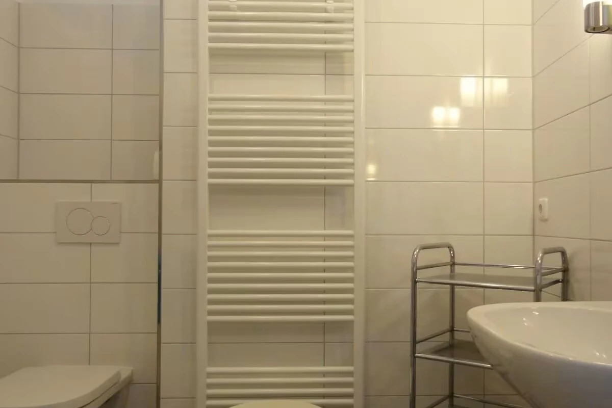 Das Badezimmer ist mit Dusche, Waschbecken, Föhn und Waschmaschine ausgestattet. Für Familien stehen ein Babybett und ein Hochstuhl bereit. Ein Bügeleisen sorgt für zusätzlichen Komfort.