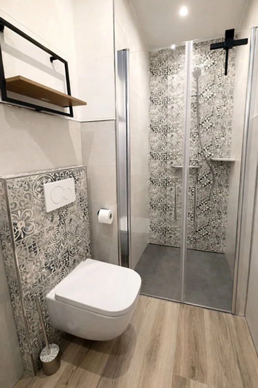 Das moderne Bad ist mit einer komfortablen Dusche und Föhn ausgestattet. Hier starten Sie frisch in den Tag oder entspannen nach einem langen Strandspaziergang.