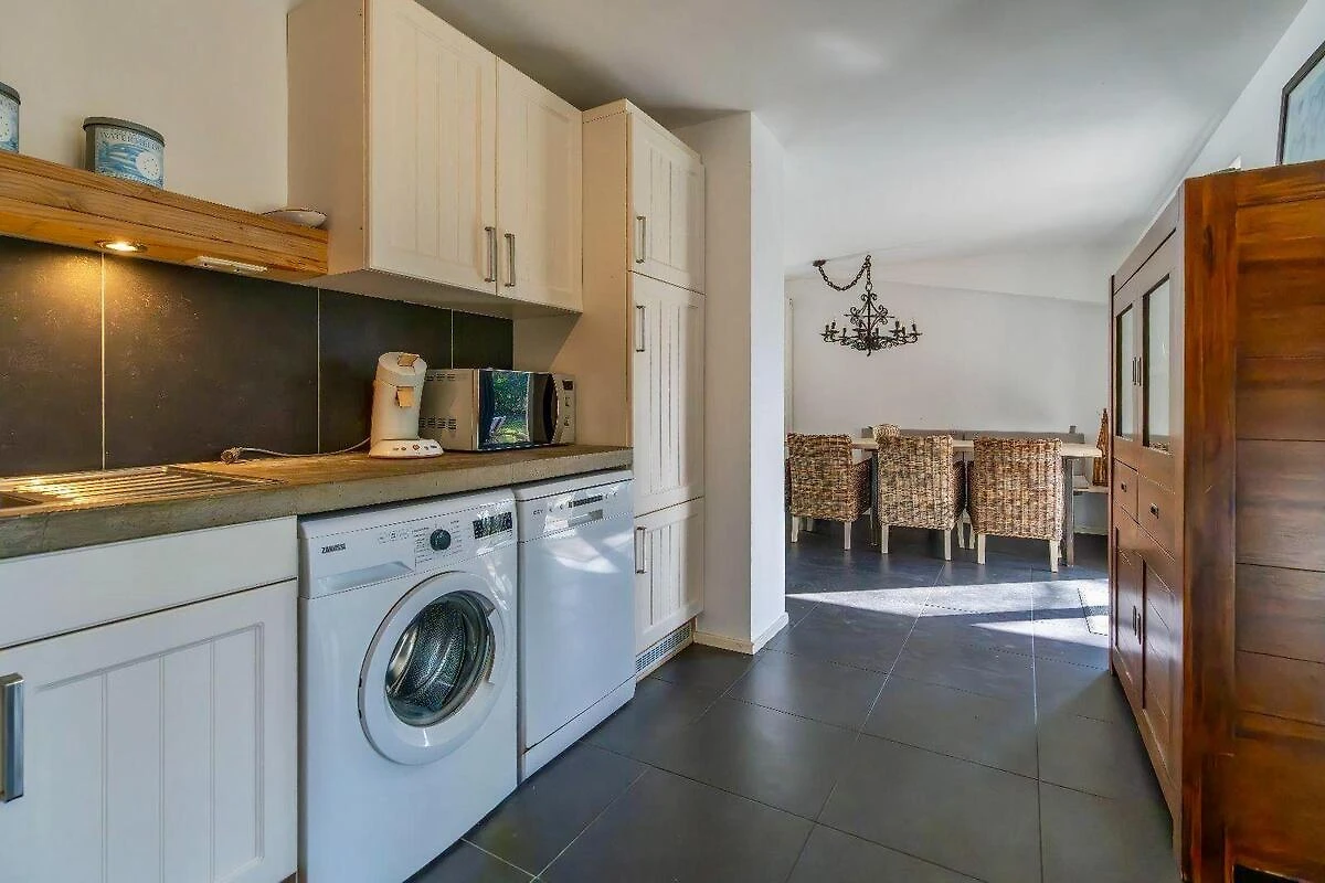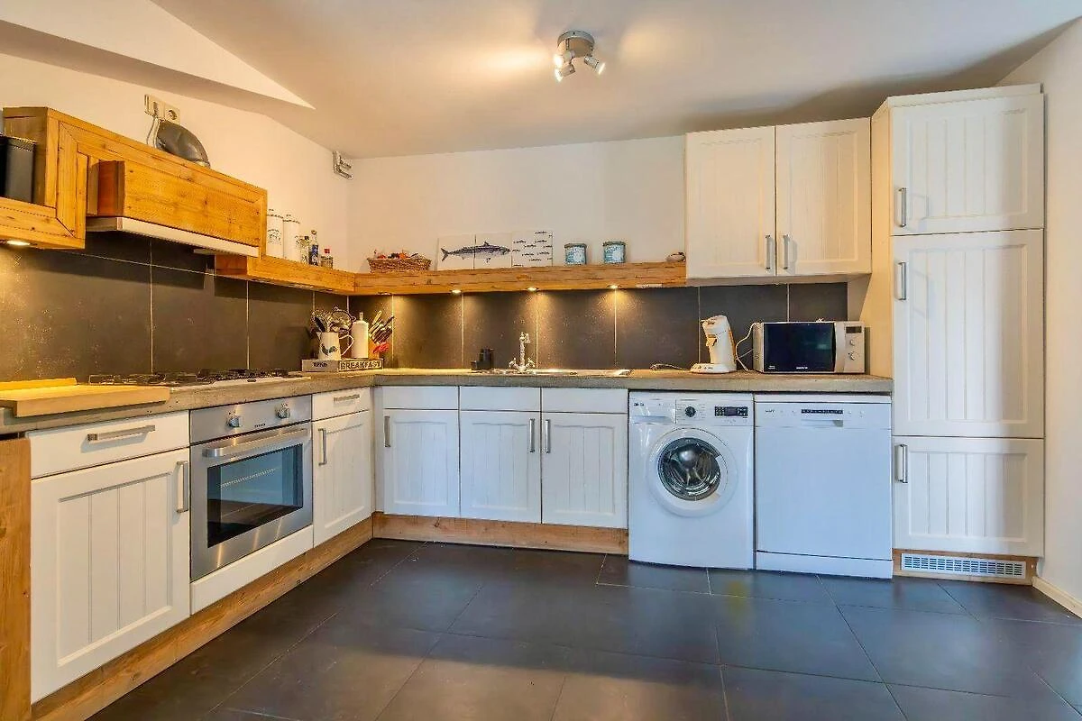 Im Erdgeschoss befindet sich ein großzügiges Wohnzimmer mit einem geräumigen Essbereich und einer offenen Küche, die mit allen Annehmlichkeiten ausgestattet ist. Außerdem gibt es ein Schlafzimmer mit einem Doppelbett, eine separate Toilette mit Waschbecken sowie ein modernes Badezimmer mit Regendusche, Waschbecken und Toilette.