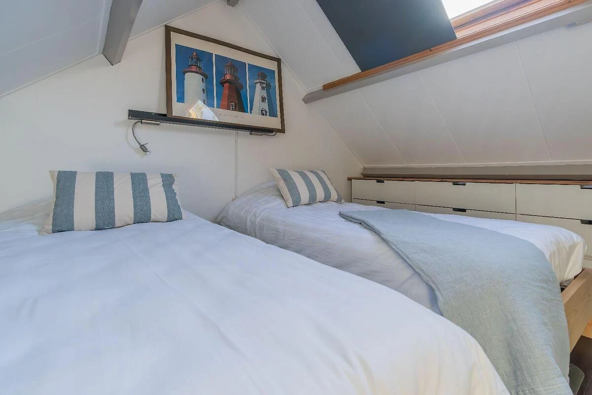 Im Obergeschoss, über eine steile Treppe erreichbar, befinden sich zwei Schlafzimmer mit jeweils zwei Einzelbetten. In einem der Zimmer können die Betten zusammengeschoben und mit einem Foam-Connector zu einem Doppelbett verbunden werden. Ein Treppengitter ist vorhanden.