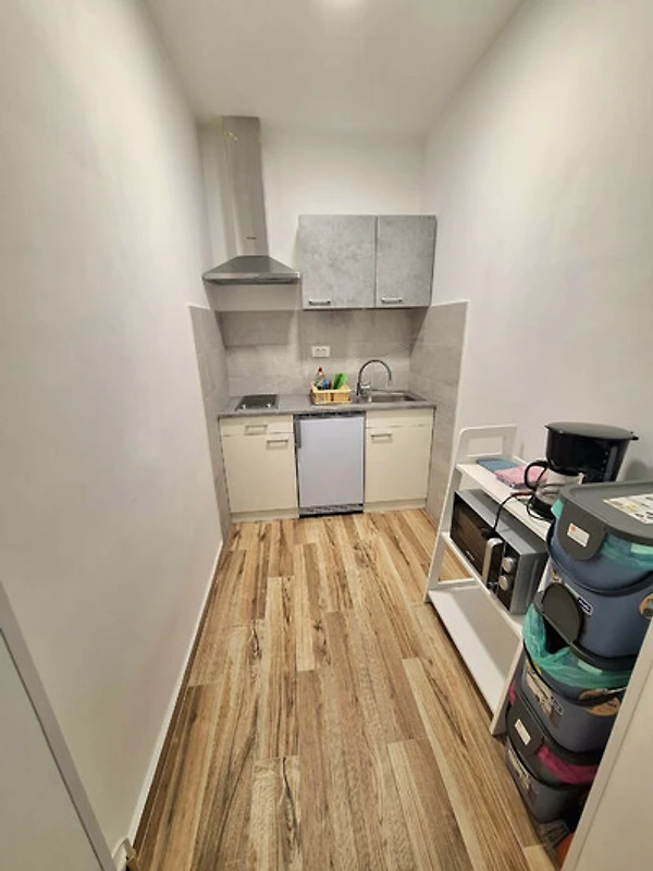 Die offene Elektroküche ist vollständig ausgestattet zum Zubereiten von Mahlzeiten und umfasst einen Kühlschrank, Mikrowelle, Backofen, Gefrierschrank, Geschirrspüler, Herd, Toaster, Kaffeemaschine, Wasserkocher sowie alle wesentlichen Geschirre, Teller, Schüsseln, Besteck und Küchenutensilien.