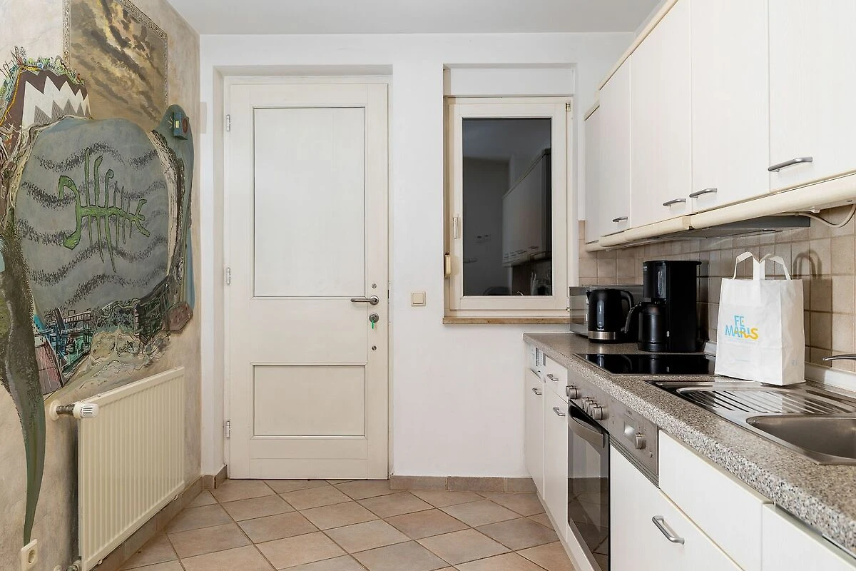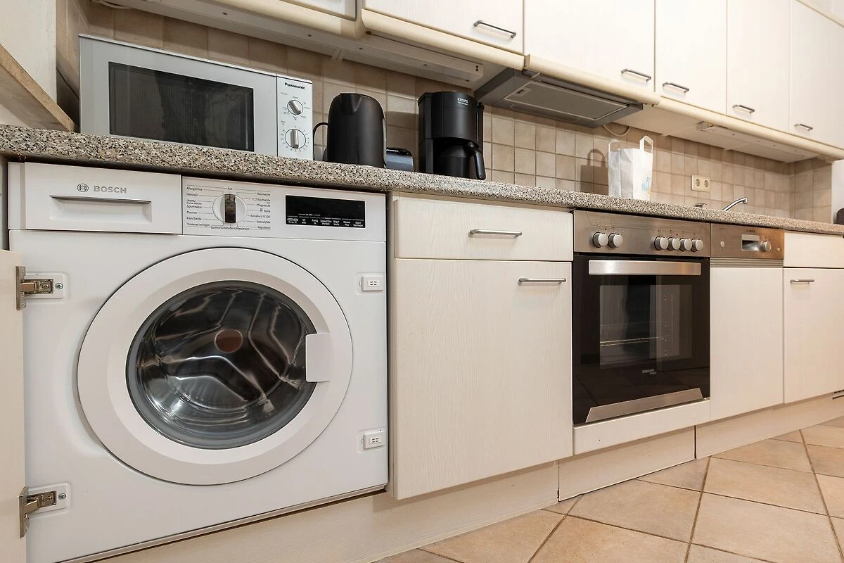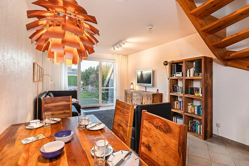 Der helle Wohnbereich öffnet sich direkt zur Terrasse und schafft eine freundliche Atmosphäre, die sich wunderbar ins Freie verlängert perfekt für ein Frühstück in der Morgensonne oder ruhige Momente an der frischen Luft. Die bestens ausgestattete Küche ermöglicht das mühelose Zubereiten gemeinsamer Mahlzeiten.