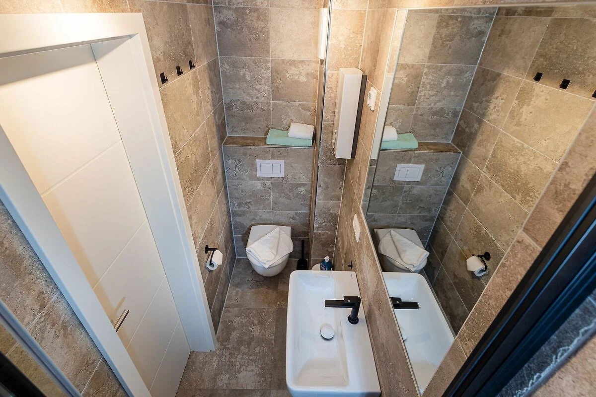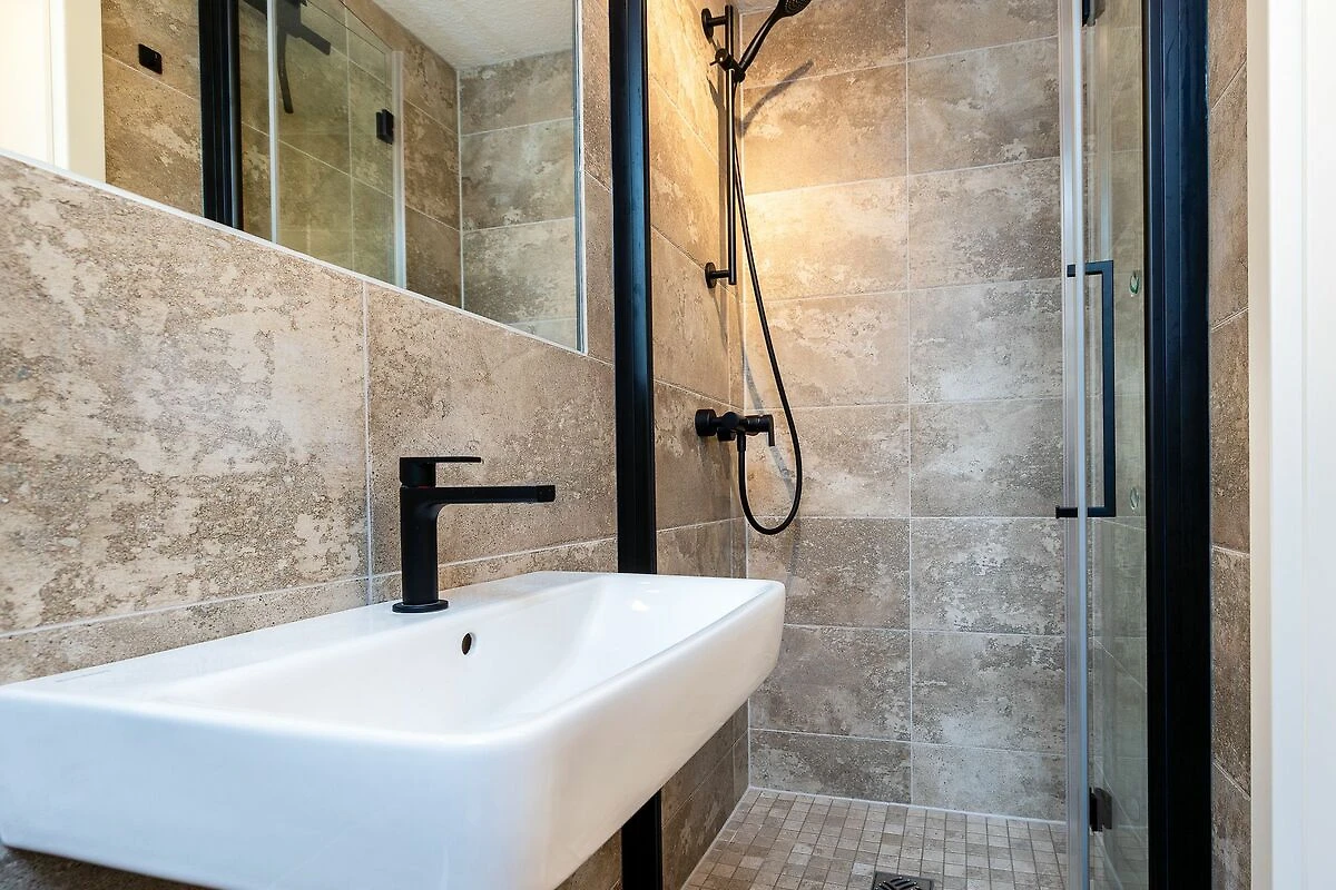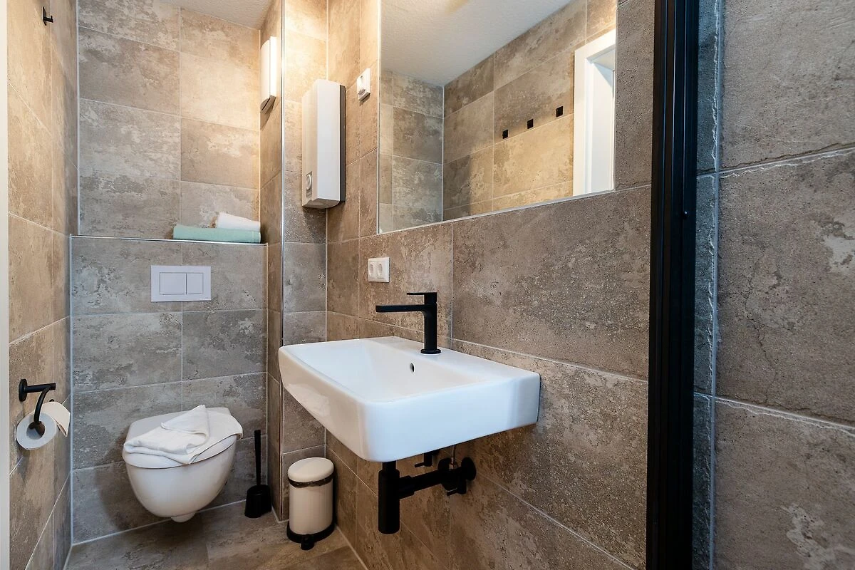 Das neu modern gestaltete Badezimmer überzeugt mit einer komfortablen, ebenerdigen Dusche und einem klaren, zeitgemässen Design. Ein zusätzliches Gäste-WC ergänzt die Ausstattung.