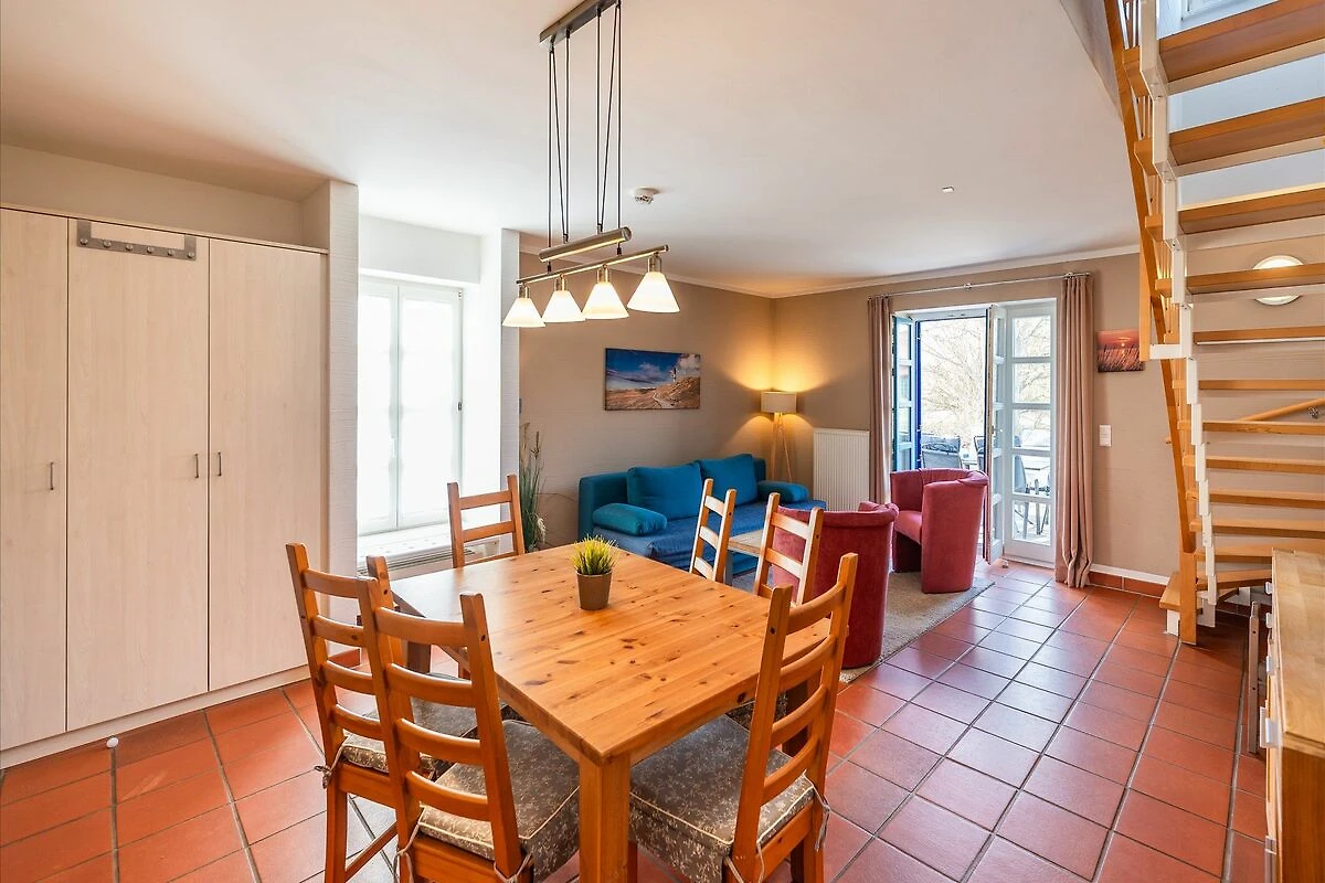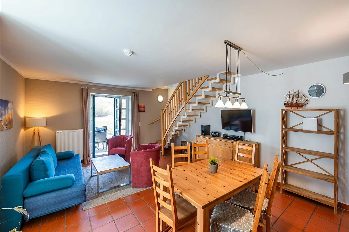 Diese komfortable Ferienwohnung überzeugt mit ausreichend Platz auf zwei Etagen und einer privaten Terrasse. Die Küche ist mit allem notwendigen ausgestattet und bietet neben einem Cerankochfeld, eine Geschirrspülmaschine, eine Mikrowelle, einen Wasserkocher und eine Kaffeemaschine. Im Wohnzimmer lässt sich das Sofa zu einer Schlafcouch umfunktionieren, außerdem finden sich hier ein TV, ein DVD-Player und eine Stereoanlage. Beide Schlafzimmer liegen separat und sind mit je einem Doppelbett und einmal eingerichtet. Das Badezimmer überzeugt mit einer geräumigen Badewanne, einem Waschbecken, einem WC sowie einem großen Spiegel.