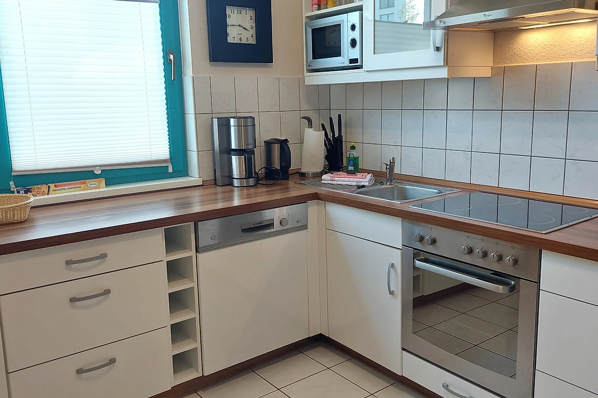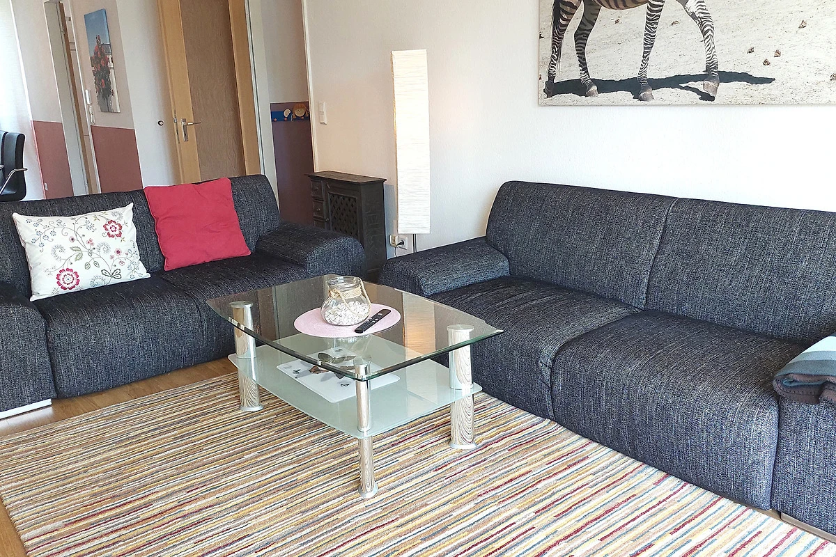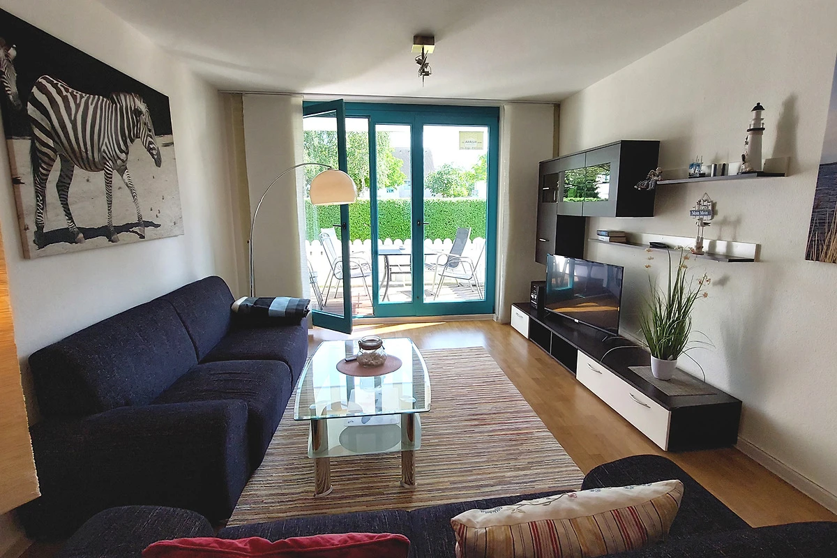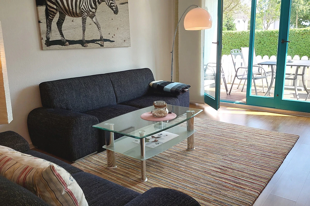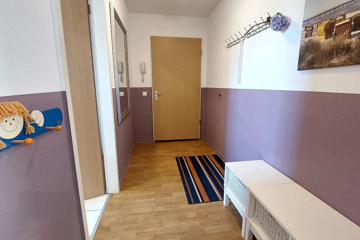 Die Wohnung verfügt über einen separaten Eingang von dem Sie in den vorgelagerten Flur gelangen. Im Wohnbereich mit angrenzendem Essbereich erwartet Sie eine gemütliche Sitzgruppe und gelangen von hier auf die möblierte Terrasse. Die technische Einrichtung umfasst einen Flachbildfernseher, DVD-Player, Musikanlage sowie einen kostenfreien W-LAN-Zugang. Im separaten Küchenbereich finden Sie eine komplette Küchenzeile mit zusätzlicher Sitzmöglichkeit sowie Backofen, Cerankochfeld, Mikrowelle, Geschirrspüler, Kaffeemaschine, Wasserkocher, Toaster und weitere Küchenhelfer vor. Das Hauptschlafzimmer verfügt über ein Doppelbett mit hochwertigen Matratzen sowie über einen Kleiderschrank. Im zweiten Schlafbereich finden Sie zwei Einzelbetten sowie eine kombinierte Anbauwand mit Kleiderschrank vor. Für die kleinen Gäste stehen ein Kinderreisebett mit Extra-Kindermatratze, ein mobiler Wickeltisch, eine Baby-Badewanne, Kindertritt für das Waschbecken sowie 2 Marken-Kinderhochstühle bereit. Das Bad ist ausgestattet mit einer Badewanne, Waschbecken [&] WC. Zusätzlich bietet Ihnen diese Wohnung eine Münzwaschmaschine. Ein Pkw-Stellplatz befindet sich am Haus. Ihre Fahrräder können Sie in dafür vorgesehene Räume direkt am Haus unterstellen.