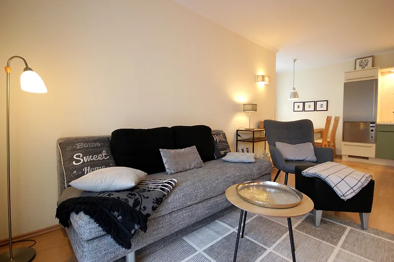 Neben dem Wohnraum mit offener Küche und Essplatz gibt es einen separaten Schlafraum, sowie ein Badezimmer mit Waschtisch, Dusche, WC und Haartrockner. Der Schlafraum ist mit einem Doppelbett und einem grossen Kleiderschrank ausgestattet. Im komfortablen Wohnraum finden Sie ein Schlafsofa welches Platz für eine dritte Person bietet. Zur technischen Ausstattung gehört kostenloser WLAN-Zugang und ein grosser Flachbildfernseher. Die moderne Küche ist mit Geschirrspülmaschine, Backofen, Mikrowelle, Kühlschrank, Kaffeemaschine, Wasserkocher und diversen anderen Küchenhelfern ausgestattet. Besonderes Highlight dieser Wohnung ist ein eigener Aussenstellplatz direkt am Haus ohne Höhenbegrenzung.