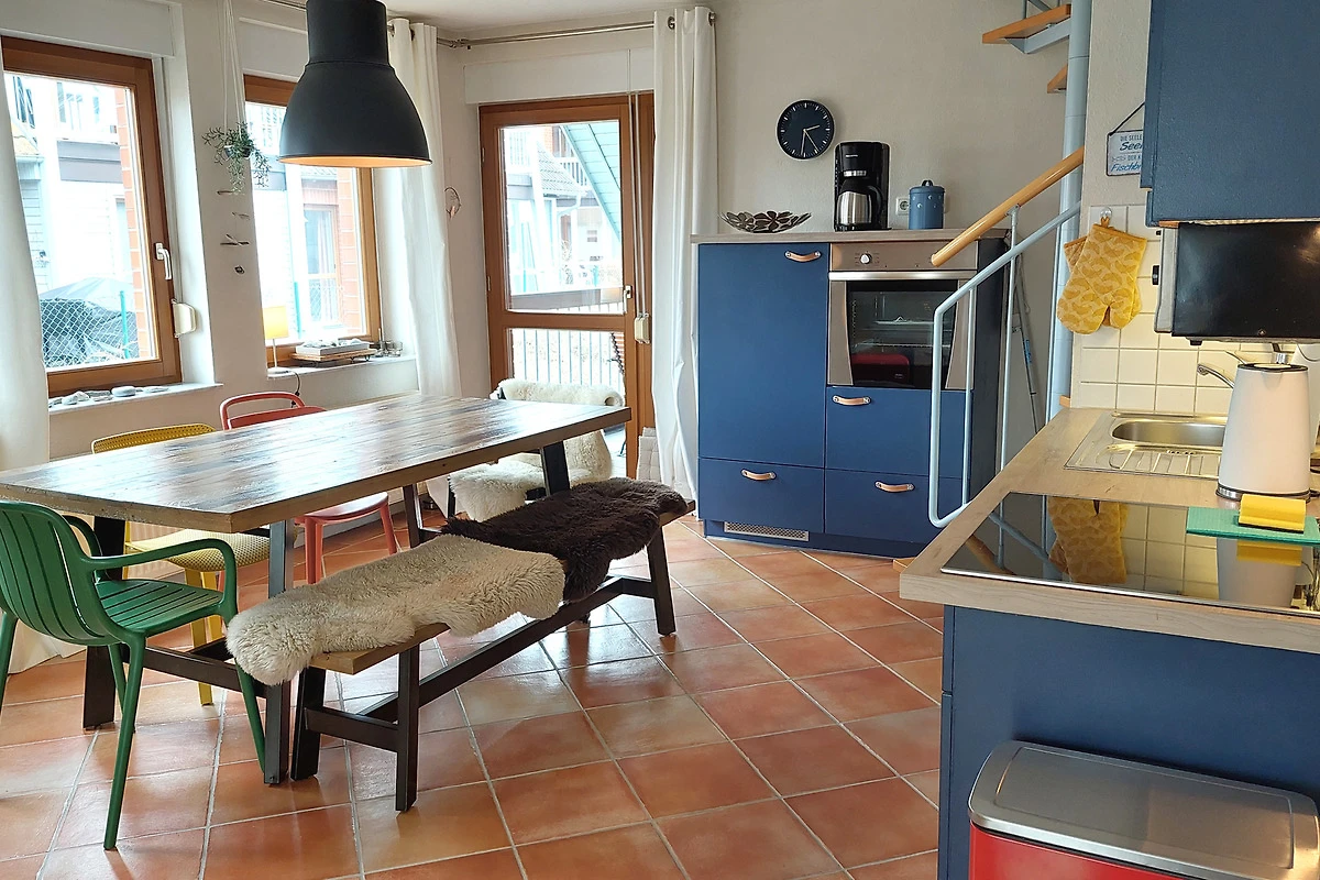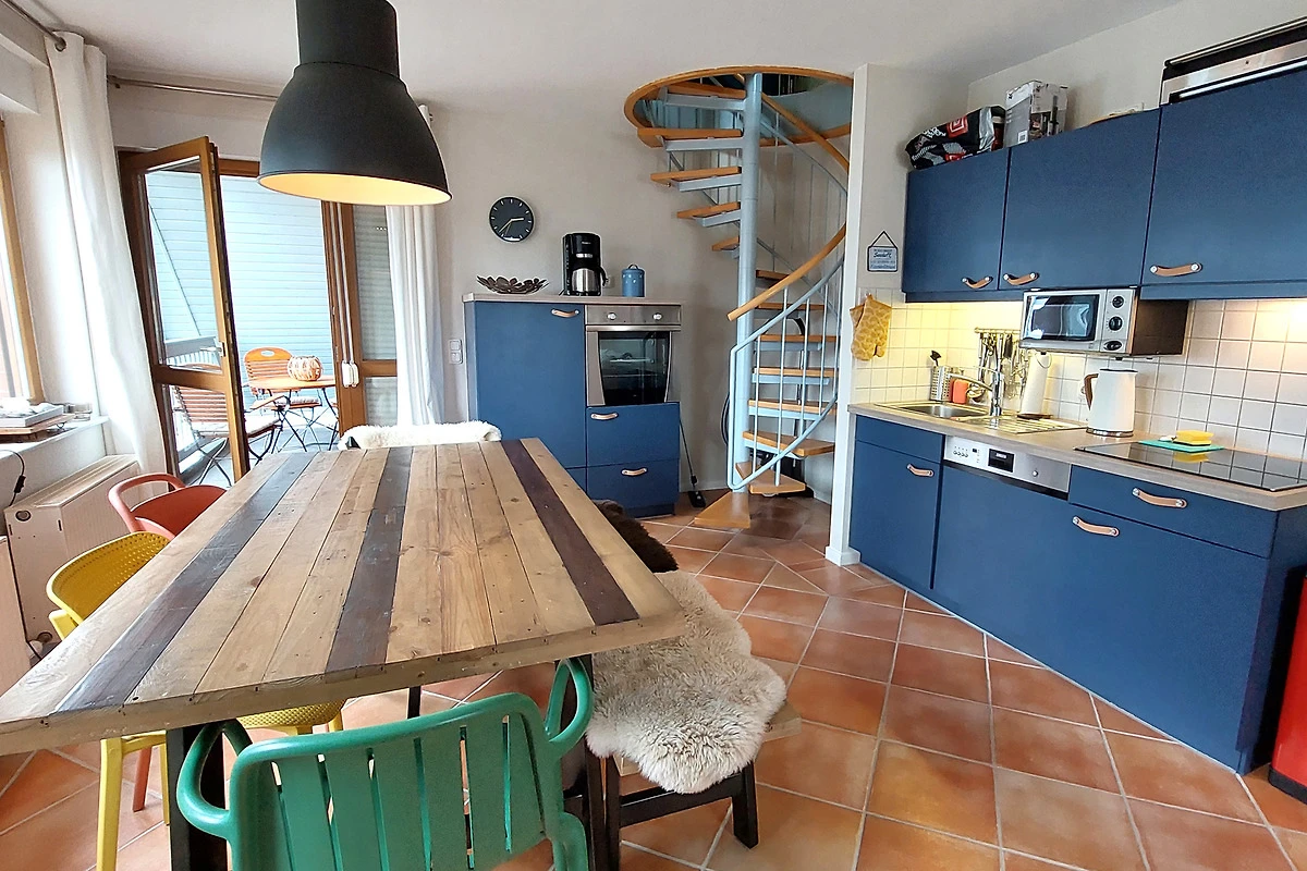 Der geräumige Wohn- und Essbereich beinhaltet eine moderne Küchenzeile mit Cerankochfeld, Mikrowelle, Geschirrspüler und Kühlschrank (samt Gefrierfach). Backofen, Raclette, Elektrogrill und viele weitere Küchenhelfer sorgen dafür, das man sich auch im Urlaub bequem selbst verpflegen kann. Der Esstisch bietet Sitzgelegenheiten für bis zu 6 Personen.