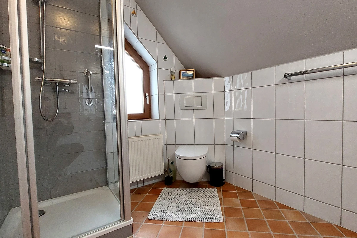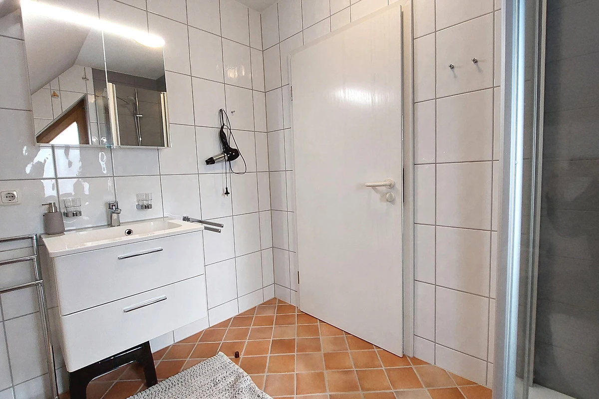 Vom Flurbereich samt Garderobe gelangen Sie ins Tageslichtbad, welches über WC, Dusche, Kosmetikspiegel und Fön verfügt.