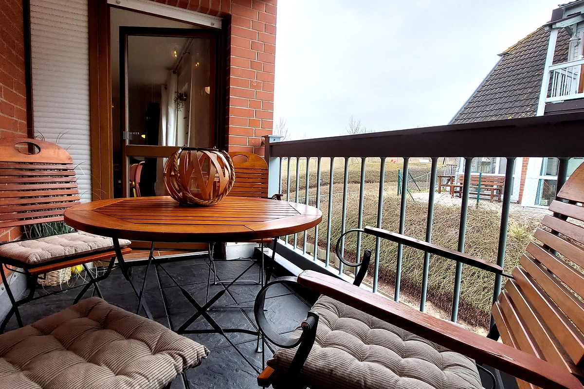 Highlight ist der möblierte und vollüberdachte Balkon mit Blick ins Grüne und zum angrenzenden Spielplatz.