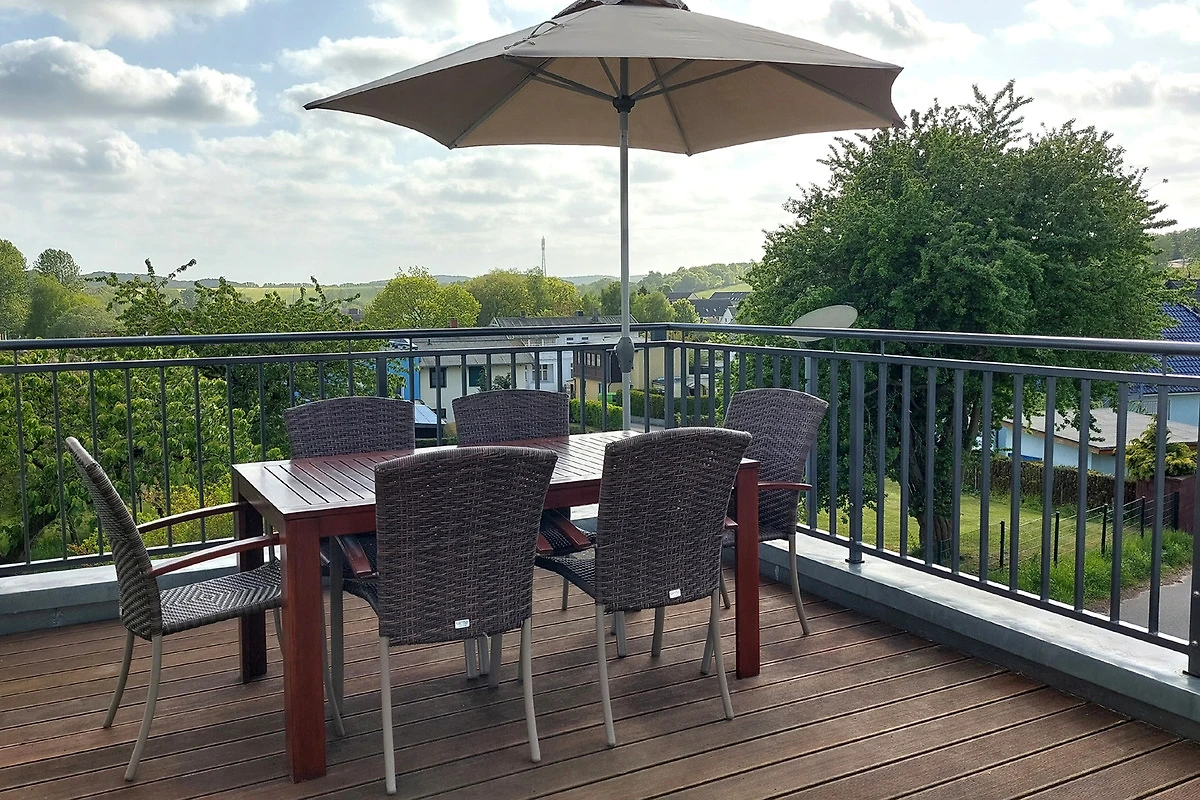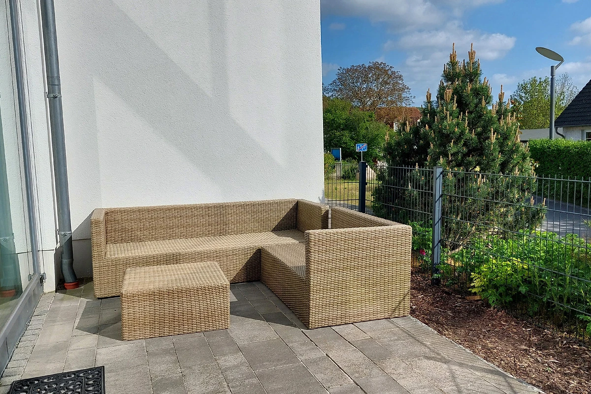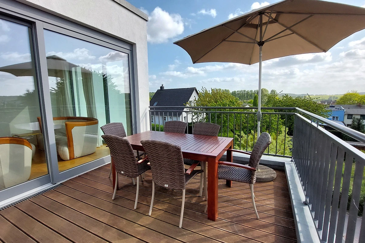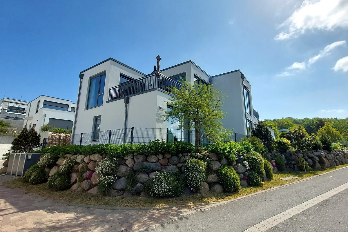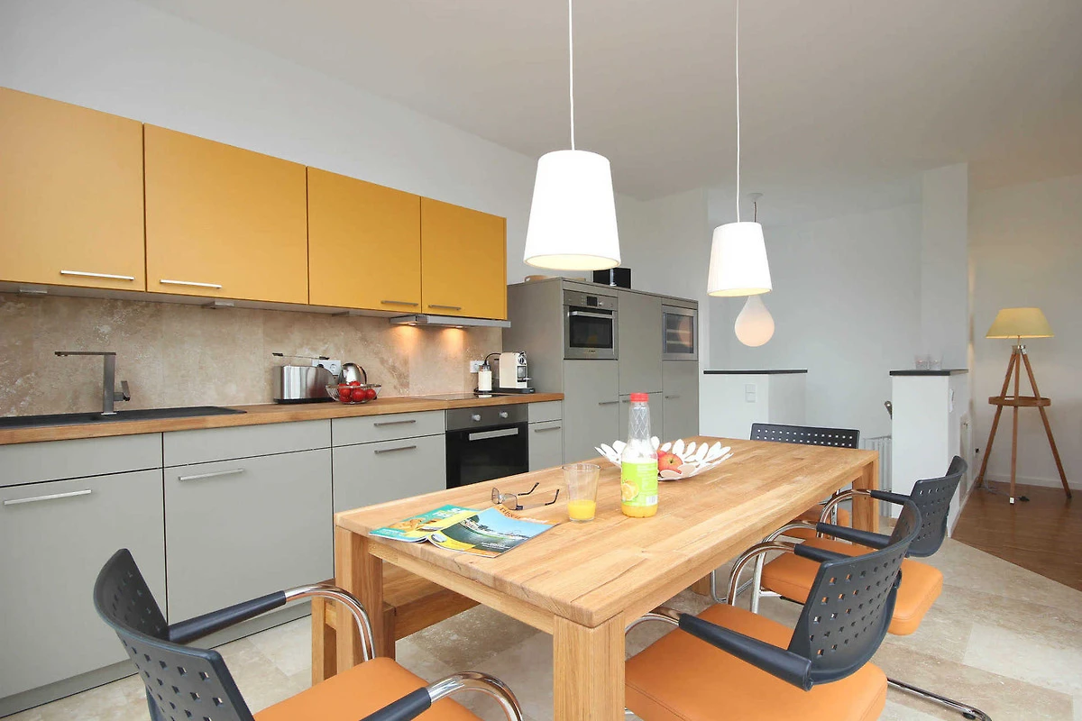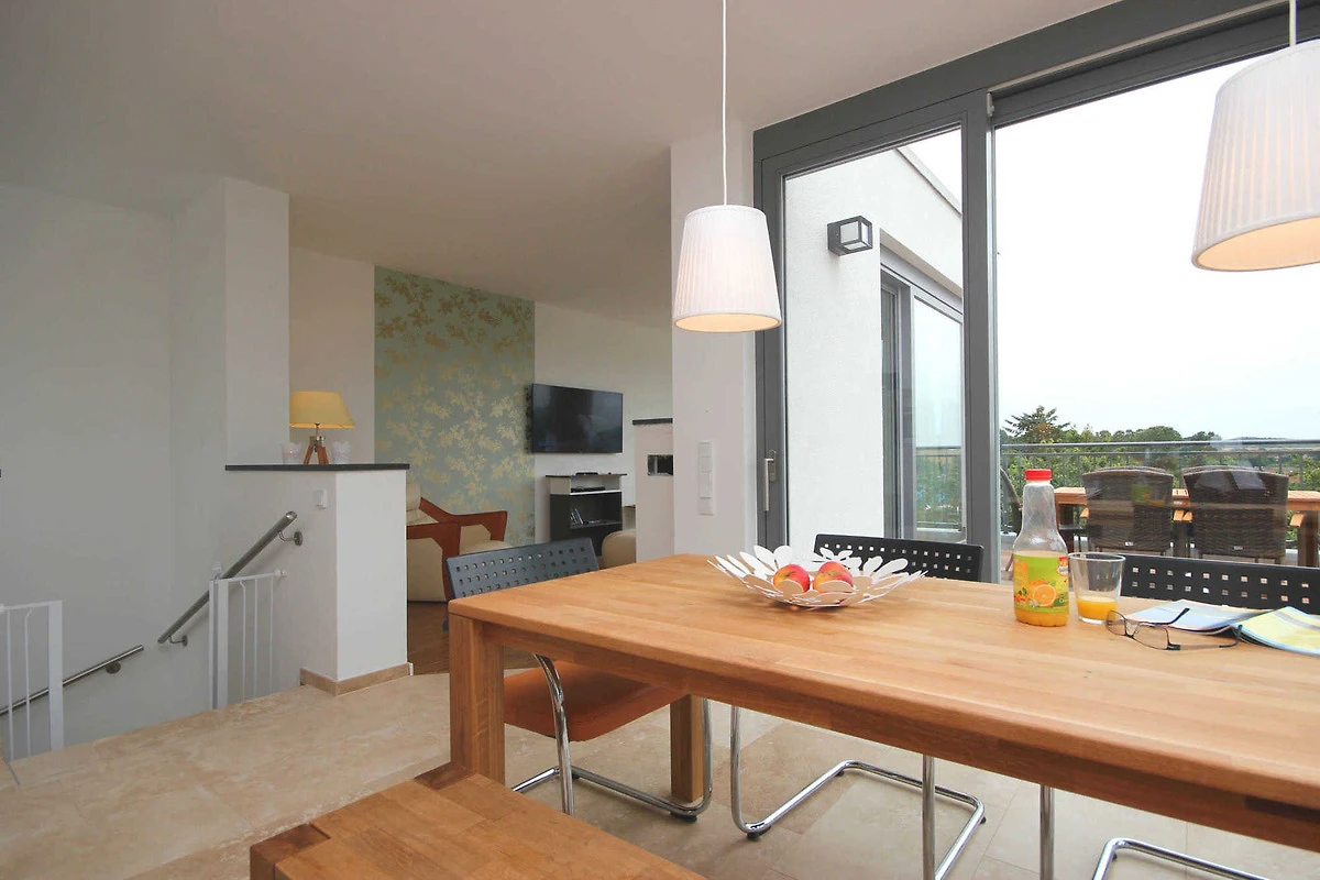 Über eine Treppe gelangen Sie in das Obergeschoss in den hochwertig ausgestatteten Wohnraum mit integrierter und moderner Wohnküche samt grossem Esstisch und Zugang zur grossen möblierten Dachterrasse. Hier geniessen Sie einen weiten Blick über die Dächer von Binz.