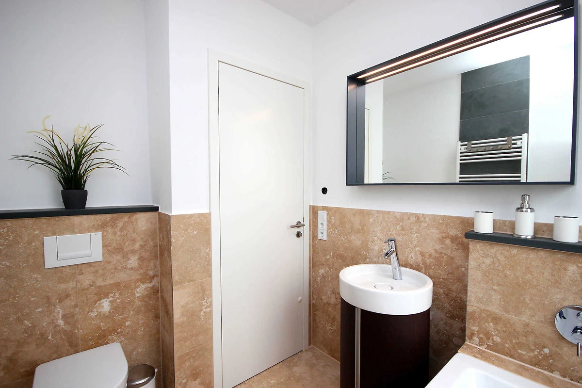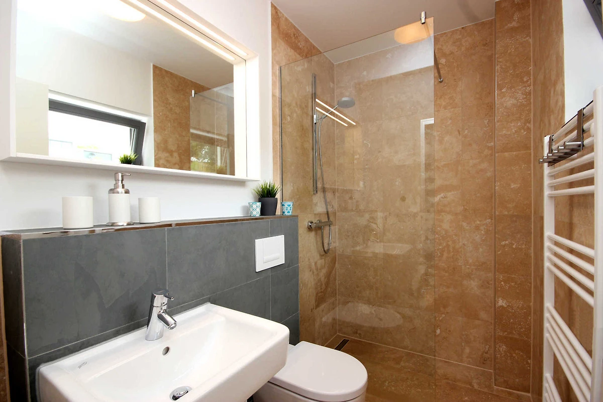 Das erste Bad verfügt über eine Badewanne, Handtuchtrockner, WC und Waschtisch. Im zweiten Bad erwartet Sie eine ebenerdige, grosszügige Dusche, Handtuchtrockner, Waschtisch und WC.