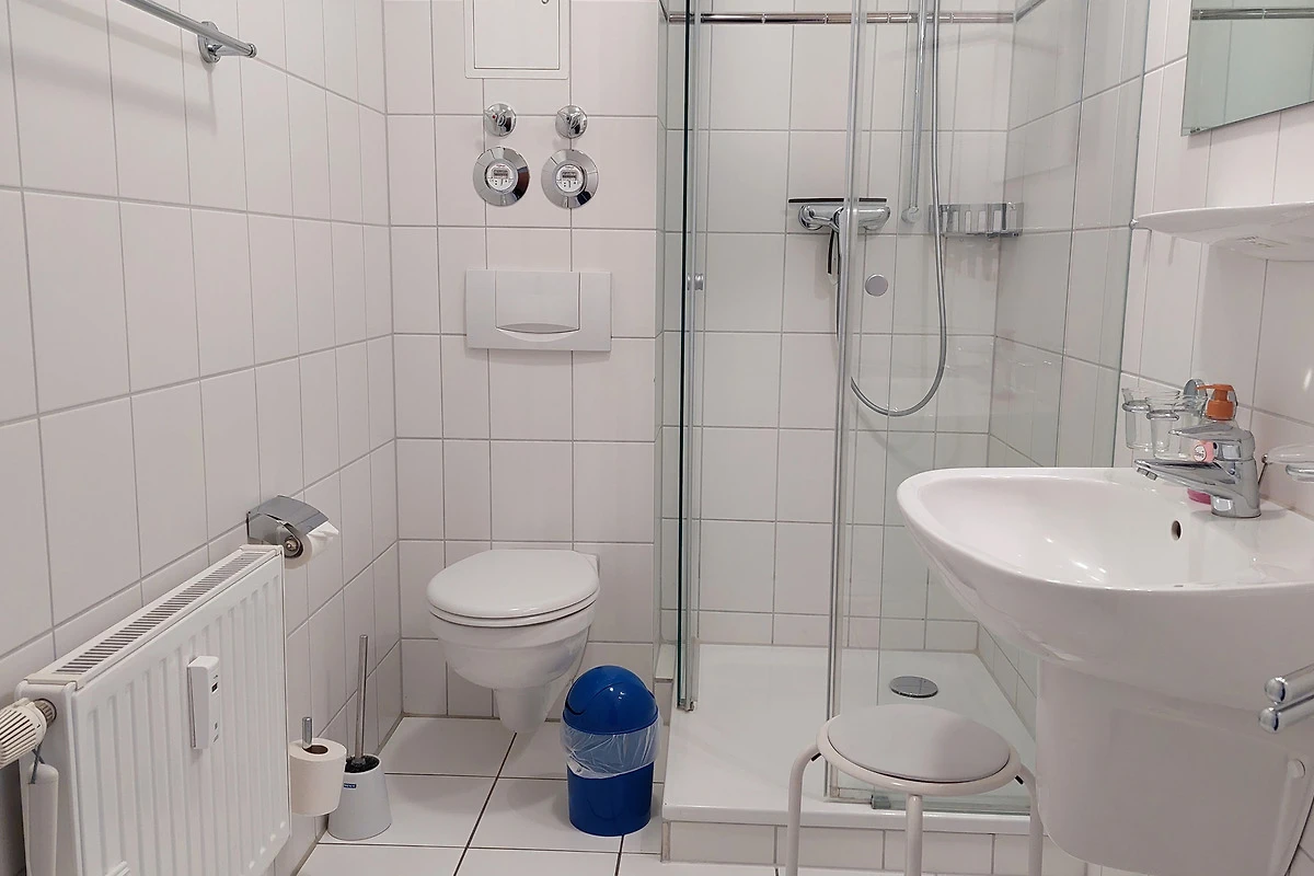 Vom Flur, samt Garderobe und Kleiderschrank, gelangt man ins Badezimmer, welches über Dusche und WC verfügt.