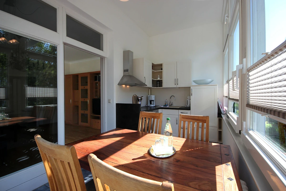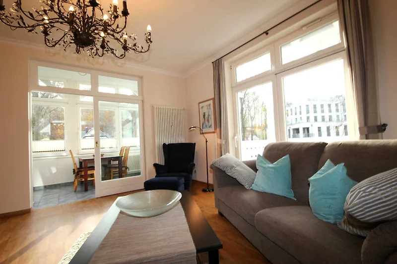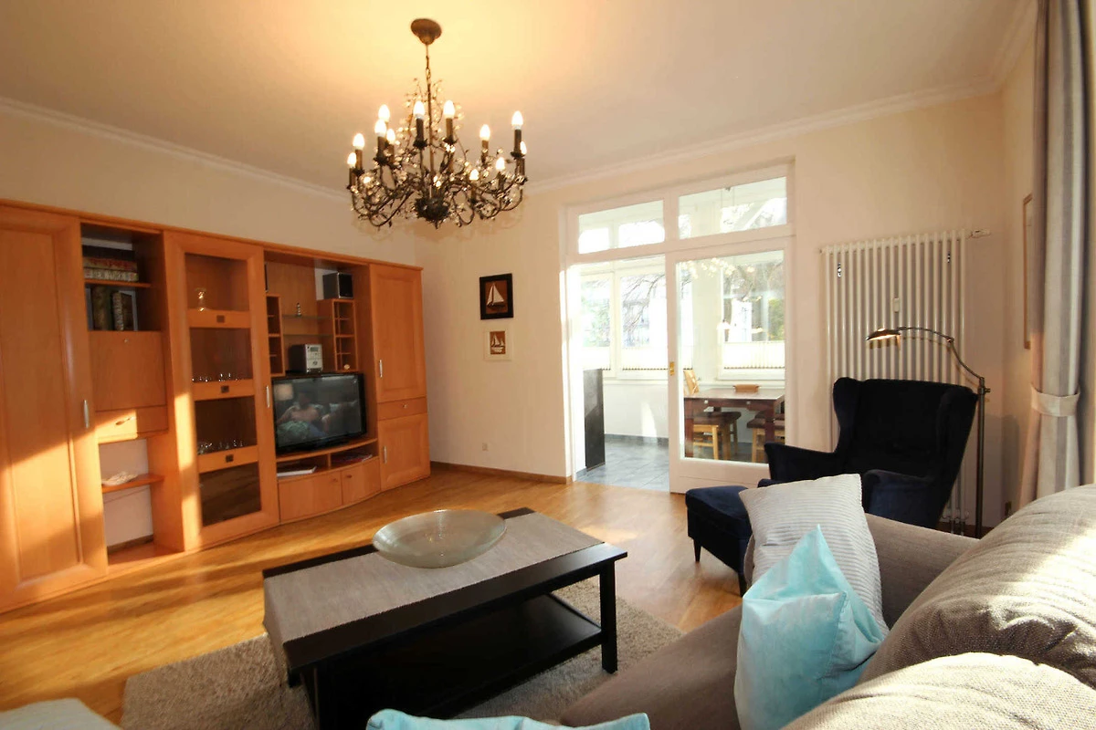 Die schöne 3 - Raum Wohnung hat eine Grösse von ca. 84 qm. Neben dem Wohnraum gibt es 2 separate vollwertige Schlafräume, eine separate Küche und ein Tageslichtbad mit Waschtisch, Dusche, Handtuchtrockner und WC. Die Küche im Wintergarten ist mit Essplatz und Küchenzeile komplett ausgestattet. Im 1. und 2. Schlafraum befindet sich jeweils ein bequemes Boxspringbett und ein Kleiderschrank. Über den ersten Schlafbereich ist der Wintergarten zugänglich, welcher mit Schlafsofa sowie einer Leseecke ausgestattet ist. Dort kann bei Bedarf eine weitere Personen schlafen. Die Kochzeile verfügt über einen Kühlschrank, Backofen, Geschirrspüler und diverse Kleingeräte.