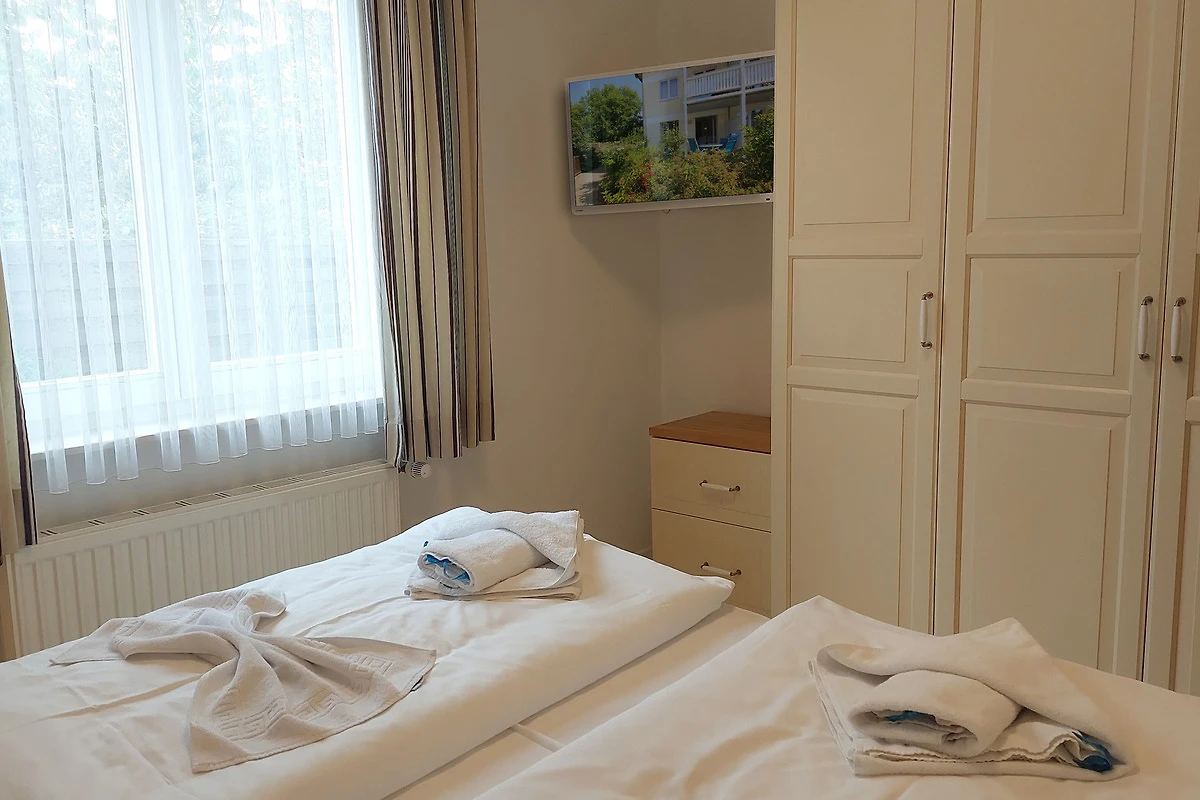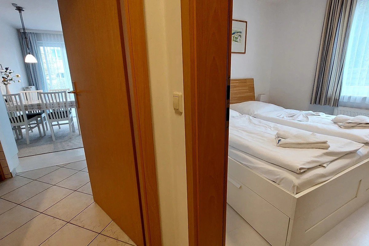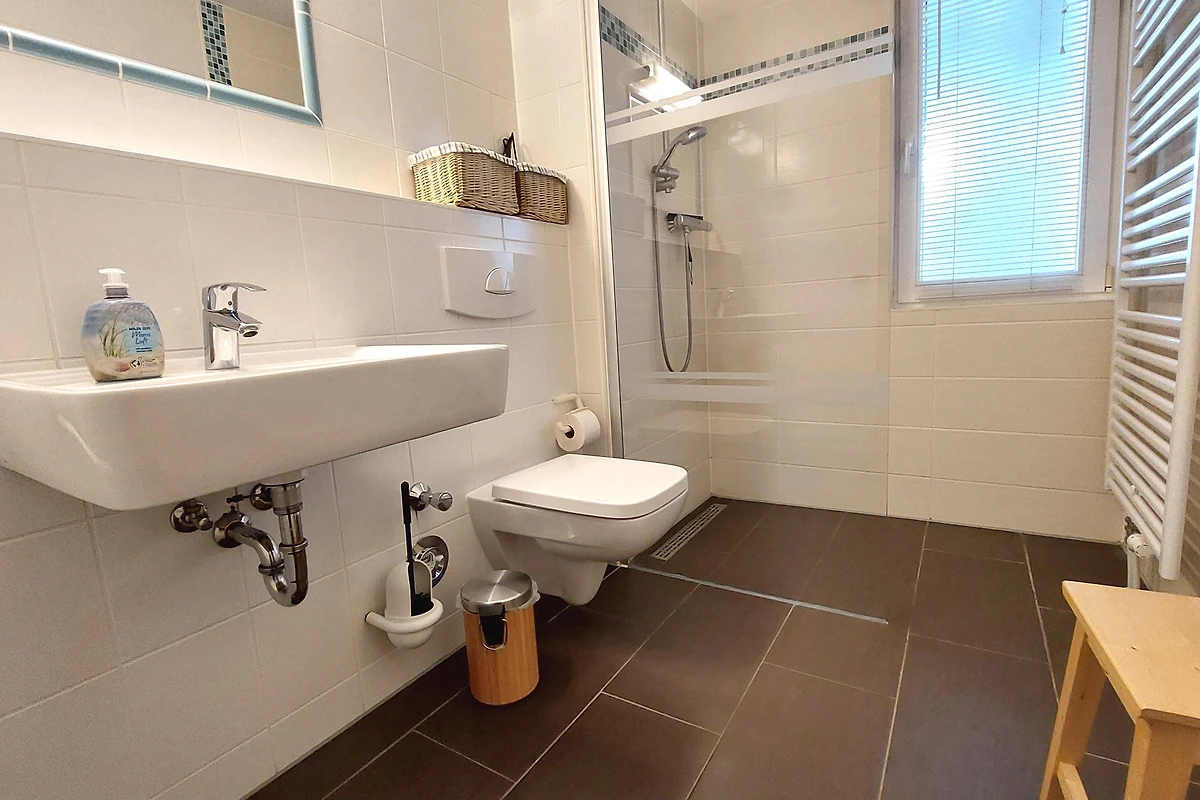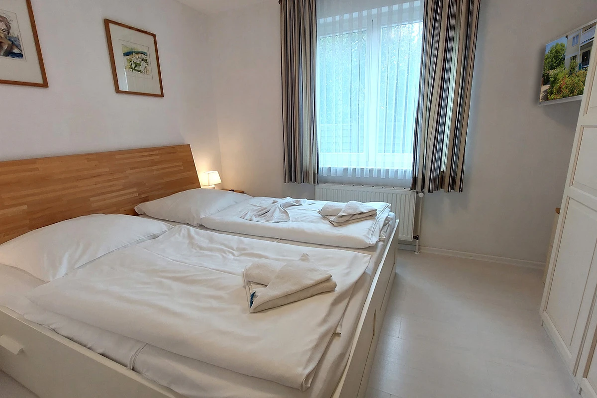 Der Schlafraum ist mit einem Doppelbett, Kleiderschrank sowie einem zusätzlichen TV ausgestattet. Im Badezimmer erwartet Sie eine ebenerdige Dusche, Haartrockner, eine Handtuchheizung und WC. Für Ihren PKW steht ein Stellplatz auf dem Grundstück zur Verfügung. Ein abschliessbarer Fahrradkeller befindet sich direkt im Haus.