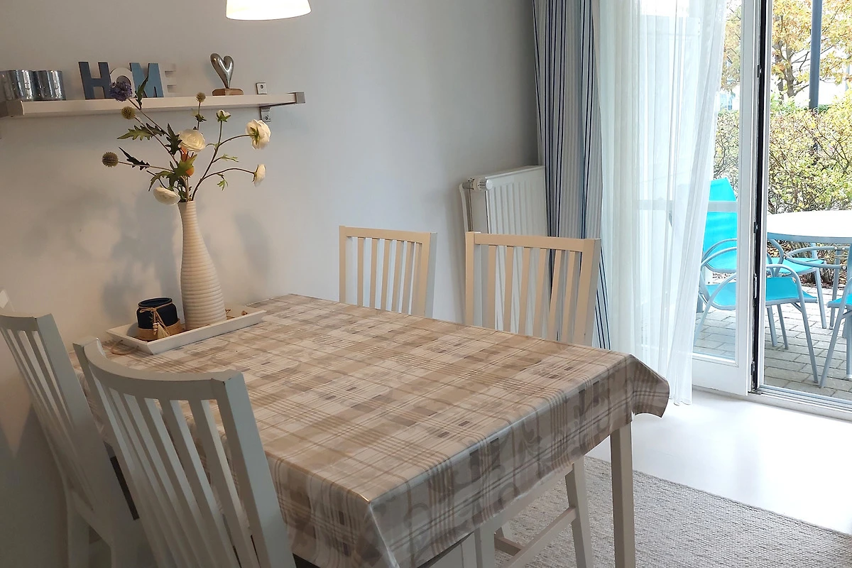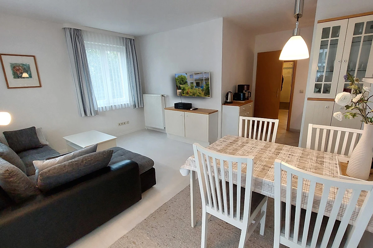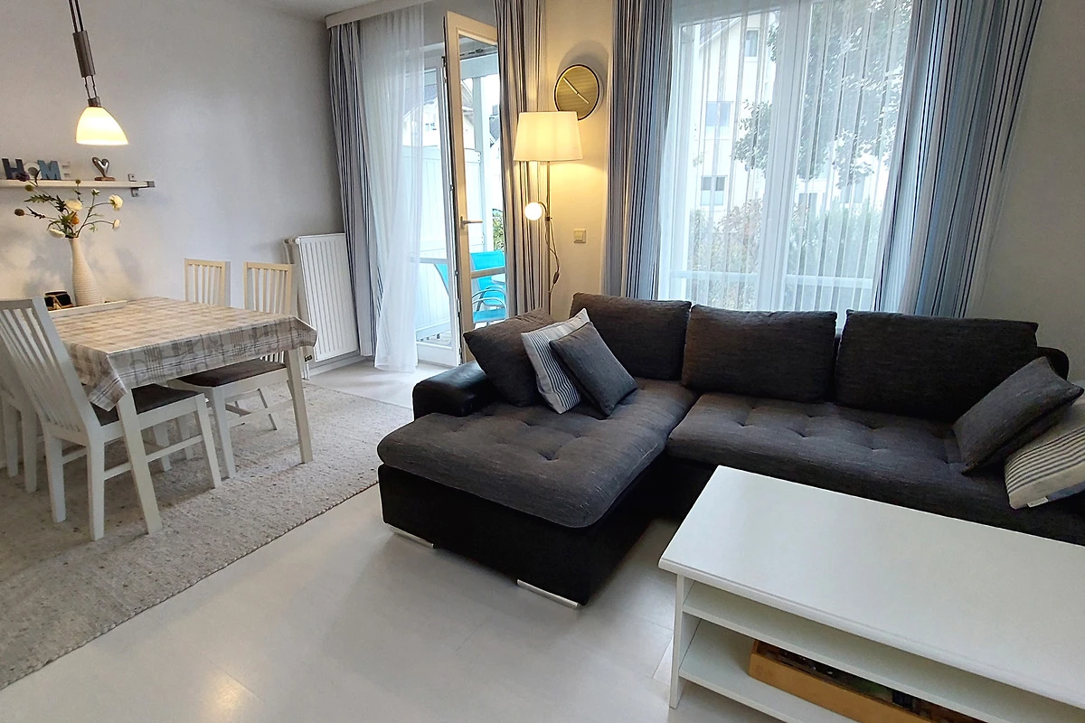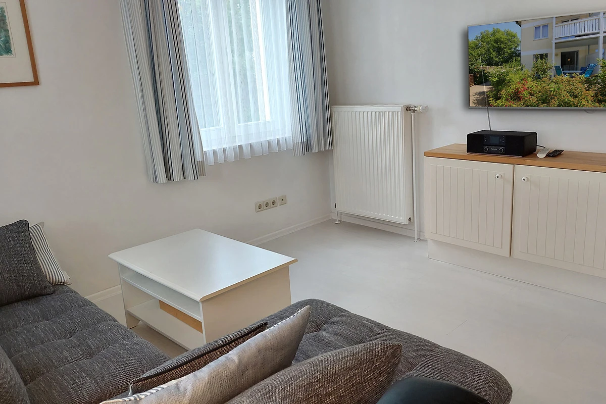 Ihre moderne 2-Zimmer-Nichtraucherwohnung 47RB2 hat eine Grösse ca. 49 qm. Sie ist für bis zu 4 Personen eingerichtet und befindet sich im Erdgeschoss des Hauses. Von der Terrasse, in Richtung Südwest gelegen, geniessen Sie abseits vom Strassenverkehr sonnige Momente. Die helle Wohnung teilt sich auf in einen Flur mit Garderobe, einen grosszügigen Wohnraum mit Essbereich und integrierter Pantry-Küche, ein Tageslichtbad sowie ein Schlafzimmer. Im Wohnraum finden Sie neben der Wohnlandschaft mit Schlafsofa, welche die Schlafmöglichkeit für bis zu 2 weiteren Personen bietet, noch einen separaten Esstisch mit 4 Stühlen. Die Küchenzeile ist ausgestattet mit 2-Platten-Kocheld, Mikrowelle, Kühlschrank mit Gefrierfach, Kaffeemaschine, Wasserkocher und Toaster. Zur technischen Ausstattung gehören zwei Smart-TVs, stabiles WLAN und ein neues DAB+ - Radio mit CD-Laufwerk, Bluetooth, USB-Playback und Charging mit Fernbedienung vom Typ Digitradio 370 CD BT von TechniSat.