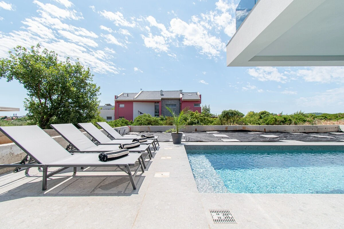 Im Außenbereich erwartet Sie eine private Terrasse mit stilvollem Mobiliar – genießen Sie hier Ihre Mahlzeiten im Freien oder entspannen Sie unter schattenspendenden Elementen. Der große Swimmingpool im gepflegten Garten ist das Herzstück der Villa und verspricht Erfrischung an sonnigen Tagen. Bequeme Sonnenliegen stehen bereit, um das mediterrane Flair in vollen Zügen auszukosten.