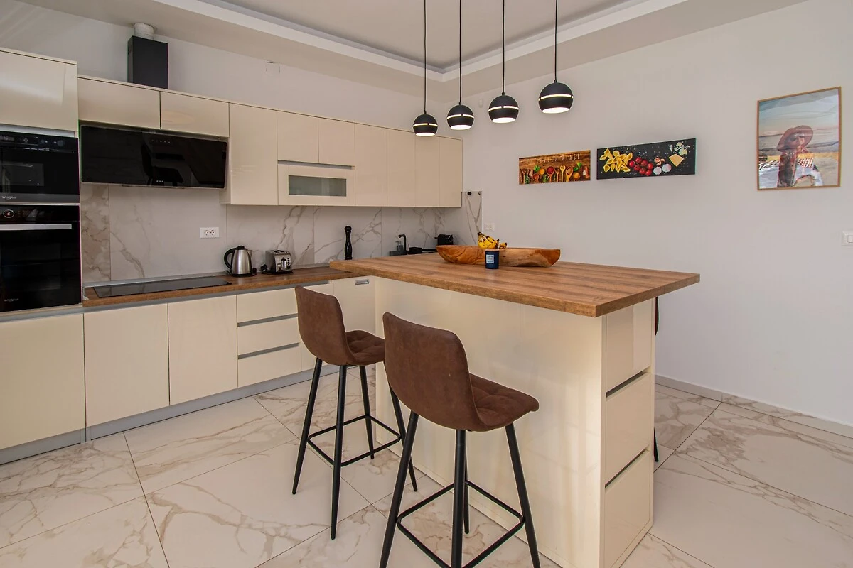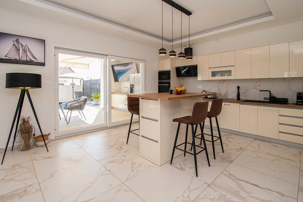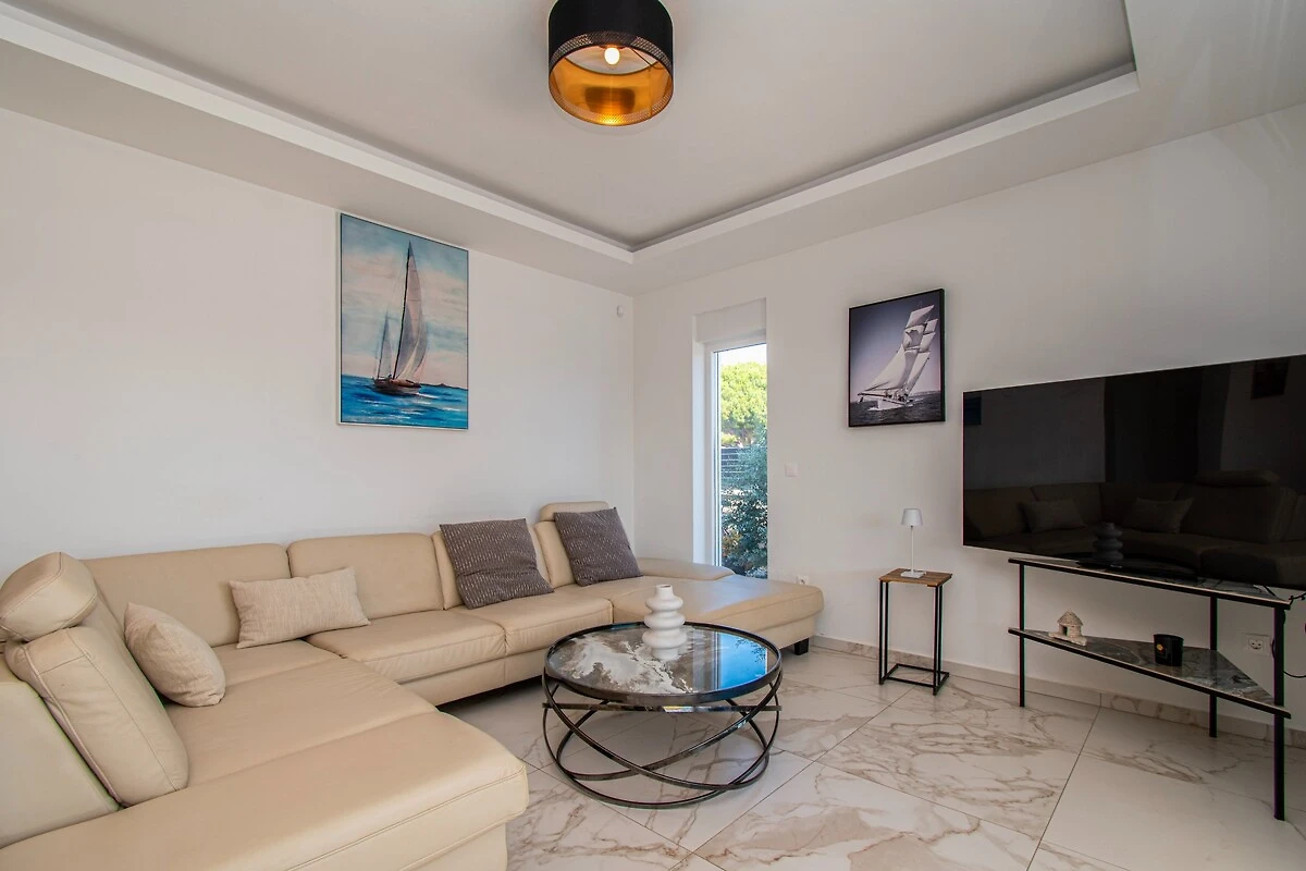 Die Innenräume der Villa sind modern eingerichtet und mit allem ausgestattet, was Sie für einen angenehmen Aufenthalt von bis zu 6 Personen benötigen. Im Erdgeschoss befinden sich ein klimatisiertes Wohnzimmer, eine voll ausgestattete Küche mit Kochinsel sowie ein Badezimmer. Im Obergeschoss gibt es drei geräumige Schlafzimmer mit Doppelbetten, Klimaanlage und TV. Außerdem stehen hier ein weiteres Badezimmer sowie ein separates Gäste-WC zur Verfügung. Insgesamt bietet die Villa drei Schlafzimmer, zwei Badezimmer und ein Gäste-WC. Zwei der Schlafzimmer verfügen über einen Balkon mit wunderschönem Blick auf das Meer und den Nationalpark Brijuni.