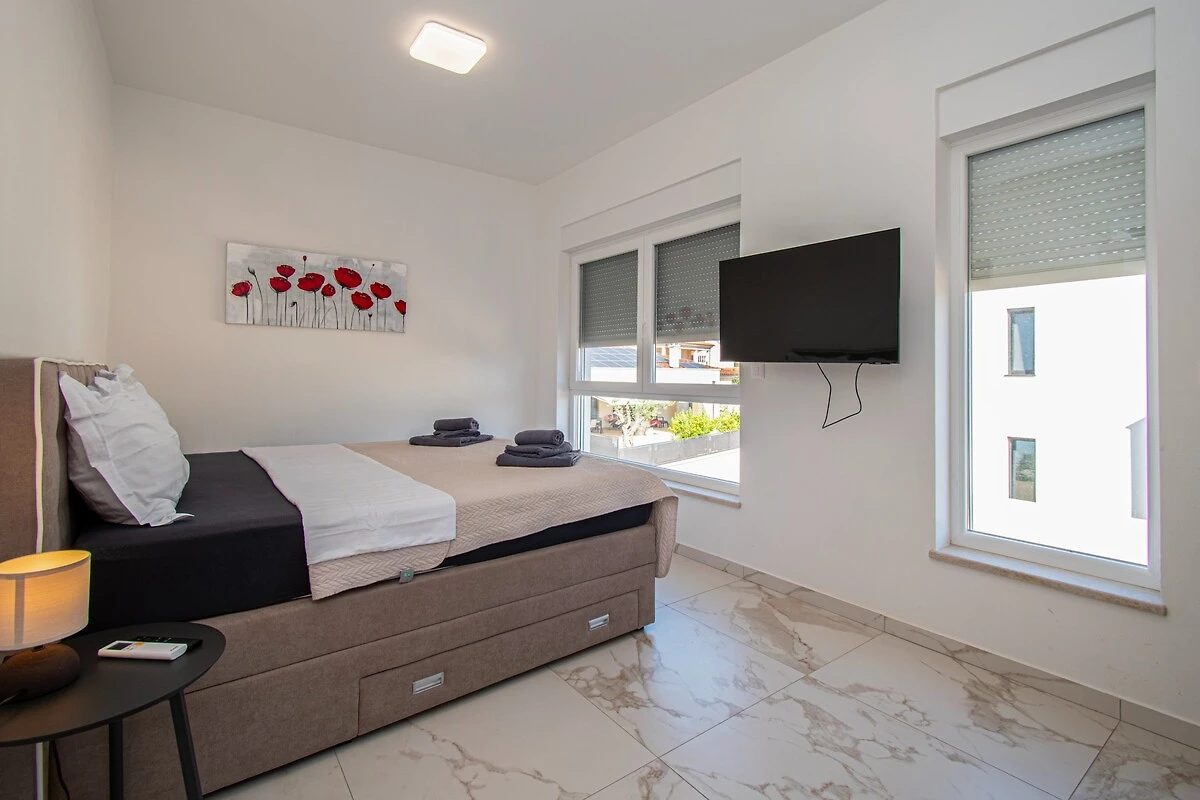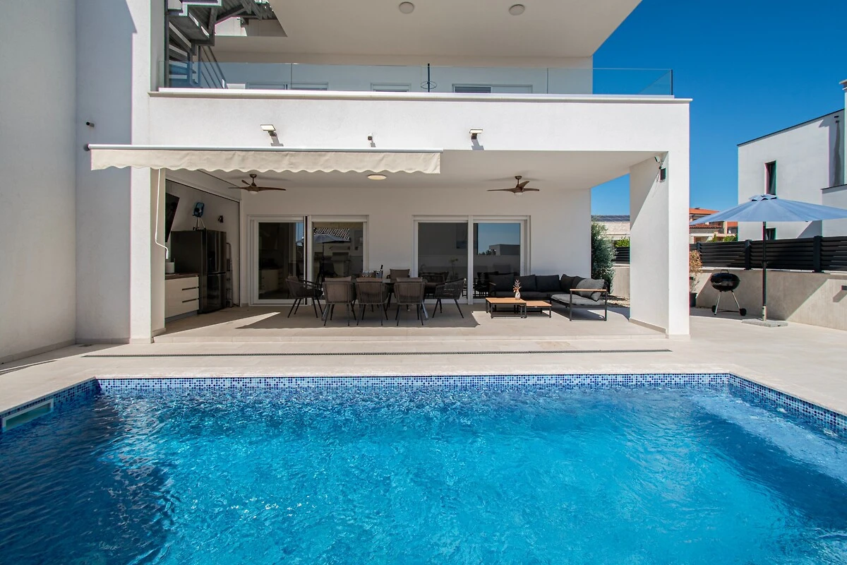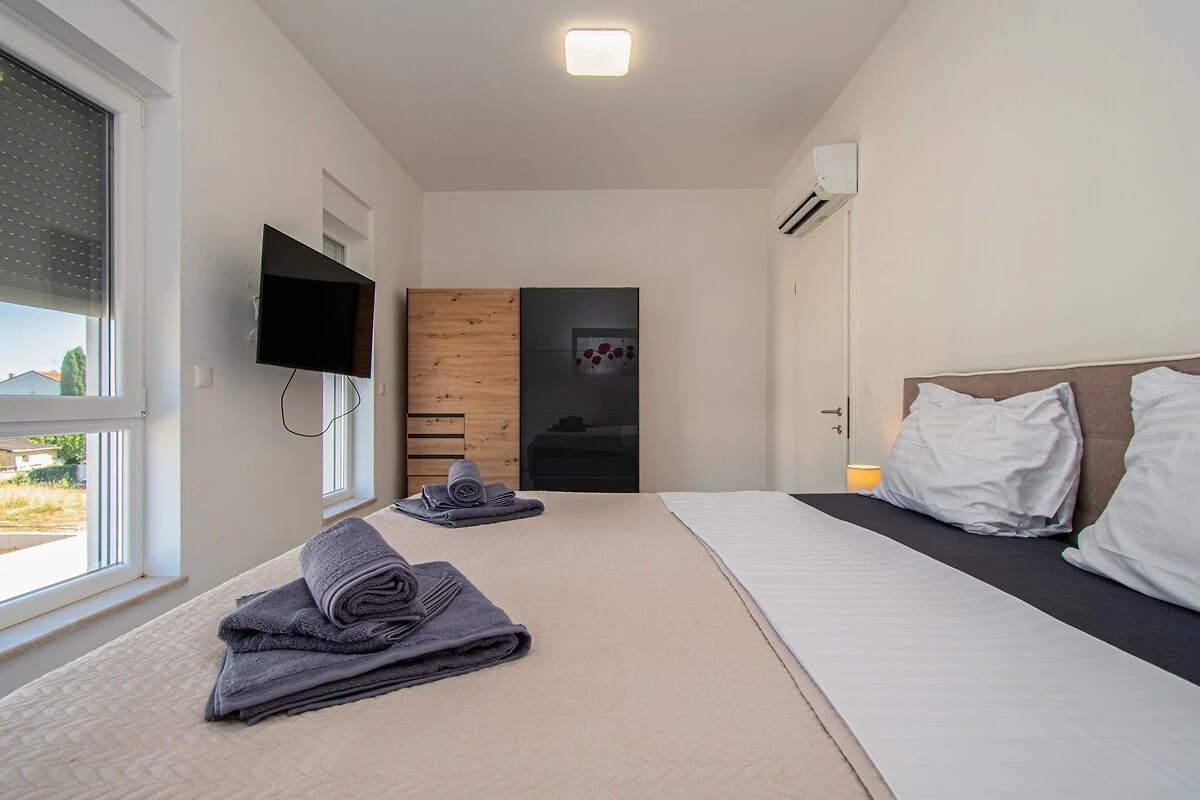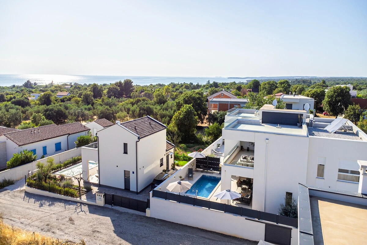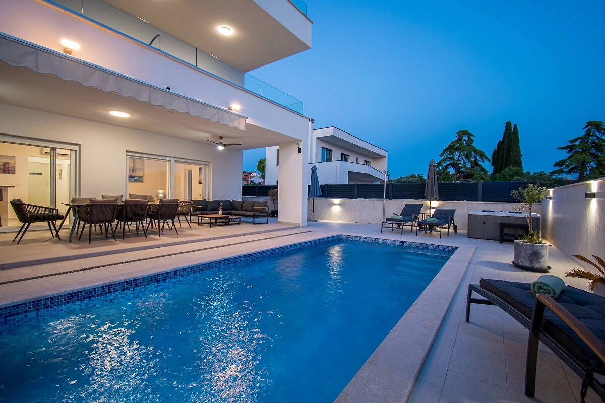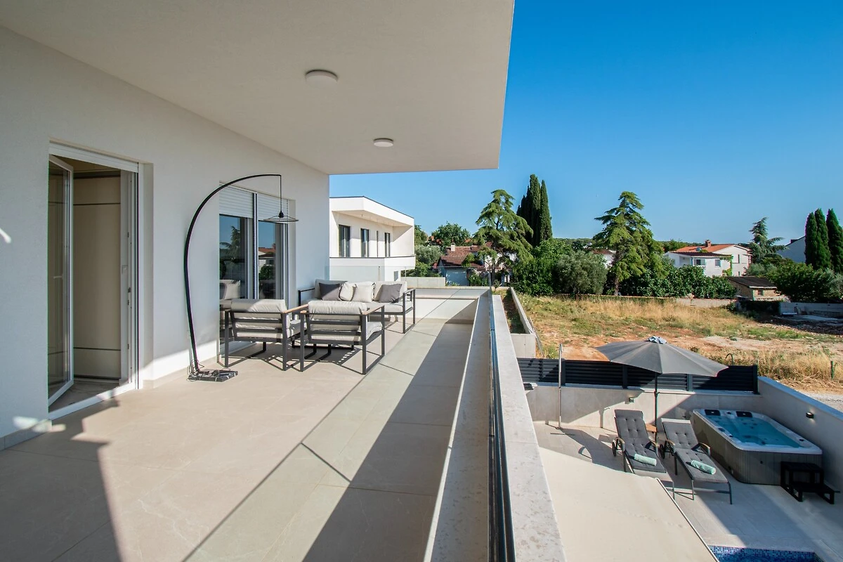 Das Ferienhaus Vila Nini House befindet sich in dem ruhigen Ort Peroj, unweit von Fažana, und ist die ideale Wahl für alle, die einen luxuriösen Urlaub in Meeresnähe mit herrlichem Blick auf den Nationalpark Brijuni verbringen möchten. Das Meer ist nur 500 Meter entfernt, und von den Balkonen sowie der großzügigen Dachterrasse genießen Sie einen atemberaubenden Blick auf das Meer und die Brijuni-Inseln.