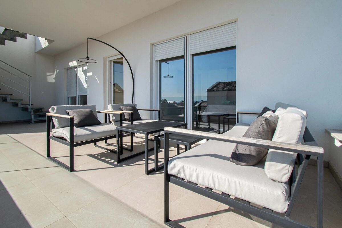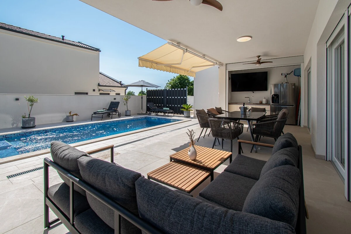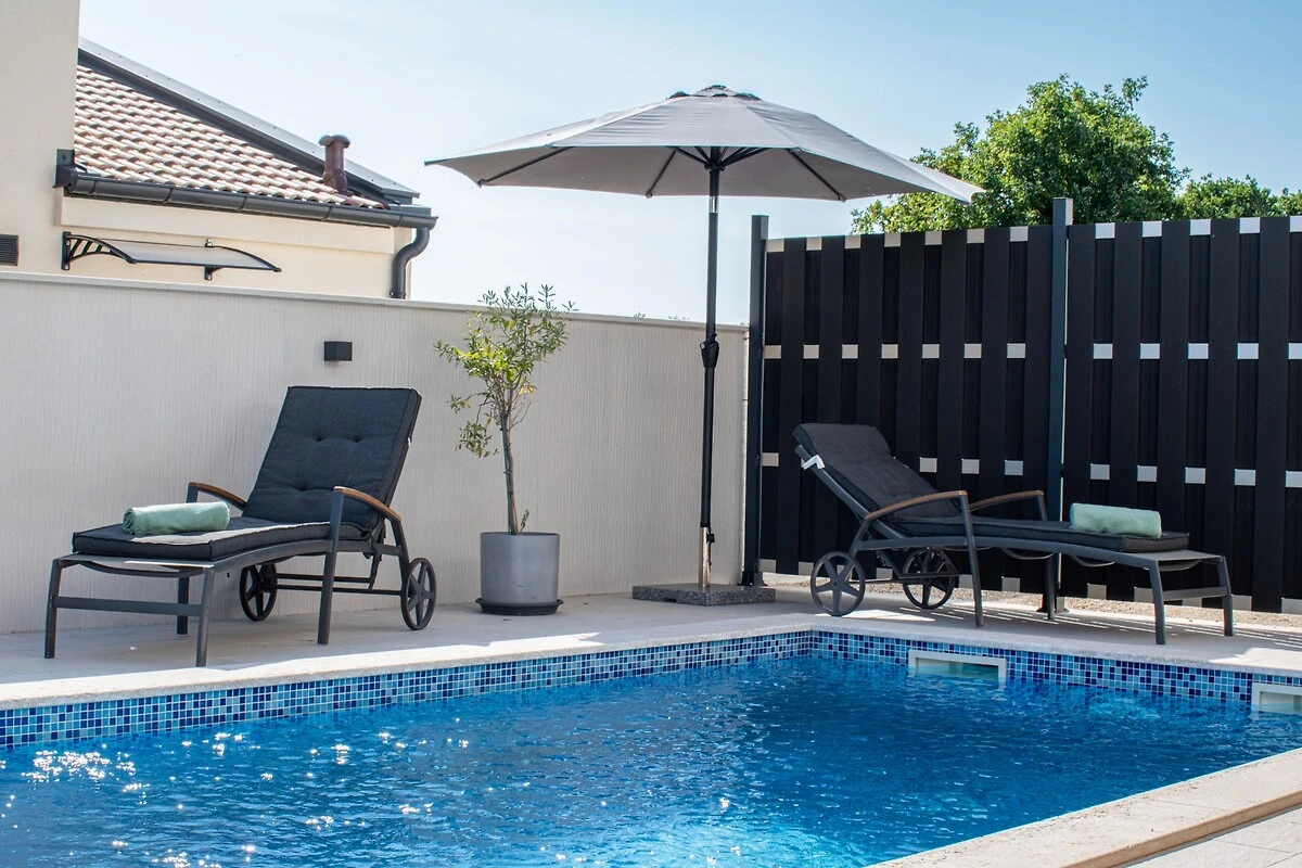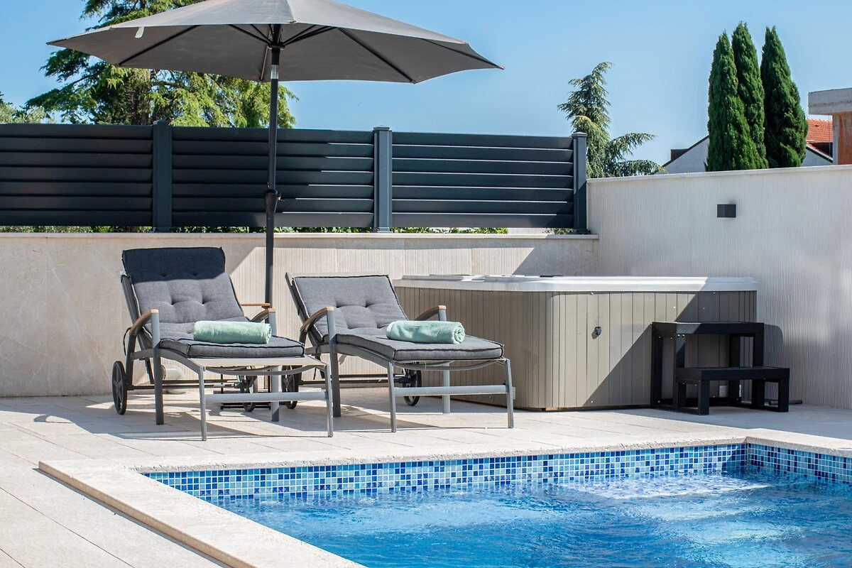 Die Villa verfügt über einen Außenpool, der auf Wunsch beheizt werden kann – ideal für einen Aufenthalt außerhalb der Hauptsaison. Für zusätzliche Entspannung sorgt der Jacuzzi, und bequeme Sonnenliegen stehen ebenfalls zur Verfügung. Die großzügige Terrasse ist mit einem großen Esstisch, Grill, Kühlschrank und einem großen TV ausgestattet – perfekt, um warme Abende gemeinsam mit Familie oder Freunden zu genießen.