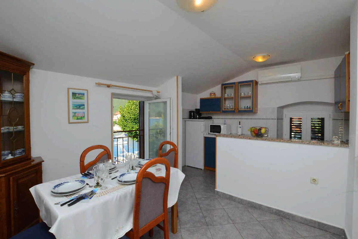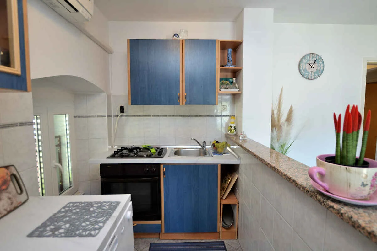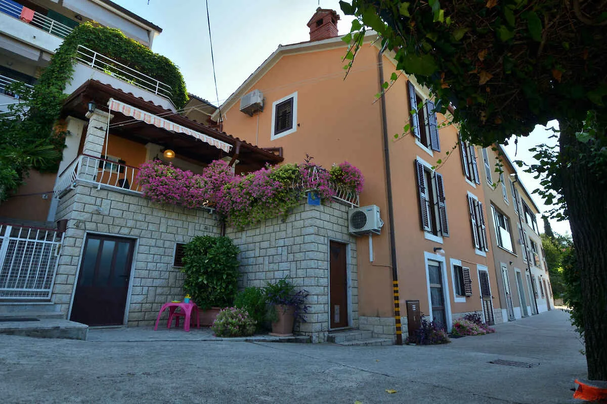 Rabac. Die Ferienwohnung befindet sich auf einem geschlossenen Gartengrundstück, von einem Zaun begrenzt. Der Vermieter wohnt im Haus. Die Zufahrt erfolgt über eine Nebenstrasse. Parkplatz auf der Strasse vor dem Haus.