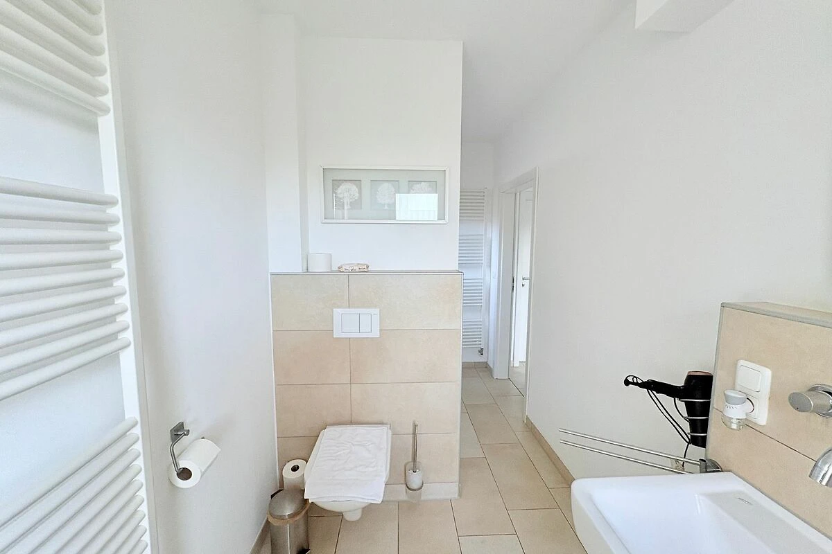 Das Badezimmer überzeugt mit Dusche und Badewanne die Dusche ist ebenerdig und damit auch für jeden bequem zugänglich. Ein Fön ist natürlich auch vorhanden.