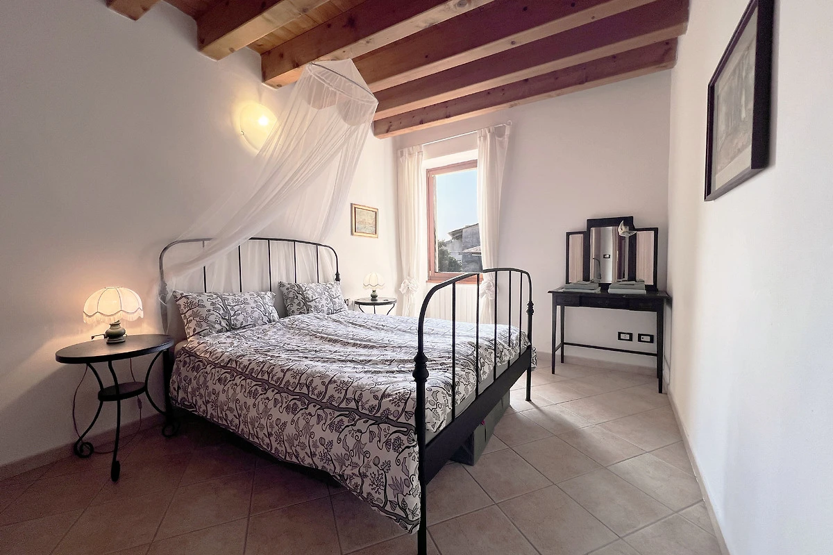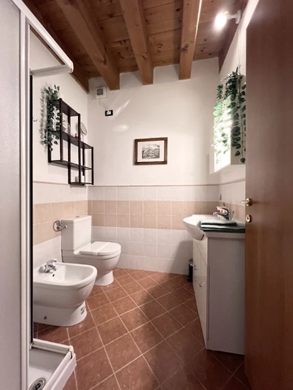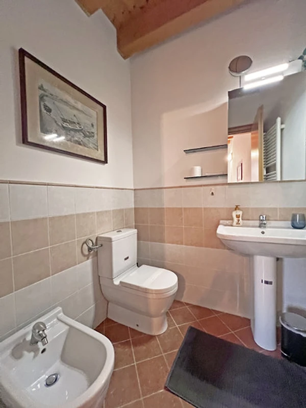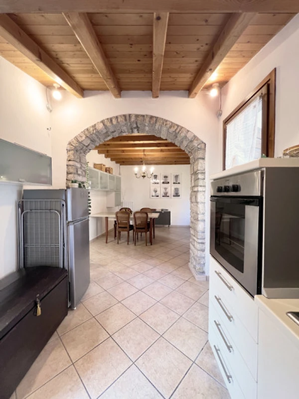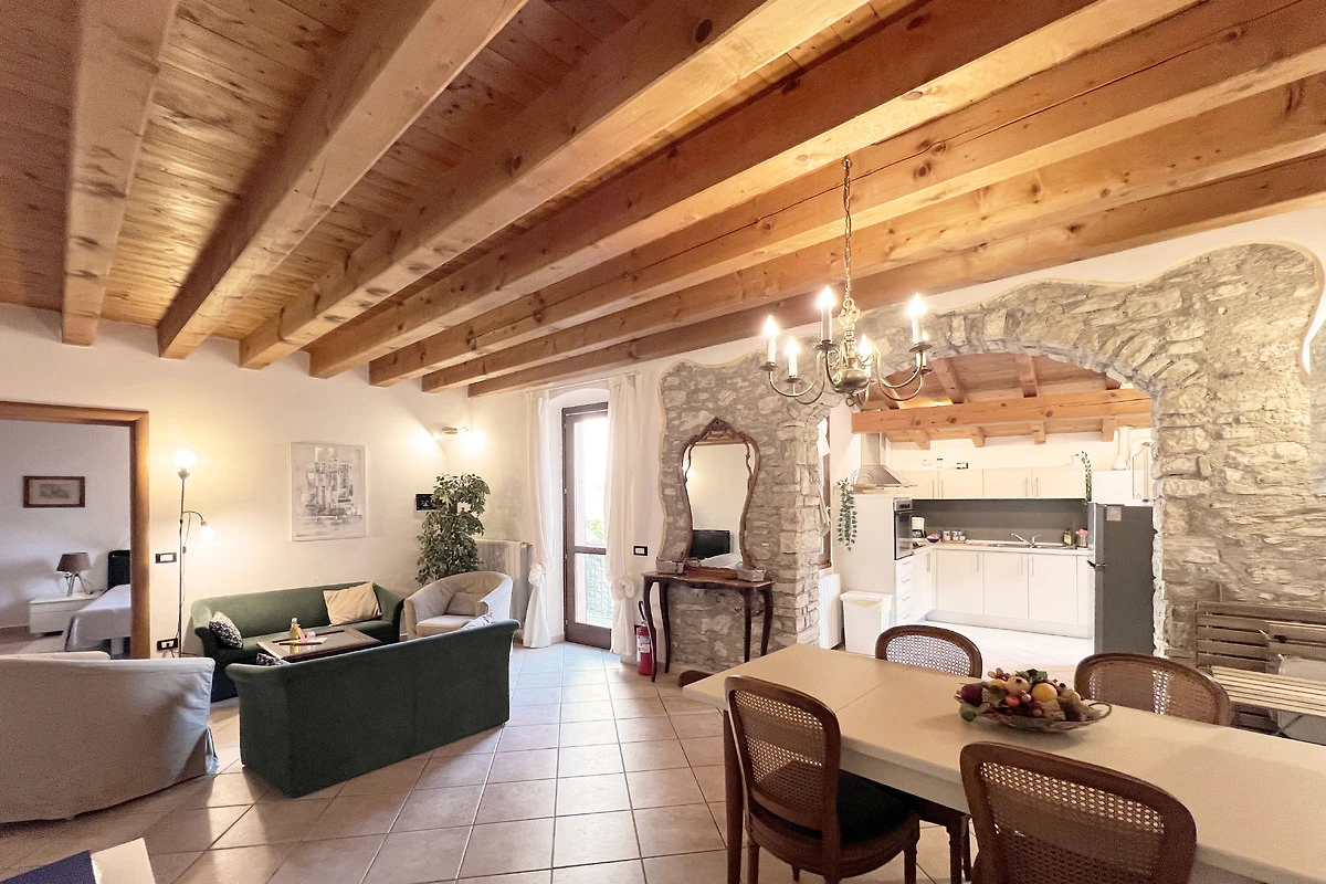Die rund 80 m² große Wohnung befindet sich auf einer Ebene in einem historischen Gebäude. Ein Schlafzimmer verfügt über ein eigenes Bad mit WC und Waschbecken. Das zweite Badezimmer ist über einen Flur sowohl vom zweiten Schlafzimmer als auch vom Wohnbereich aus zugänglich und mit WC, Bidet, Waschbecken und Dusche ausgestattet. Der großzügige Wohn- und Essbereich geht durch einen charakteristischen Steinbogen fließend in die Küche über. Die voll ausgestattete Küche verfügt über einen Kühlschrank, Gefrierschrank, Backofen, Wasserkocher, Toster, Kaffeemaschine und Moka – so können Sie sich jederzeit selbst versorgen. Ein Balkon mit darunterliegender, exklusiver Terrasse bietet zusätzlichen Außenraum zum Entspannen.