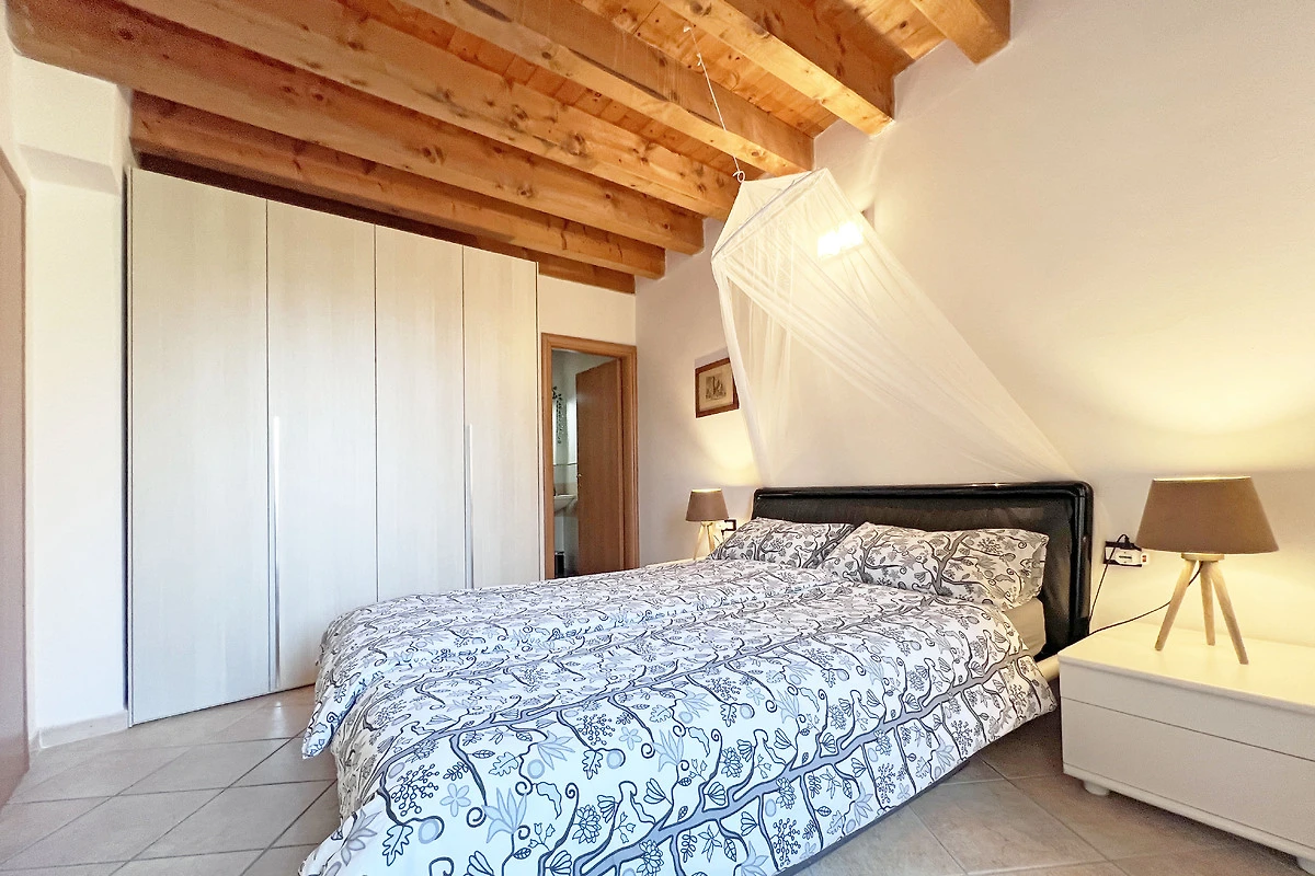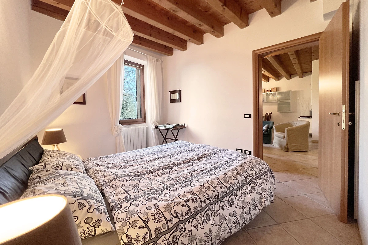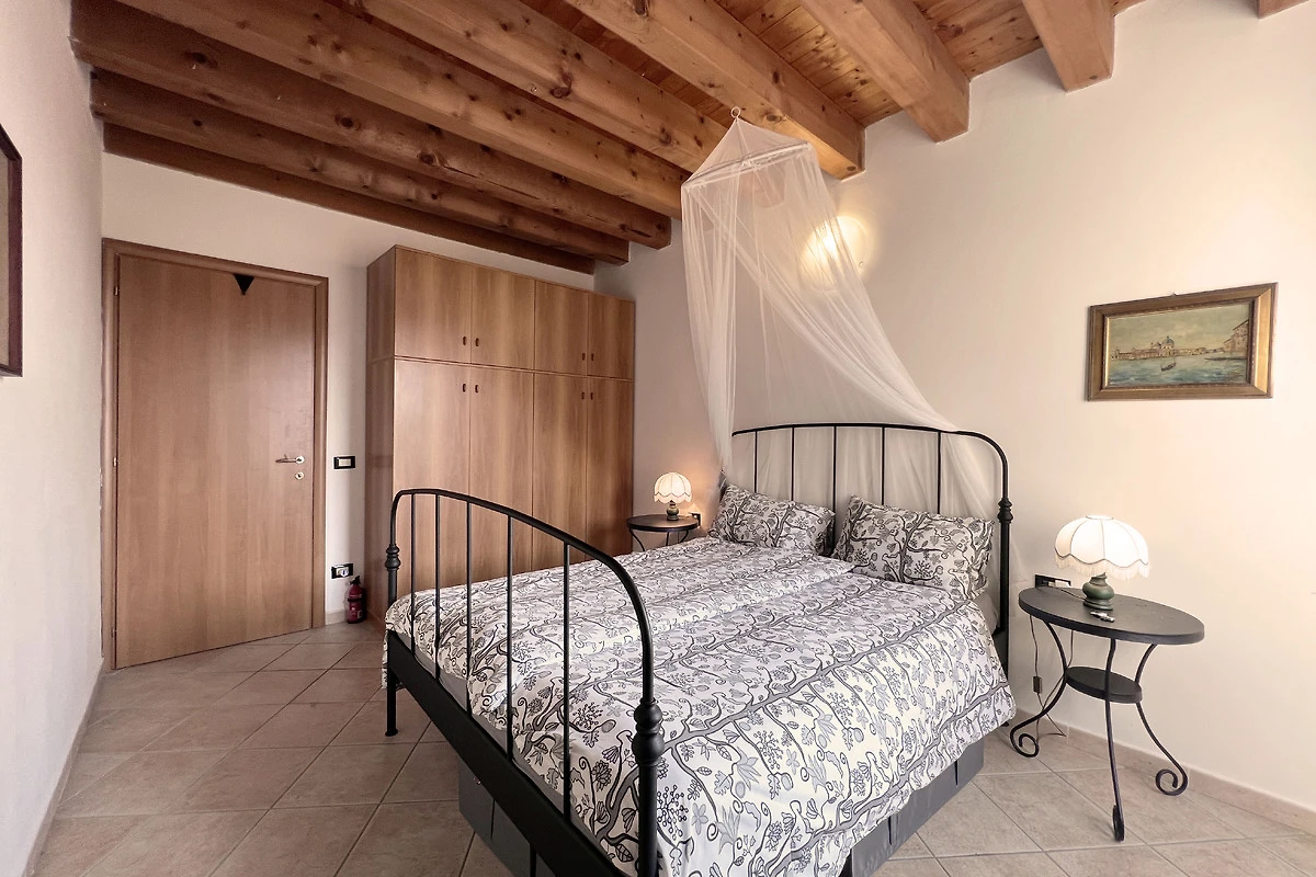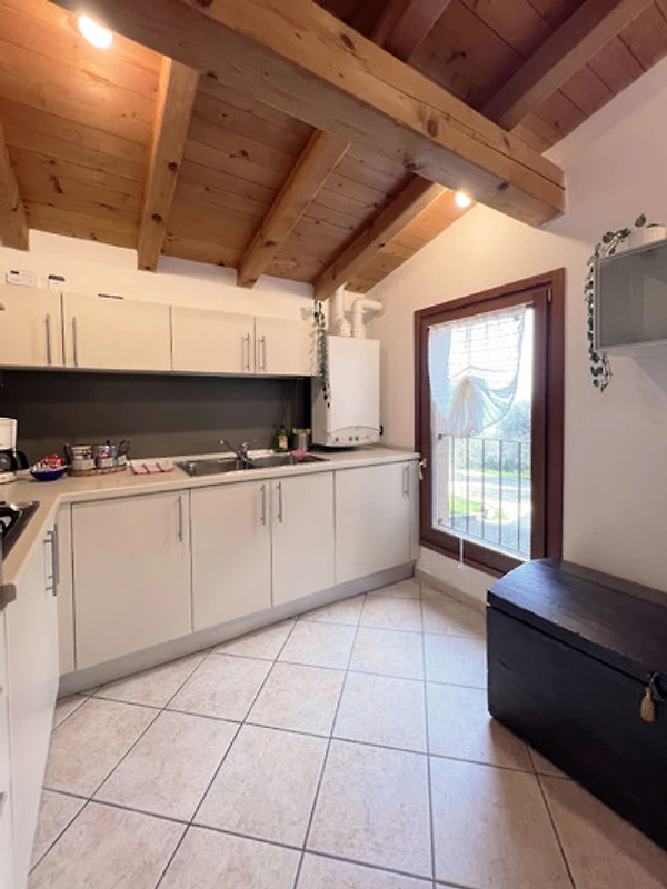 Die rund 80 m² große Wohnung befindet sich auf einer Ebene in einem historischen Gebäude. Ein Schlafzimmer verfügt über ein eigenes Bad mit WC und Waschbecken. Das zweite Badezimmer ist über einen Flur sowohl vom zweiten Schlafzimmer als auch vom Wohnbereich aus zugänglich und mit WC, Bidet, Waschbecken und Dusche ausgestattet. Der großzügige Wohn- und Essbereich geht durch einen charakteristischen Steinbogen fließend in die Küche über. Die voll ausgestattete Küche verfügt über einen Kühlschrank, Gefrierschrank, Backofen, Wasserkocher, Toster, Kaffeemaschine und Moka – so können Sie sich jederzeit selbst versorgen. Ein Balkon mit darunterliegender, exklusiver Terrasse bietet zusätzlichen Außenraum zum Entspannen.
