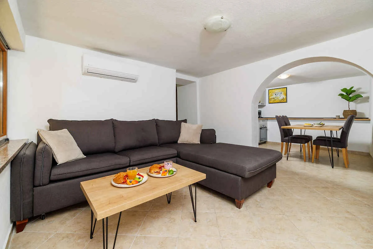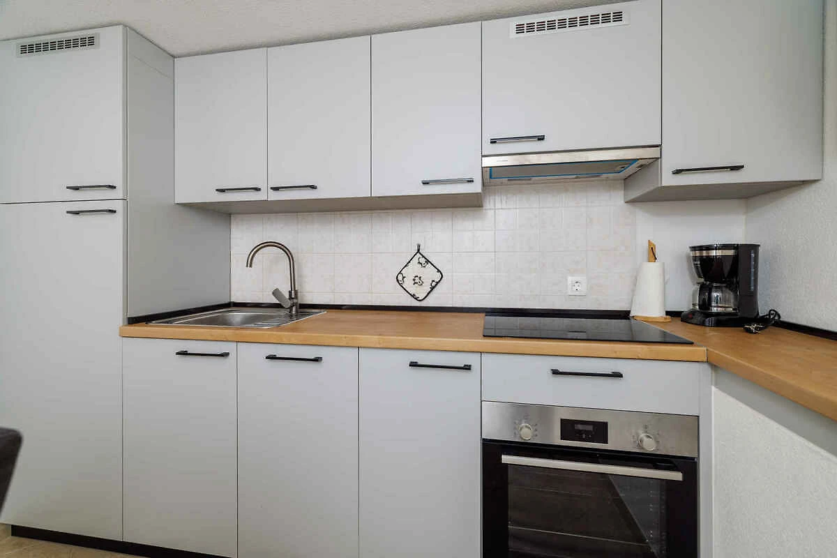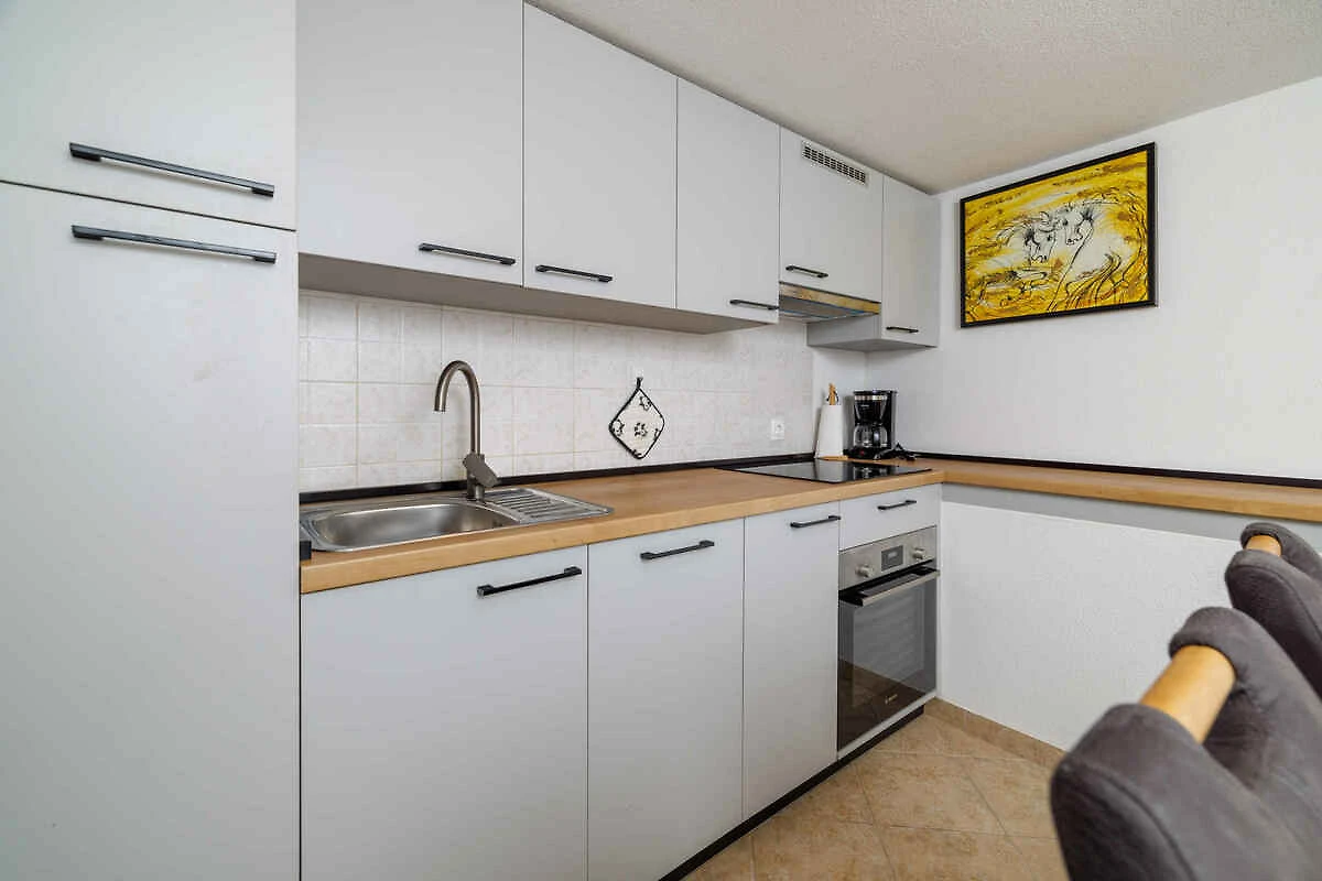 Wohnzimmer mit 2 Zusatzbetten auf Couch/Sofa, TV und Zugang zur Terrasse. Schlafzimmer mit 1 Doppelbett. Kochnische mit Gasherd, Geschirrspüler, Kühlschrank (Eisfach) und Kaffeemaschine. Bad mit Dusche, WC und Föhn.
