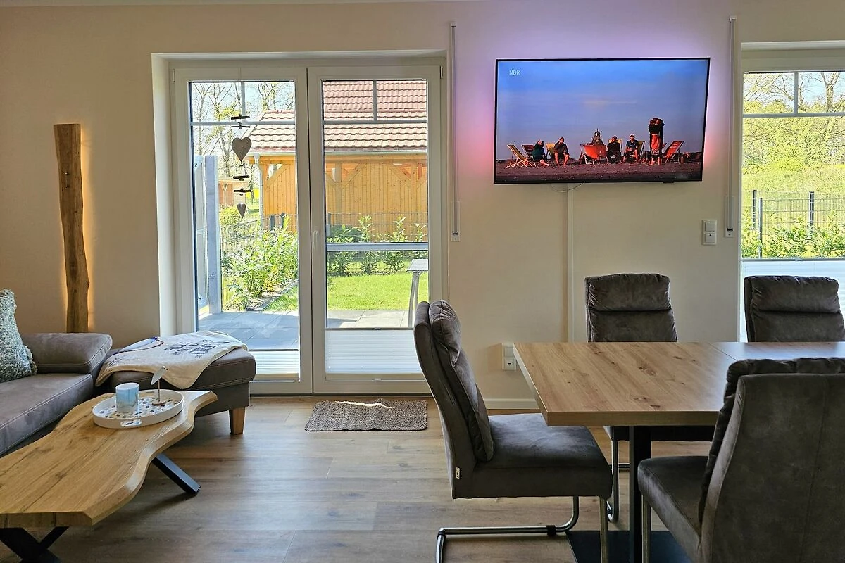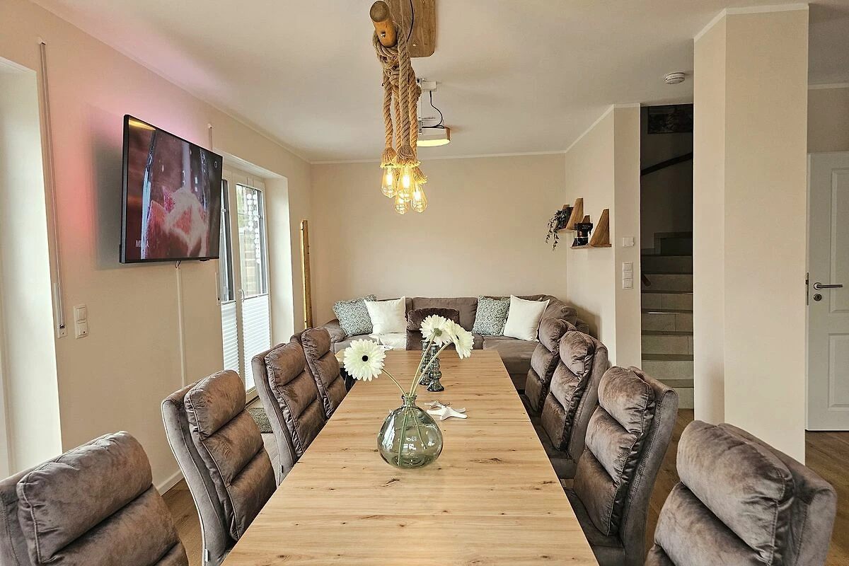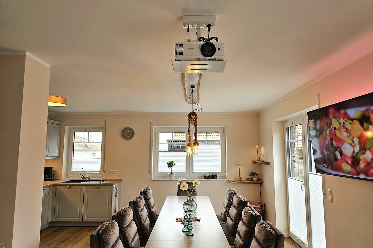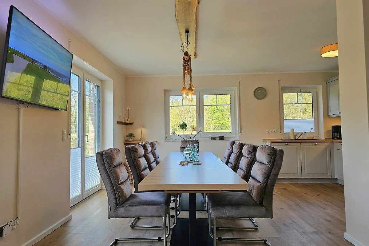 Die beiden modernen und offenen Küchen des Ferienhauses sind jeweis voll ausgestattet und lassen keine Wünsche offen. Sie verfügen jeweils über einen Herd, eine Mikrowelle, einen Kühlschrank mit Gefrierfach, eine Spülmaschine, eine Doppelheißluftfriteuse, sowie zahlreiche Küchenutensilien. Der Essbereich in unmittelbarer Nähe lädt Sie ein, gemeinsam zu kochen, beisammen zu sein und zu klönen. Genießen Sie Ihre Freizeit mit den vorhandenen Spielen und Büchern oder schauen Sie einen Film auf einem der 6 Smart-TV, die über Satellitenanschluss verfügen.