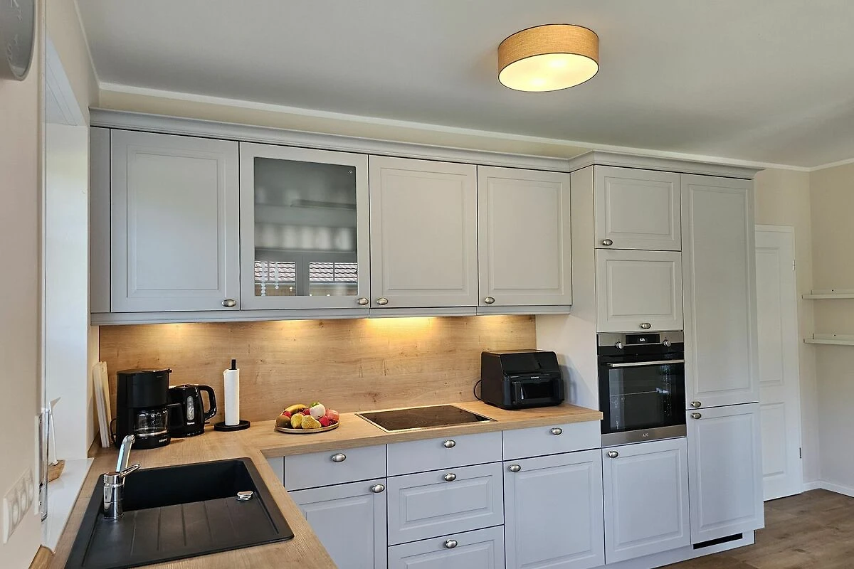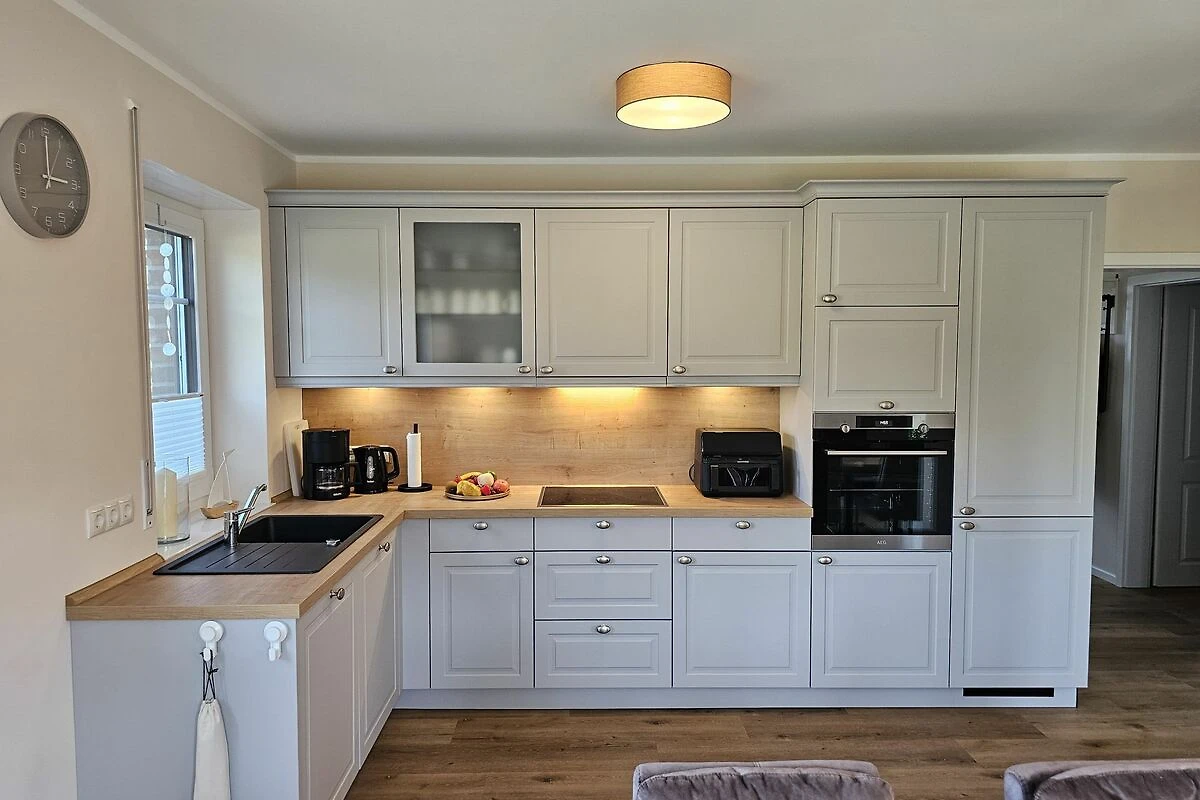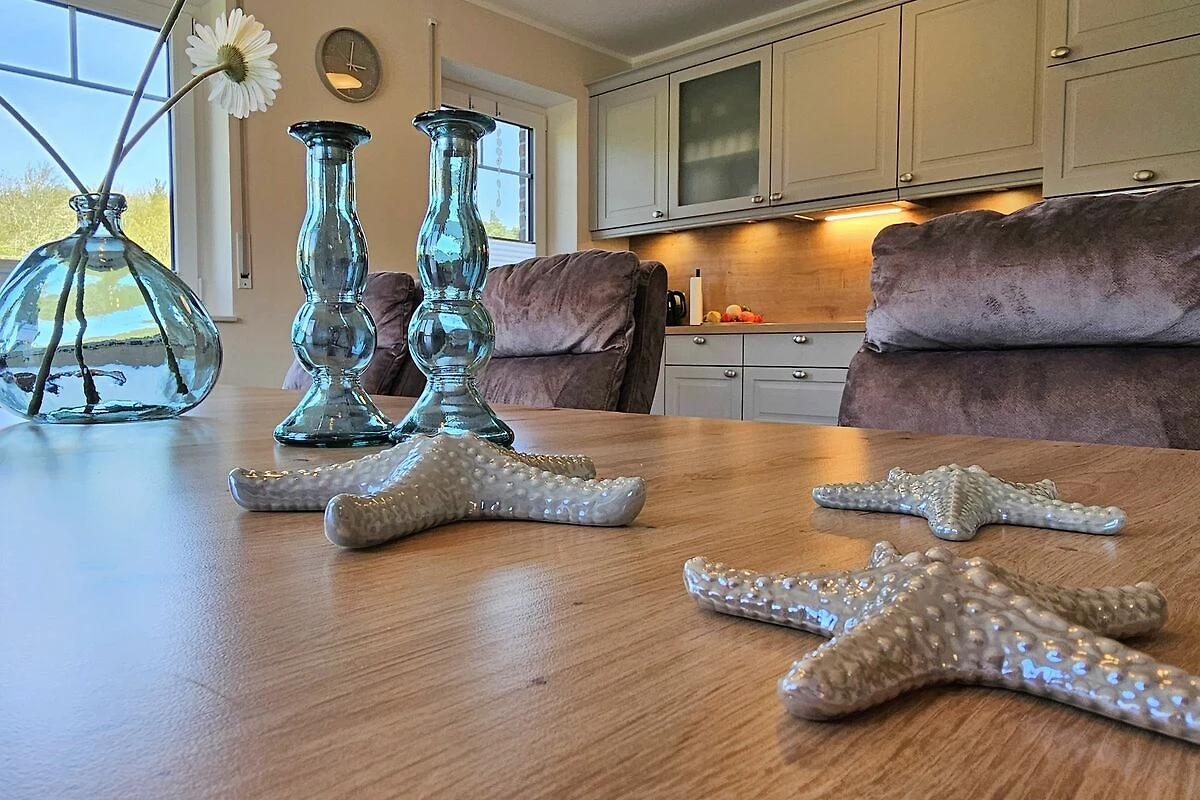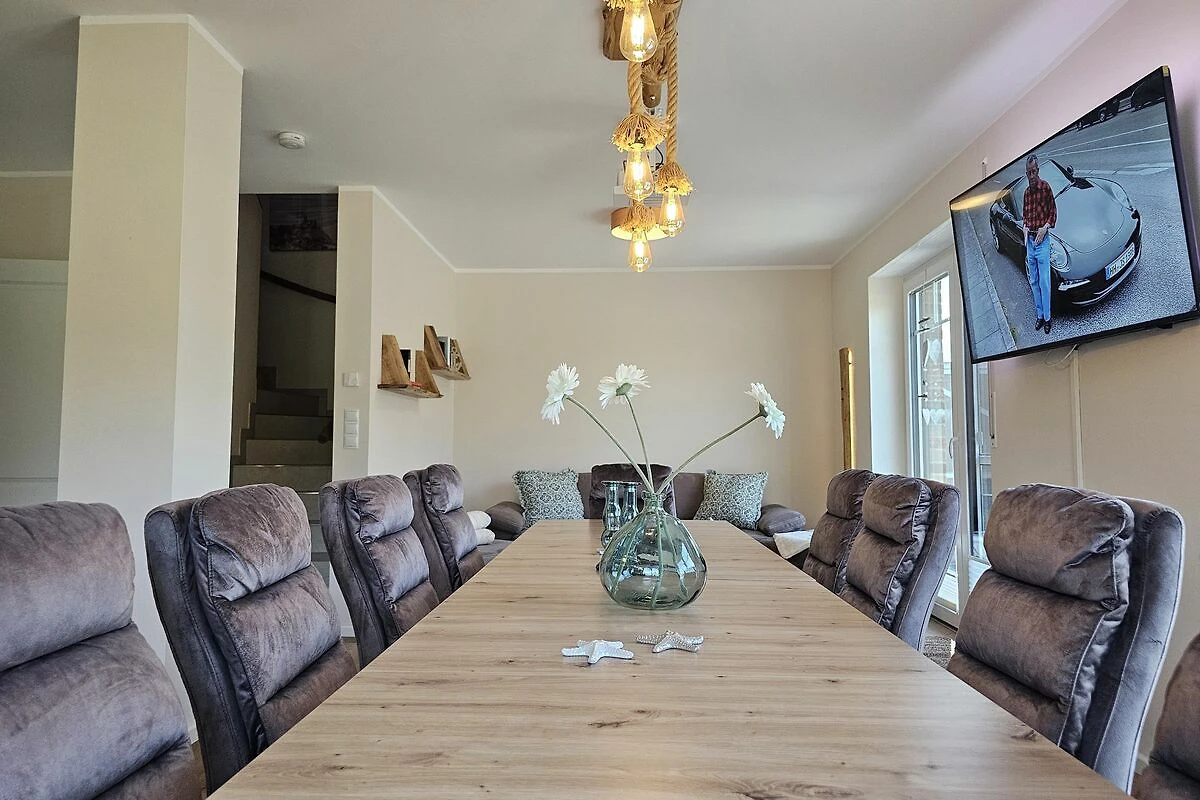 Die beiden modernen und offenen Küchen des Ferienhauses sind jeweis voll ausgestattet und lassen keine Wünsche offen. Sie verfügen jeweils über einen Herd, eine Mikrowelle, einen Kühlschrank mit Gefrierfach, eine Spülmaschine, eine Doppelheißluftfriteuse, sowie zahlreiche Küchenutensilien. Der Essbereich in unmittelbarer Nähe lädt Sie ein, gemeinsam zu kochen, beisammen zu sein und zu klönen. Genießen Sie Ihre Freizeit mit den vorhandenen Spielen und Büchern oder schauen Sie einen Film auf einem der 6 Smart-TV, die über Satellitenanschluss verfügen.