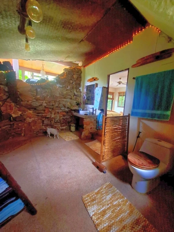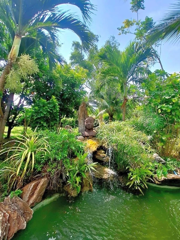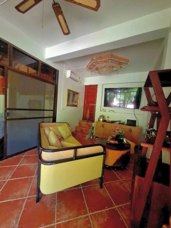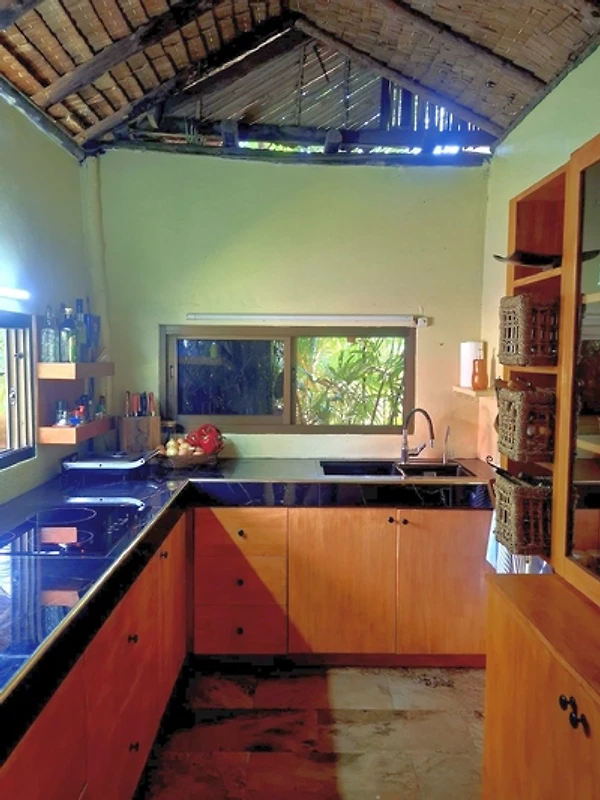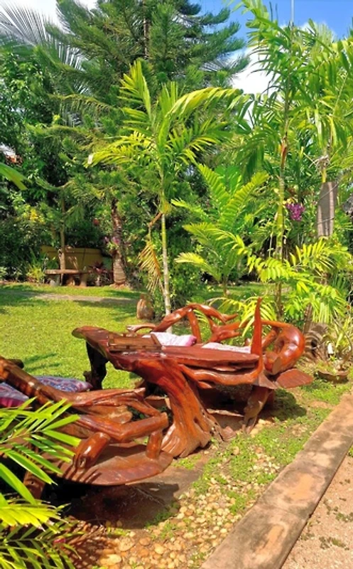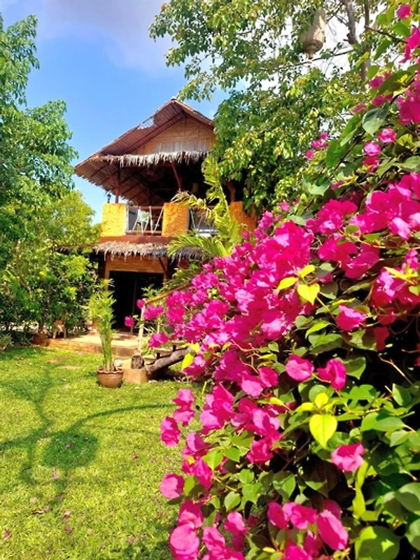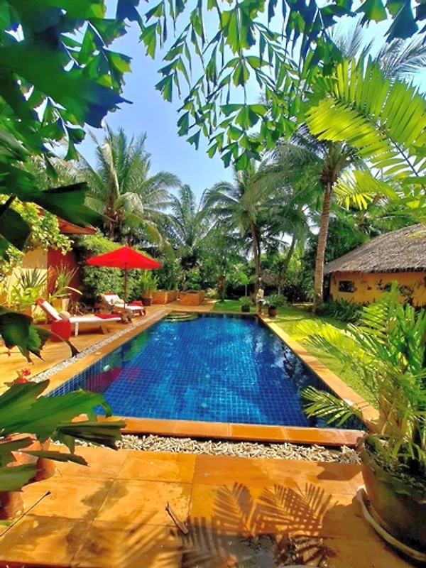 Willkommen im Jungle House Beatrix in Samroiyot – Ihr Rückzugsort für zwei Personen, eingebettet in eine tropische Gartenlandschaft mit duftenden Blüten, Palmen und einem kleinen Wasserlauf. Genießen Sie entspannte Stunden auf der großzügigen Terrasse oder erfrischen Sie sich im einladenden Swimmingpool, umgeben von üppiger Vegetation. Für kulinarische Erlebnisse steht Ihnen eine komplett ausgestattete Küchenzeile mit Mikrowelle, Wasserkocher, Kaffeemaschine und allen nötigen Utensilien zur Verfügung. Ein BBQ-Grill lädt zu geselligen Abenden unter freiem Himmel ein.