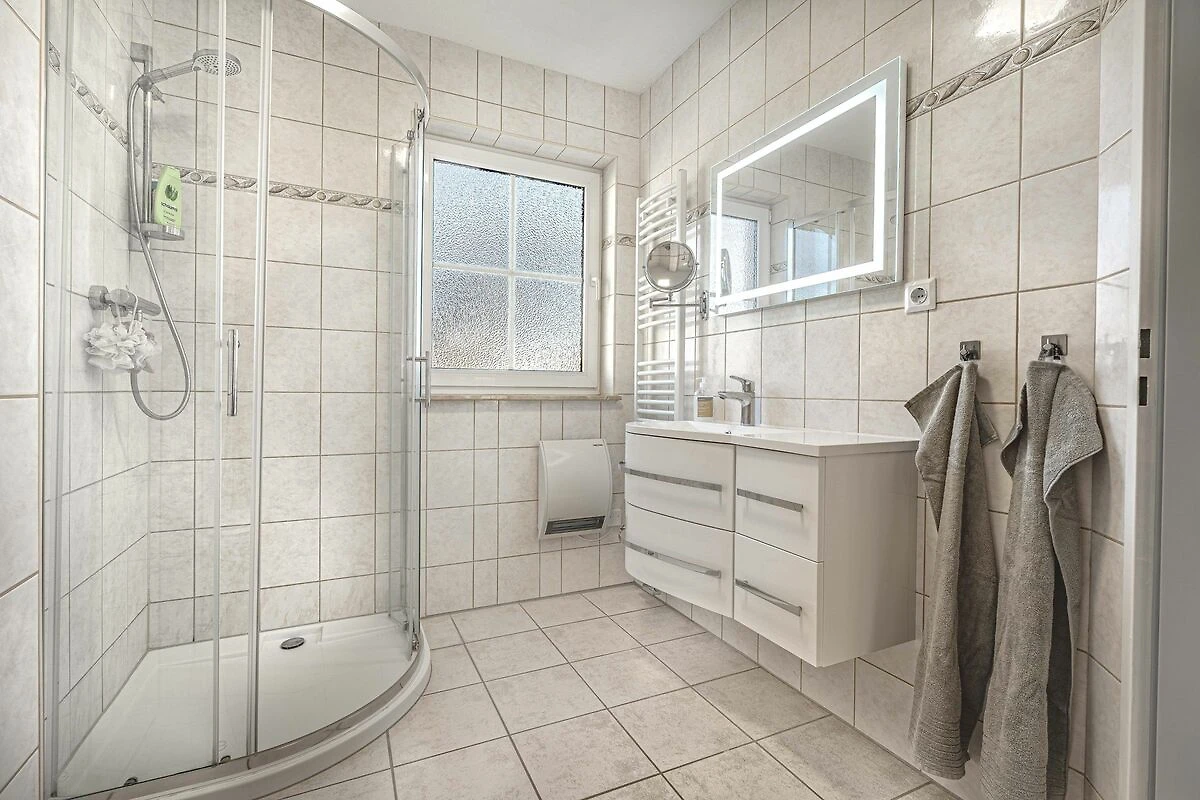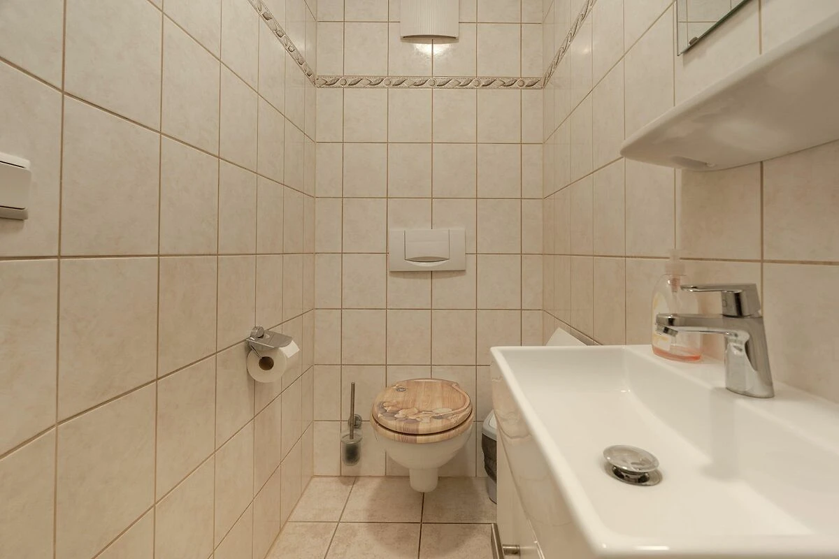 Im Badezimmer finden Sie eine Dusche, Waschbecken, WC, Haartrockner, Spiegel und Kosmetikspiegel. Zusätzlich steht Ihnen ein separates Gäste-WC zur Verfügung. Die Schlafzimmer sind mit Laminat ausgelegt, im Wohnzimmer sorgen Fliesen für eine pflegeleichte und angenehme Atmosphäre. Fliegengitter, Sichtschutz an allen Fenstern, Rauchmelder, Staubsauger und Wäscheständer ergänzen die praktische Ausstattung.