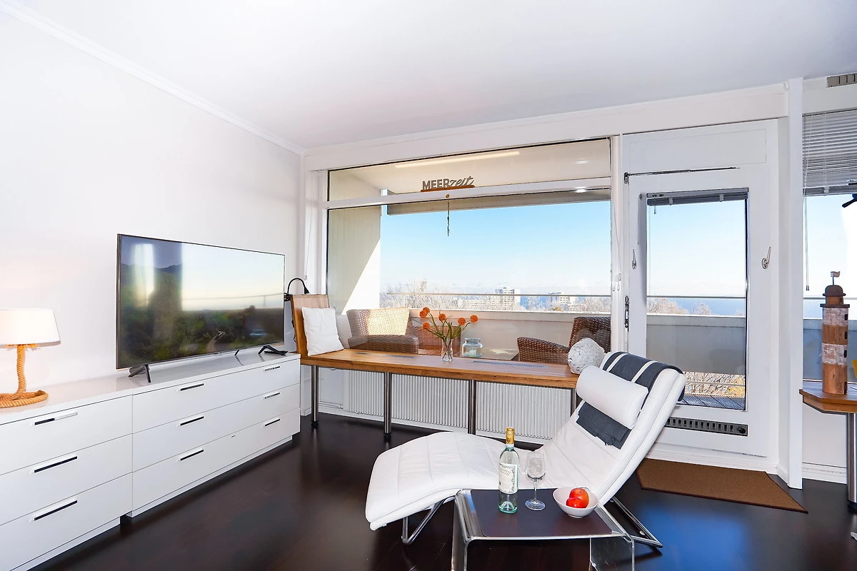 Ostseeblick Unsere Ferienwohnung liegt im ruhigen Ostseeort Sierksdorf mit Blick über die Lübecker Bucht. Wer Fun und Action haben möchte, kann dies im fussläufig zu erreichenden Hansapark (von Anfang April bis Ende Oktober geöffnet) erleben. Mit dem Rad lassen sich die umliegenden Ostseeorte und das traumhafte Hinterland erkunden. Unsere Ferienwohnung (barrierefrei) befindet sich in der 6. Etage und hat einen herrlichen Blick über die Ostsee. Sie ist problemlos mit dem Fahrstuhl zu erreichen und bietet auf 1,5 Zimmer Platz für max. vier Personen. Der Strand liegt nur 500 Meter entfernt. Das Appartement (Nichtraucher und keine Haustiere) ist voll - inkl. WLAN und Festnetztelefon - ausgestattet und bietet auf 50 qm ausreichend Platz für max. 4 Personen. Der Anlage ist nur ca. 500 Meter vom Sierksdorfer Ostseestrand entfernt. Ein Parkplatz auf dem Oberdeck steht zur Verfügung. Ein Wäschepaket (Bettwäsche EUR 18,00, Handtuchpaket EUR 17,00) kann pro Person gebucht werden. Der offen gestaltete Wohnraum verfügt über ein komfortables Eck-/Schlafsofa , von welchem Sie den tollen Ausblick auf die Lübecker Bucht geniessen können. Die zum Wohnzimmer offene Küche mit Essbereich ist voll ausgestattet und lädt zum verweilen ein. Auch von hier haben Sie einen herrlichen Blick auf das Meer. Das Badezimmer mit Wanne und WC ist komfortabel ausgestattet. Im kleinen Schlafzimmer schlafen Sie bequem mit 2 Personen. Bei einem kalten oder heissen Getränk geniessen Sie den wundervollen Blick auf die Bucht.